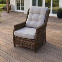 Специальный механизм «реклайнер» позволяет регулировать наклон спинки, обеспечивая максимально удобное положение для чтения, отдыха или послеобеденного сна. Мягкие подушки сиденья с наполнителем из пенополиуретана и холлофайбера дарят непревзойдённый комфорт. Чехлы подушек выполнены из водоотталкивающей ткани олефин коричневого цвета — они легко снимаются для чистки, что особенно практично при использовании на открытом воздухе.