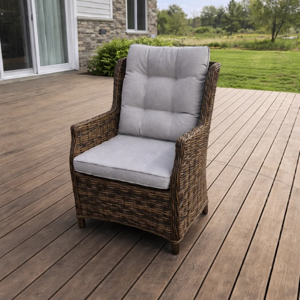 Мягкие подушки сиденья с наполнителем из пенополиуретана и холлофайбера обеспечивают максимальный комфорт. Чехлы подушек выполнены из водоотталкивающей ткани олефин коричневого цвета — они легко снимаются для чистки. Эргономичная спинка и подлокотники создают расслабляющую посадку, позволяя наслаждаться отдыхом на свежем воздухе.