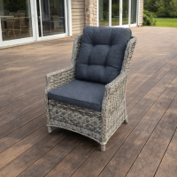Мягкие подушки сиденья с наполнителем из пенополиуретана и холлофайбера обеспечивают максимальный комфорт. Чехлы подушек выполнены из водоотталкивающей ткани олефин серого цвета — они легко снимаются для чистки. Эргономичная спинка и подлокотники создают расслабляющую посадку, позволяя наслаждаться отдыхом на свежем воздухе.