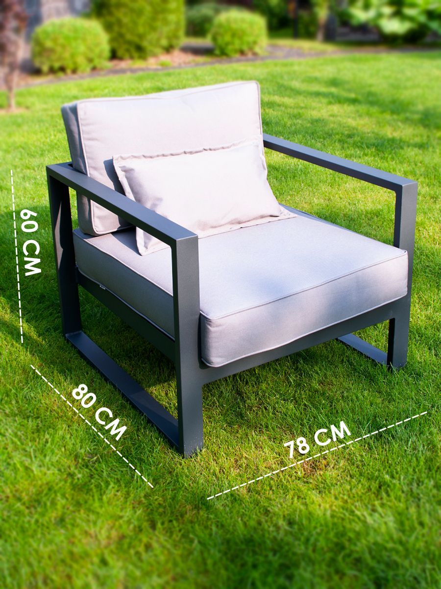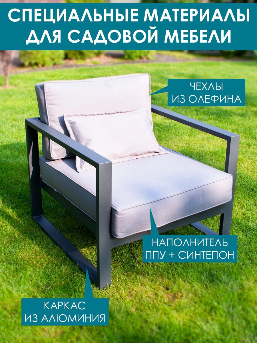 Кресло Callisto giardino "Лагуна" ( с двумя подлокотниками). Каркас: алюминий, окрашенный в цвет антрацит. Размеры кресла ШхВхГ 780х600х800 мм. Размеры подушек: для сиденья ШхВхГ660х120х800 мм; Вес: 3 кг. Подушка под спину 660х390 мм. Вес 1,8 кг. Ткань оксфорд, устойчива к истиранию, выгоранию на солнце, влагоотталкивающая. Наполнитель: многослойный формованный ППУ различной плотности, синтепон и спанбонд. Чехлы подушек на молнии. Вес каркаса: 9,2 кг. Продукция поставляется в собранном виде (кресло + 3 подушки). Нагрузка до 120 кг. Гарантия: 12 месяцев.