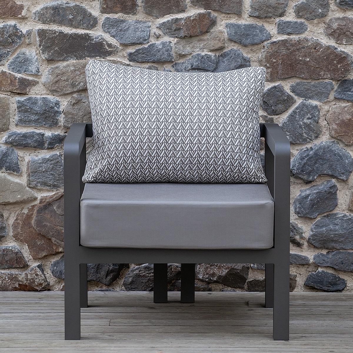 Большая подушка темно-серого цвета обеспечивает глубокую посадку, размеры 64х74х16 см, подушка под спину с геометрическим принтом, позволяют с комфортом провести время, размеры 62х44х20 см. В мебельных чехлах установлена молния, при необходимости их можно снять и почистить.