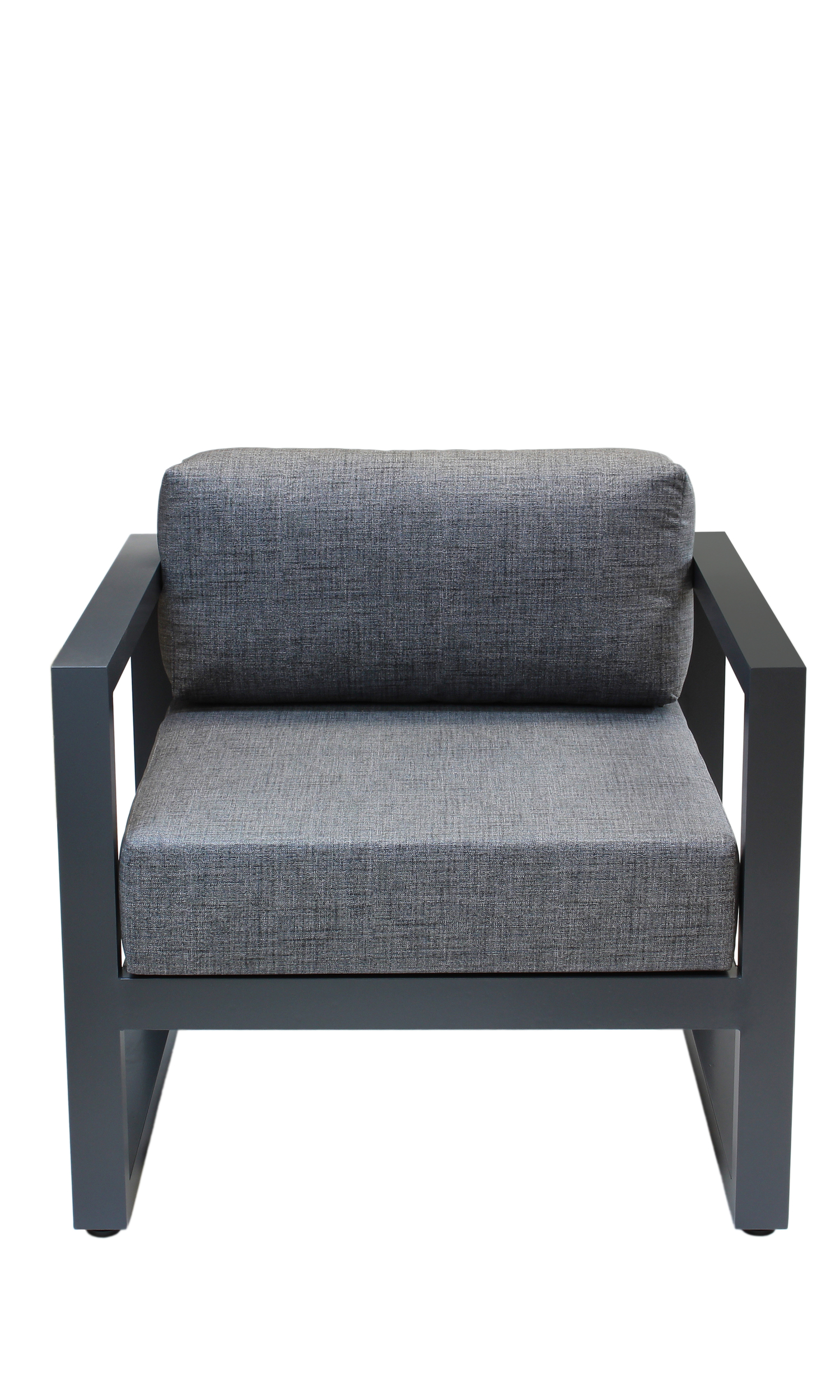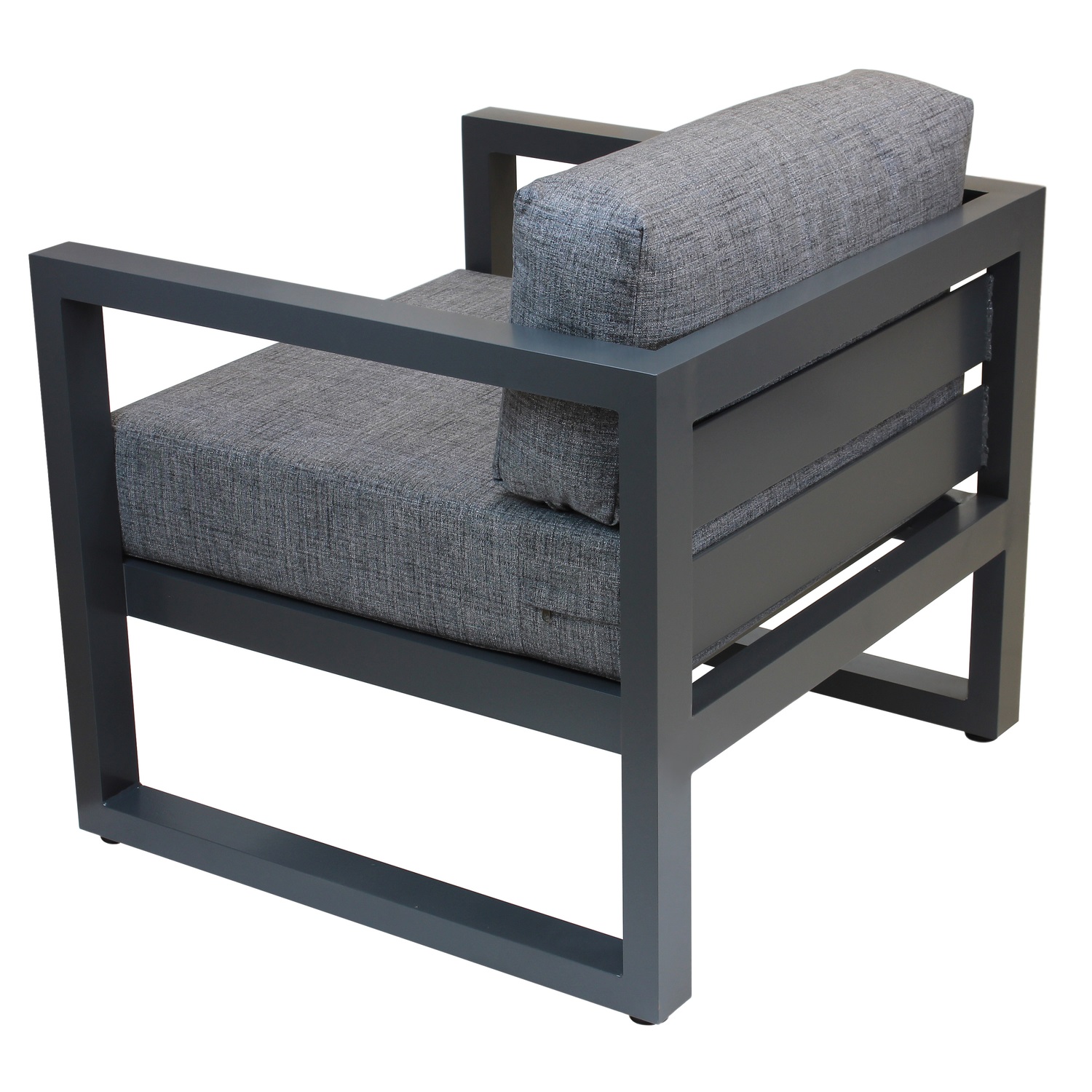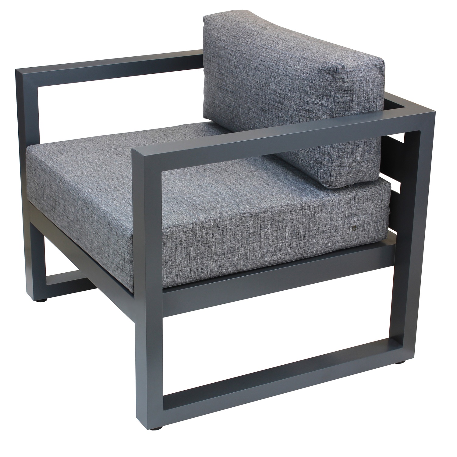 Габариты кресла с подушками 800х755х770 мм, габариты каркаса 800х755х665 мм. Каркас изготовлен из алюминия с толщиной стенок 3 мм. 2 подушки, размеры 665х700х150 и 665х190х300 мм; съёмные внешние чехлы из рогожки темно-серого оттенка, 100% полиэстер. Набивка большей подушки поролон, подушка для спины набита синтепоном, обе упакованы в несъёмный чехол из спанбонда. Регулируемые ножки с пластиковым основанием. Высота от пола до сидения (металл) 320 мм. Максимальная нагрузка на кресло 150 кг.