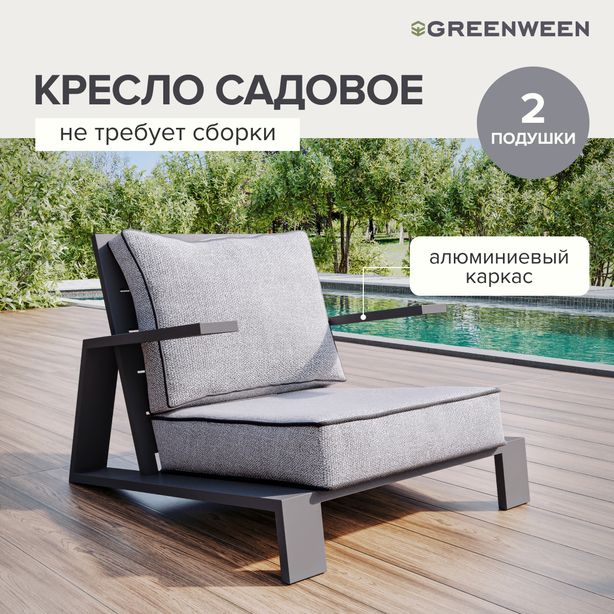 Каркас кресла изготовлен из алюминиевой профильной трубы 100х25 мм и 40х25 мм. Металлическое основание с матовым полимерным покрытием отличается повышенной прочностью, устойчивостью к царапинам. Современное производство Greenween гарантирует надежность и эстетику сварных швов металлической мебели.