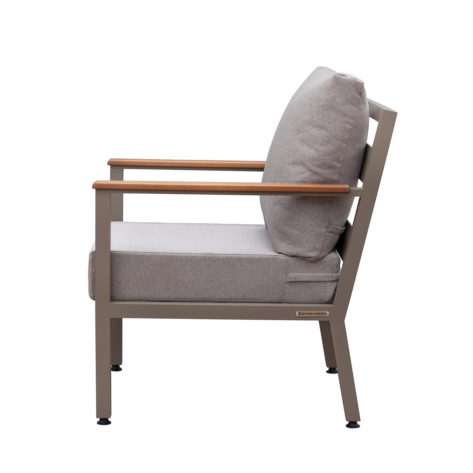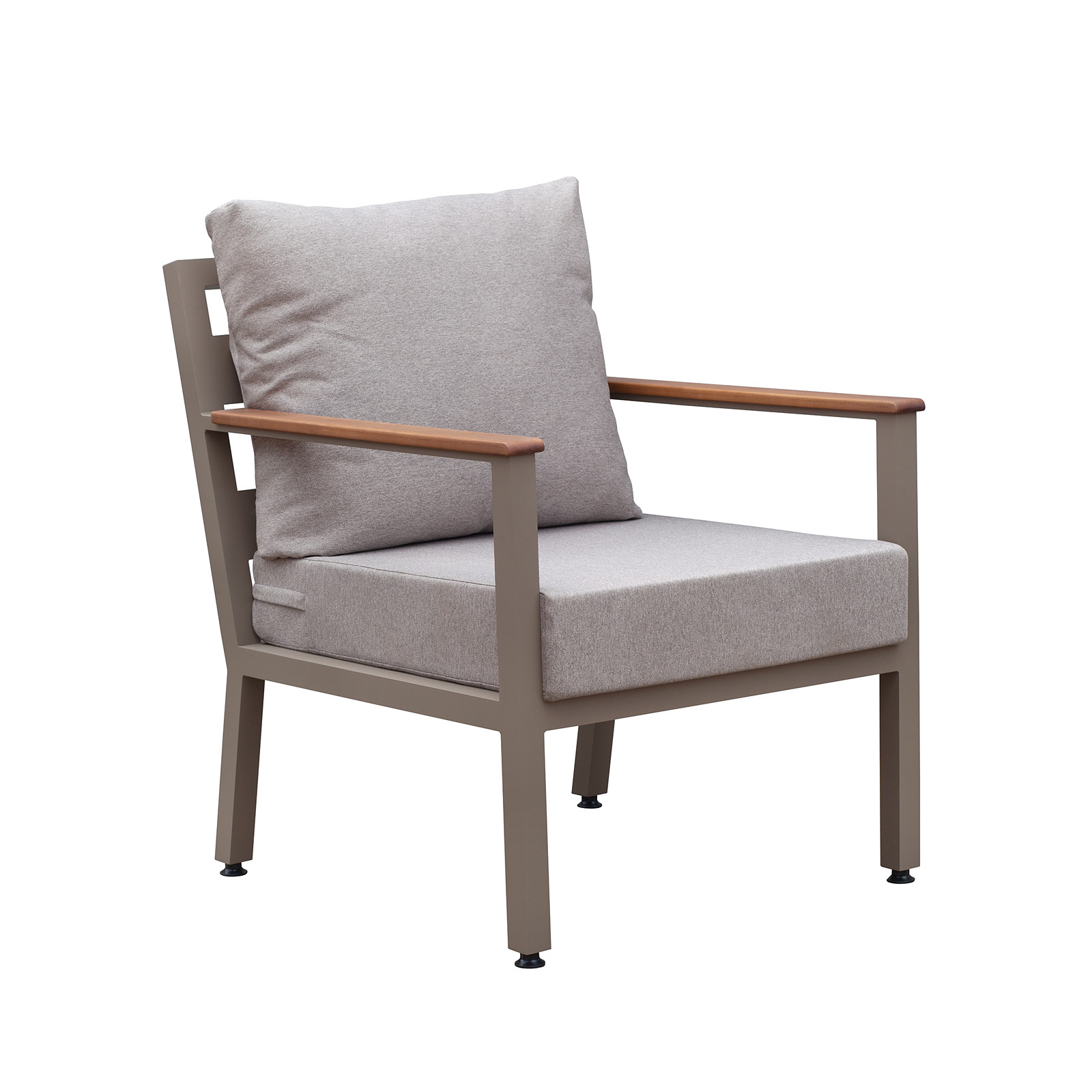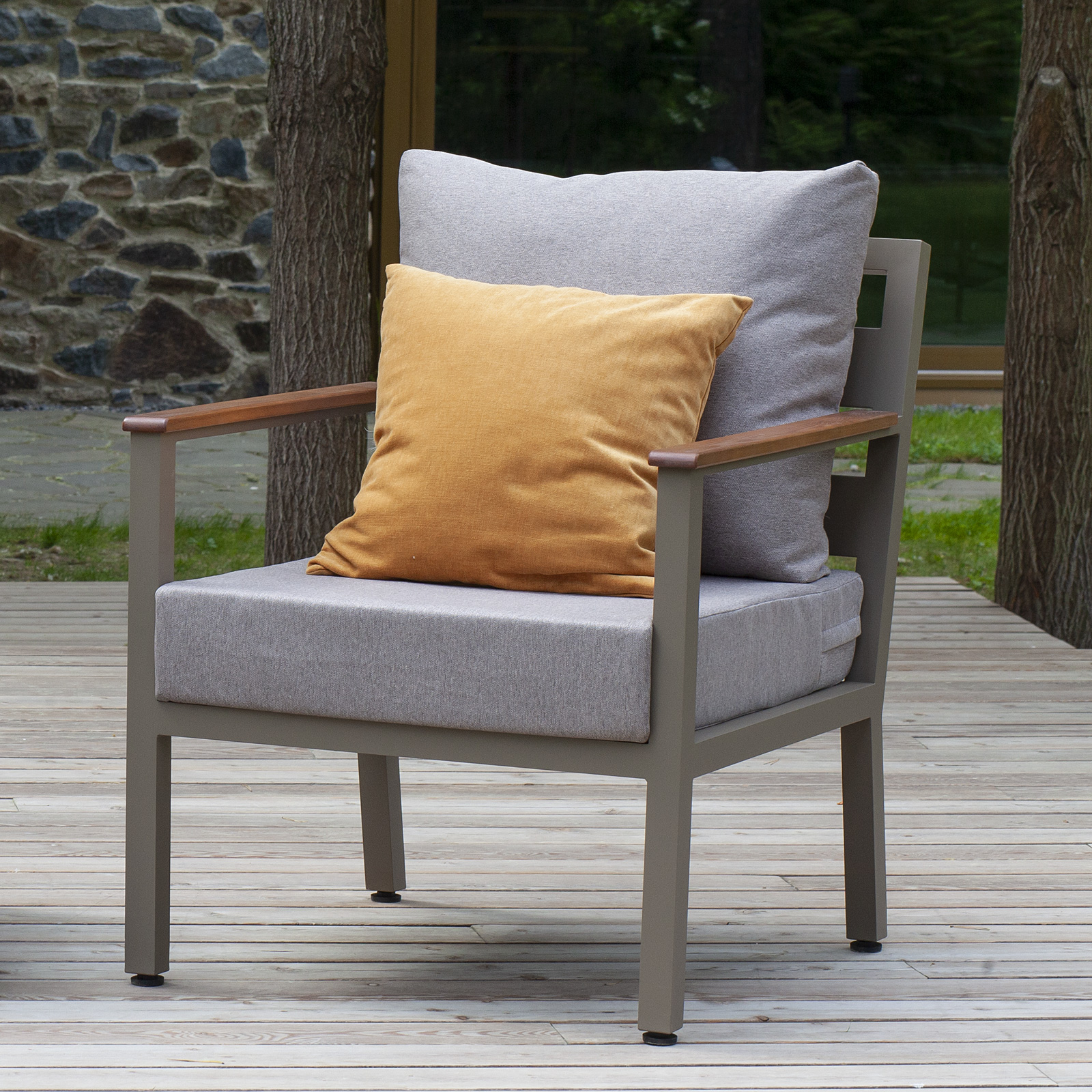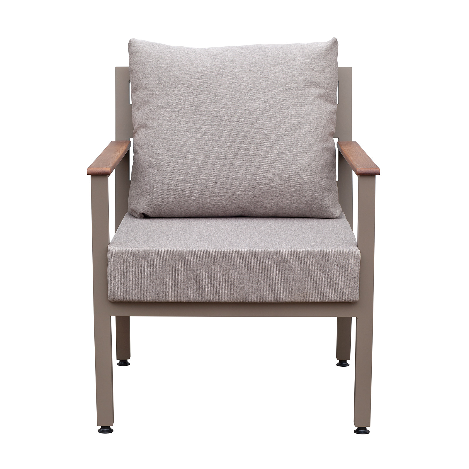 Уличное кресло из коллекции мебели SANTORINI сочетает в себе элегантный дизайн, комфорт и долговечность. Легкий алюминиевый каркас дополняют 2 удобные подушки со съемными чехлами. Садовое кресло с деревянными подлокотниками подходит для использования на улице и в помещении. Уличное кресло в комплекте с журнальным столиком и диваном создают комфортное пространство для отдыха в саду, на террасе, у бассейна.