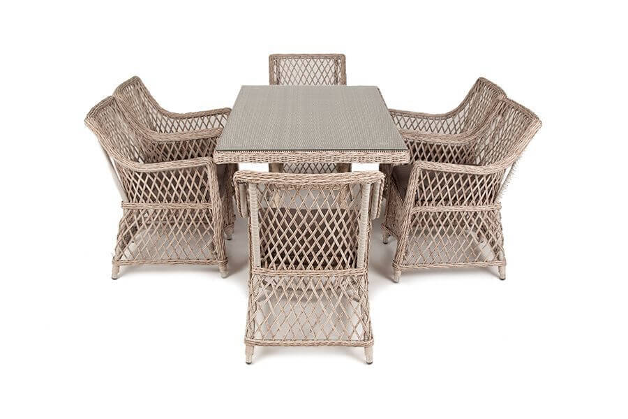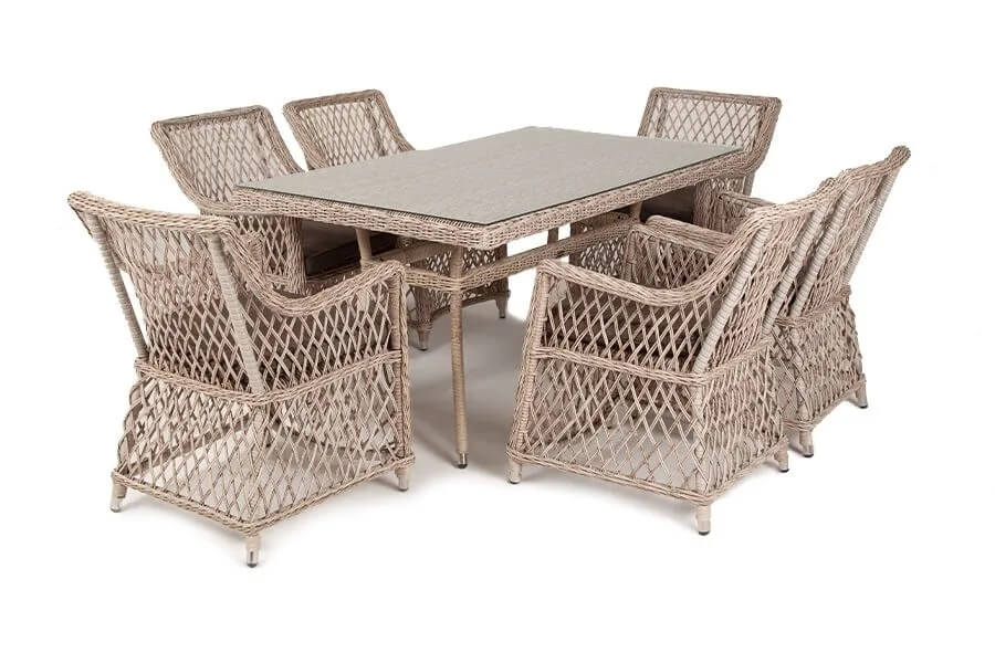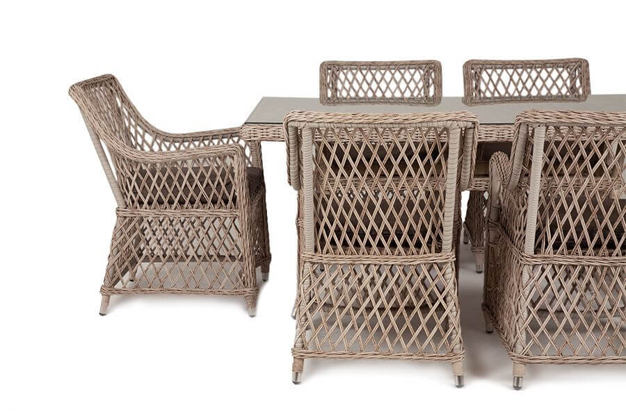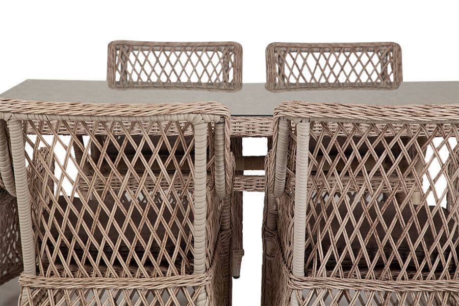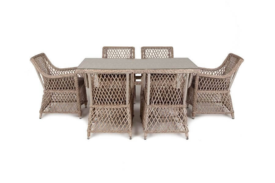 Ротанговая обеденная группа «Латте» для создания зоны отдыха в саду, обустройства веранды отеля или ресторана. Набор состоит из прямоугольного стола со стеклянной столешницей, размером 1600х900х750 мм и 6 кресел, размером - 680х550х840 мм. Комплект гармонично сочетает в себе алюминий, из которого выполнен каркас и декор из искусственного ротанга бежевого оттенка. Прекрасным дополнением мебели стали мягкие подушки из всепогодной ткани со съемными чехлами. Вы можете приобрести каждый из элементов набора отдельно, чтобы оборудовать лаунж-зону нужного вам размера.