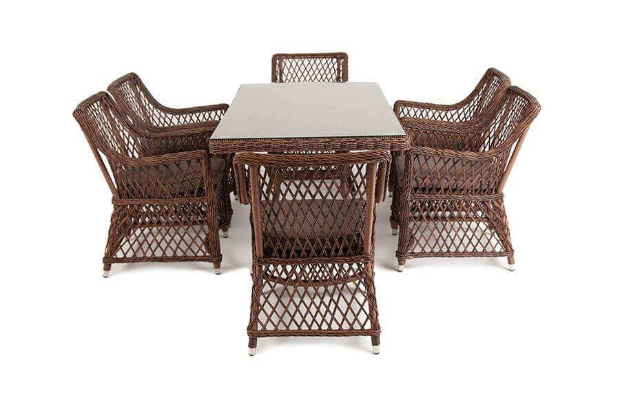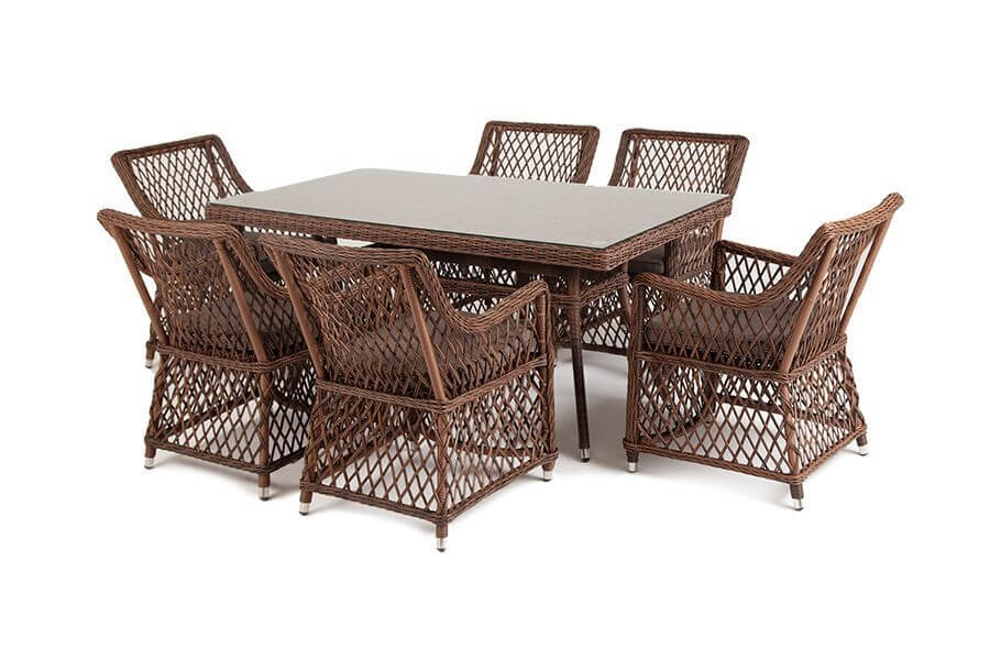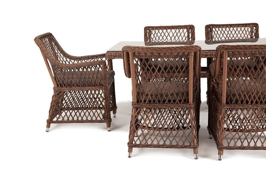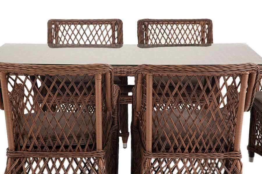 Ротанговая обеденная группа «Латте» для создания зоны отдыха в саду, обустройства веранды отеля или ресторана. Латте коричневая обеденная группа состоит из прямоугольного стола со стеклянной столешницей, размером 1600х900х750 мм и 6 кресел, размером - 680х550х840 мм. Комплект гармонично сочетает в себе алюминий, из которого выполнен каркас и декор из искусственного ротанга насыщенного шоколадного оттенка. Прекрасным дополнением мебели стали мягкие подушки из всепогодной ткани со съемными чехлами. Вы можете приобрести каждый из элементов набора отдельно, чтобы оборудовать лаунж-зону нужного вам размера.