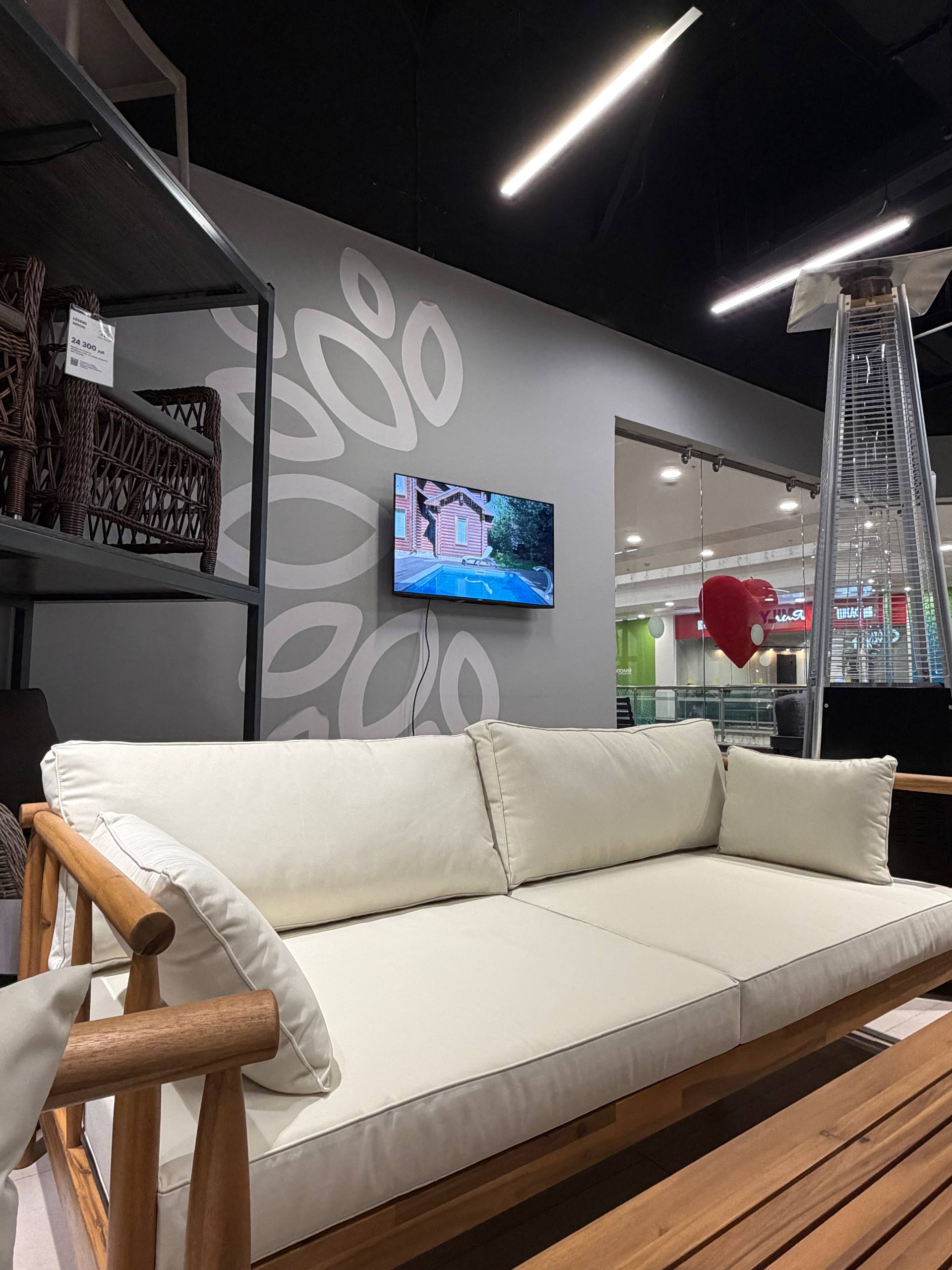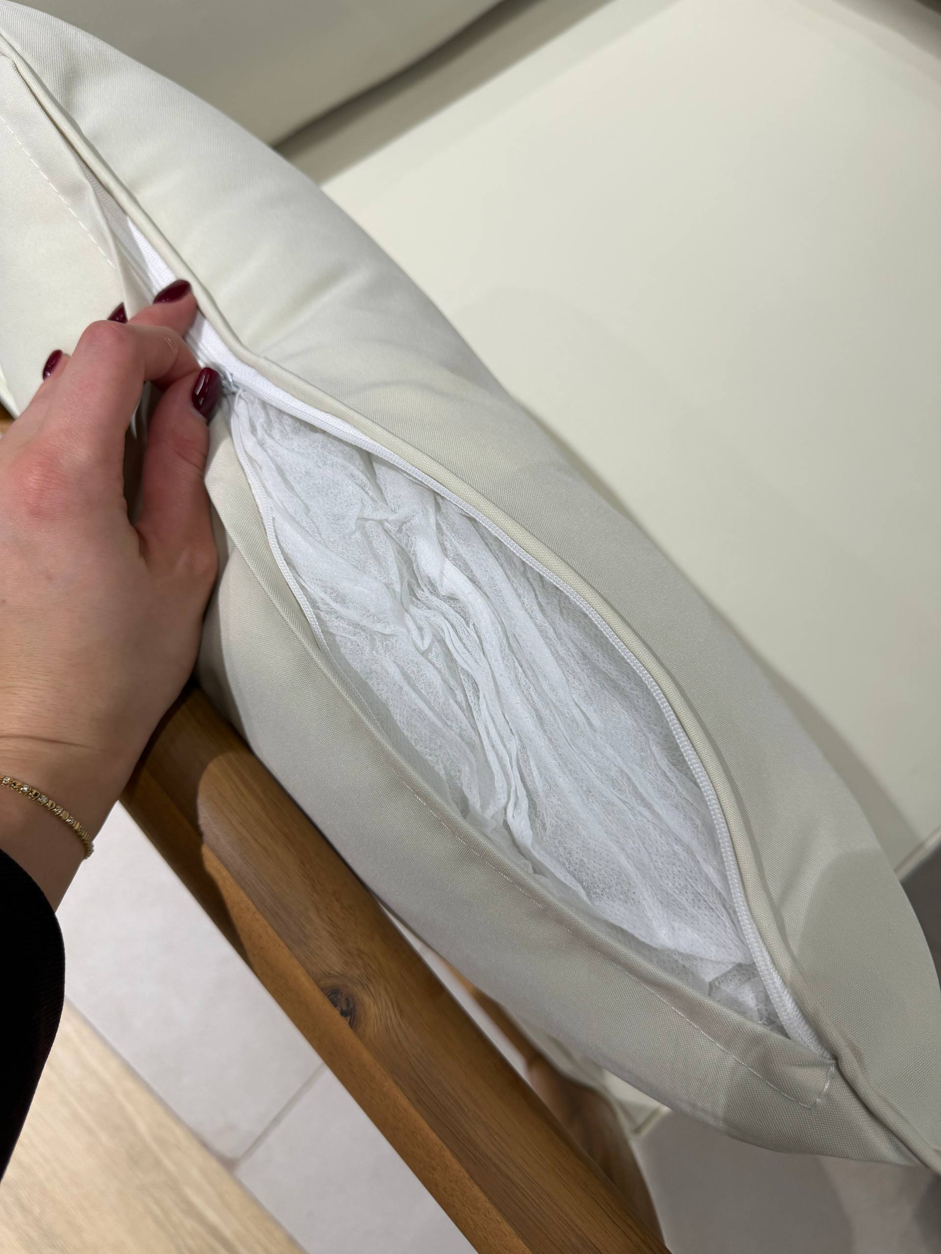 - Подушки из олефина (бежевый цвет) — материал чехлов устойчив к ультрафиолету, влаге и загрязнениям. Олефин не теряет цвет и текстуру даже при длительном воздействии погодных условий.