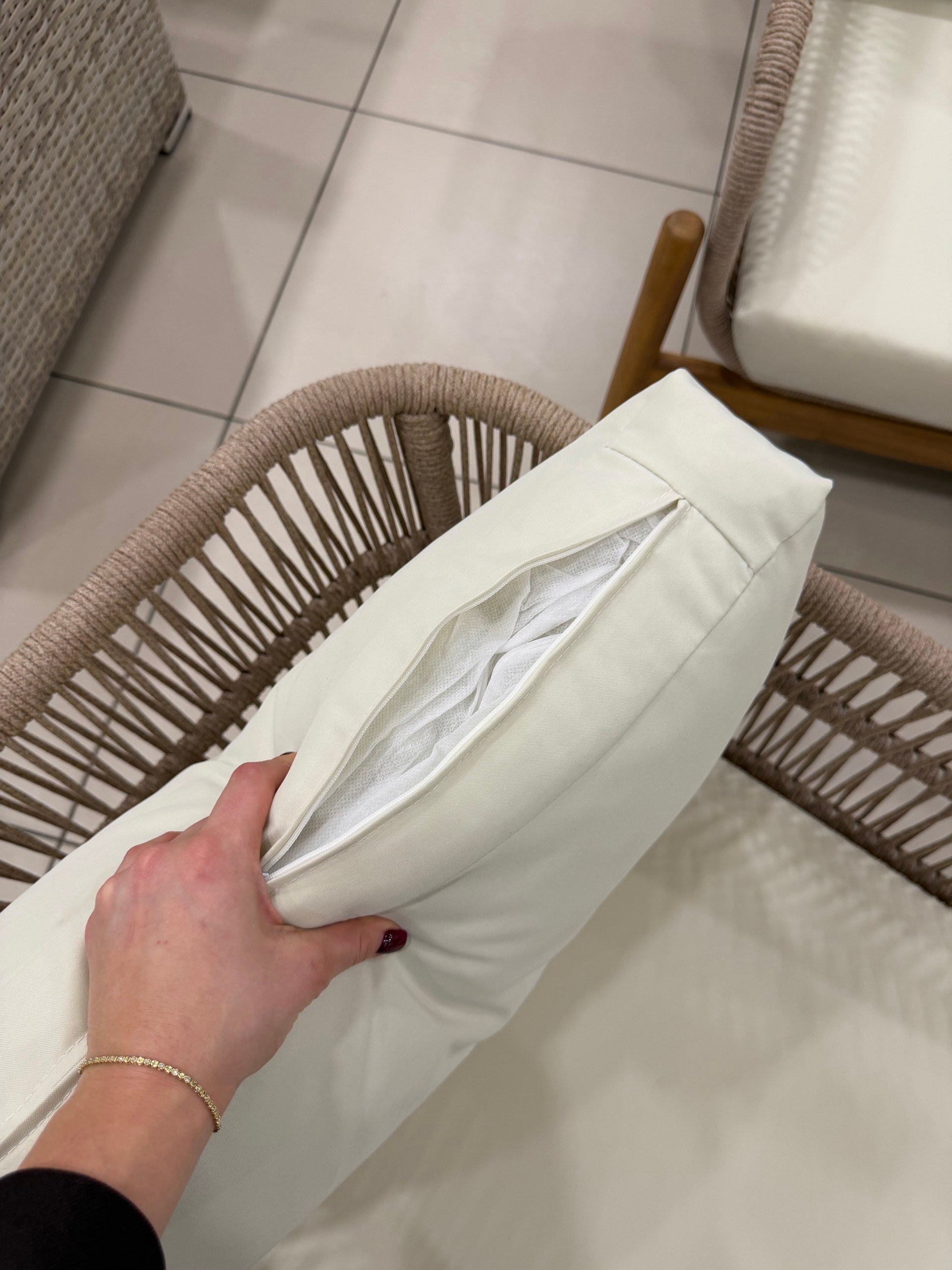 - Подушки из олефина (бежевый цвет) — материал чехлов устойчив к ультрафиолету, влаге и загрязнениям. Олефин не теряет цвет и текстуру даже при длительном воздействии погодных условий.
