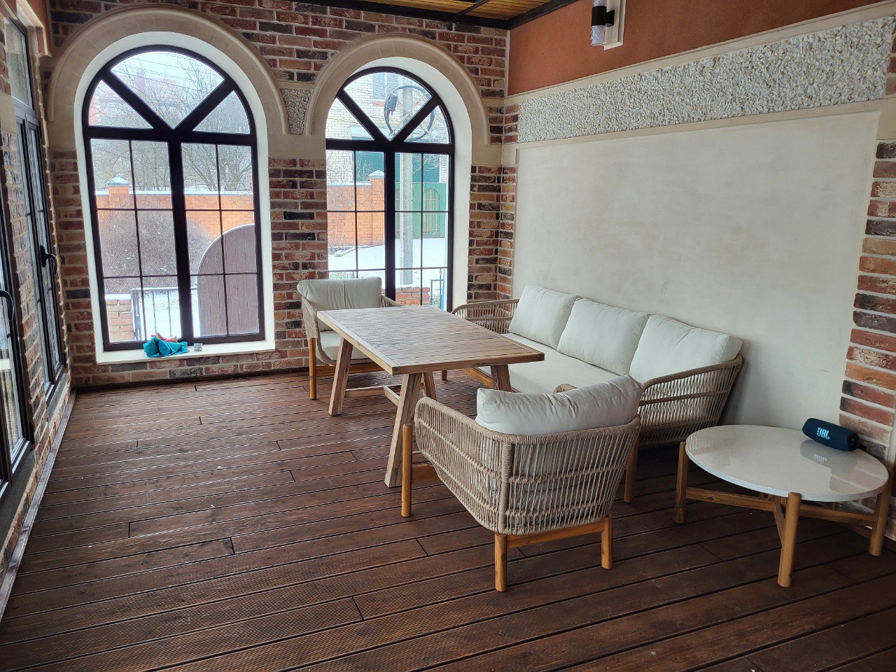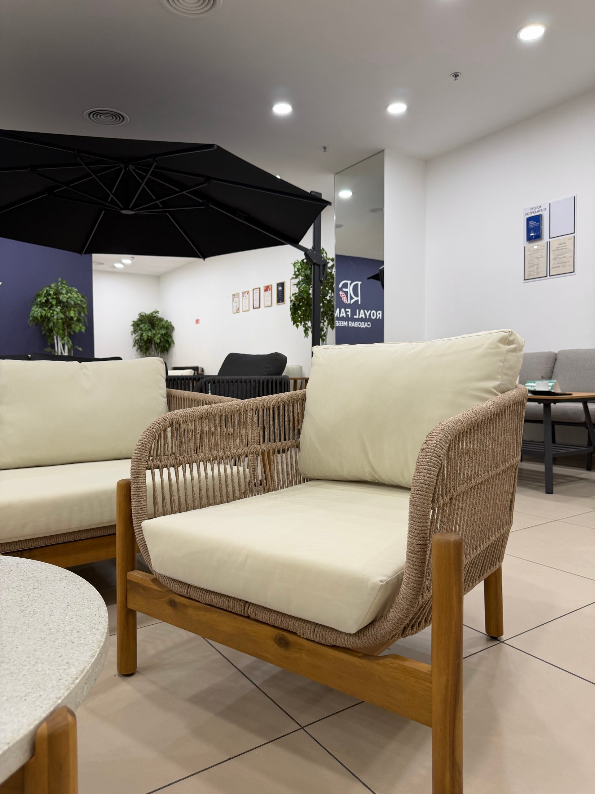 - Спинки из роупа (бежевого цвета) — придают комплекту особый шарм и лёгкость. Роуп не только эстетичен, но и практичен: не выгорает на солнце и легко очищается от загрязнений.