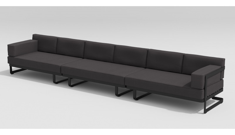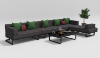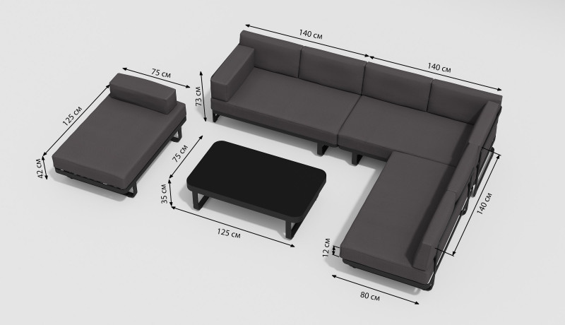 Материалы и цвета: каркас мебели выполнен из всесезонного алюминия с порошковым покрытием темно-серого цвета (карбон), подушки спинок и сидений обшиты уличной тканью темно-серого цвета (А13805) с водоотталкивающей пропиткой, толщина подушек 12 см, столешница кофейного столика глянцевая, изготовлена из закаленного стекла толщиной 5 мм с нанесением черного цвета с помощью шелкотрафаретной печати.