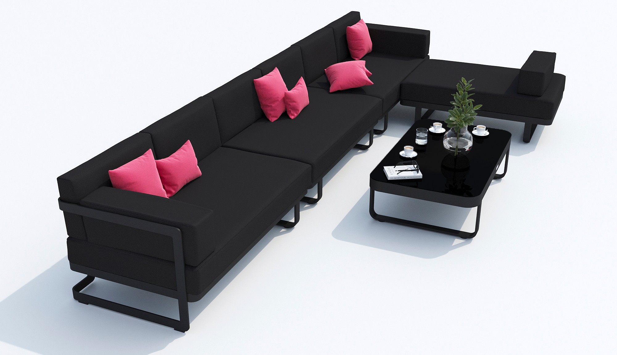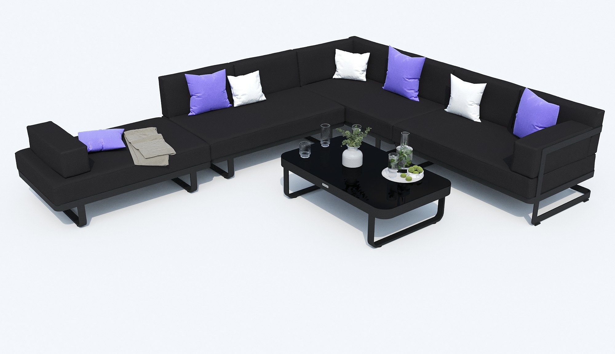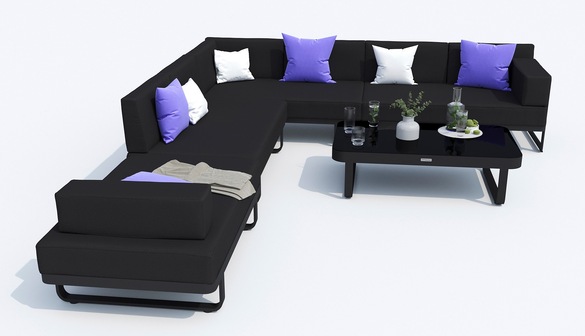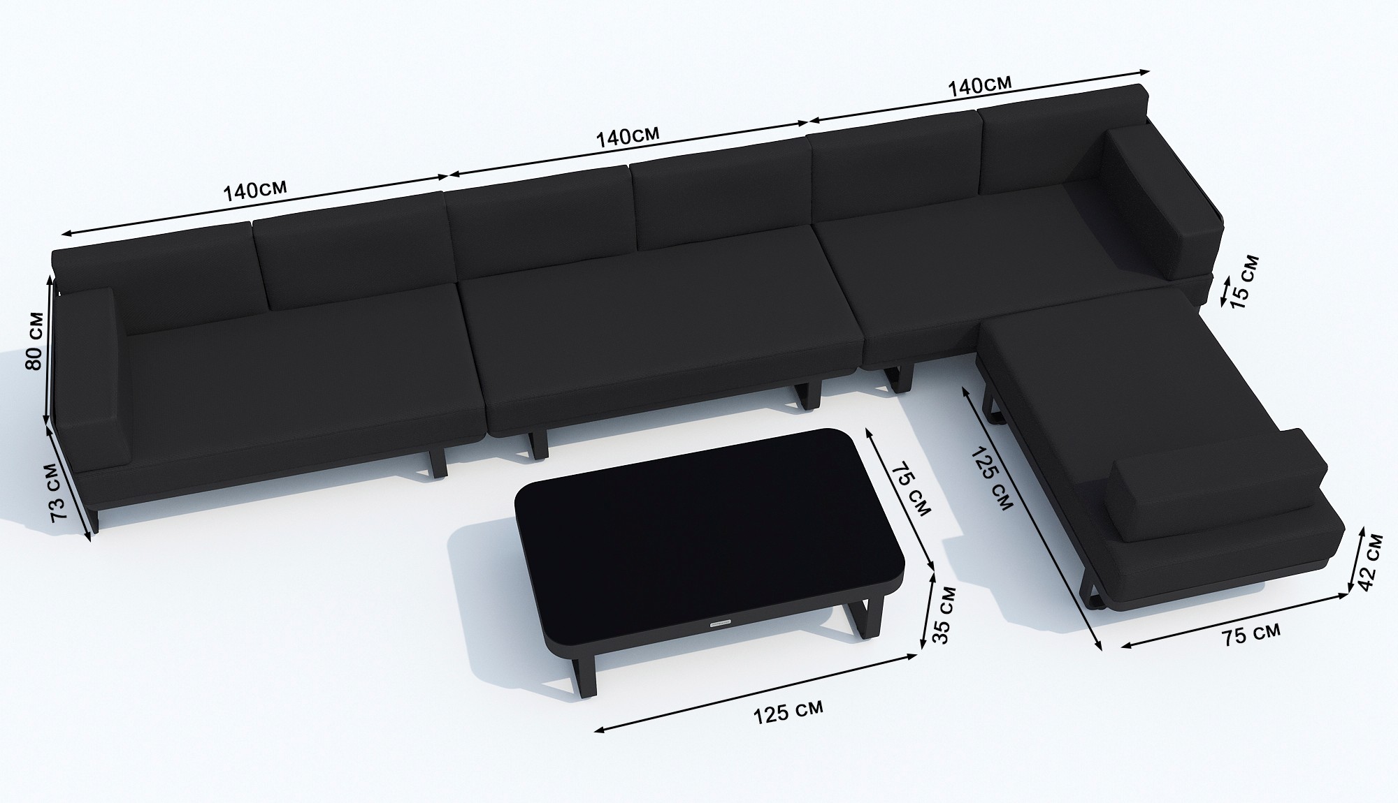 Материалы: всесезонный алюминий с порошковым напылением, специальная ткань для улицы, закаленное стекло Цвет: каркас темно-серый карбон / подушки черные / столешница черная глянцевая Комплектация и габариты: