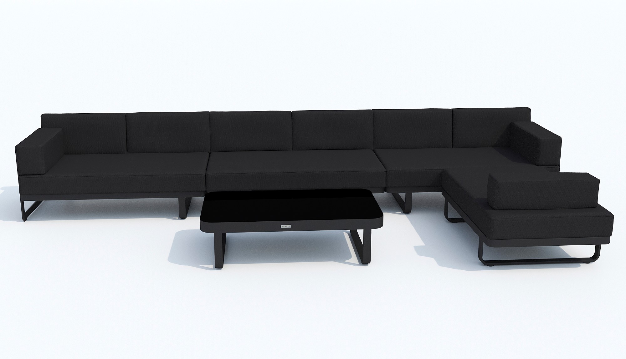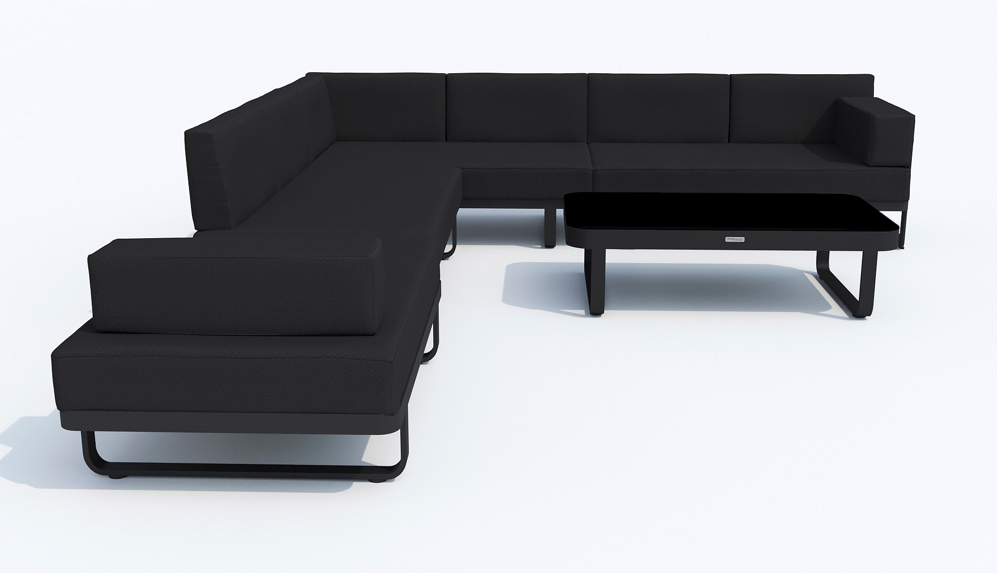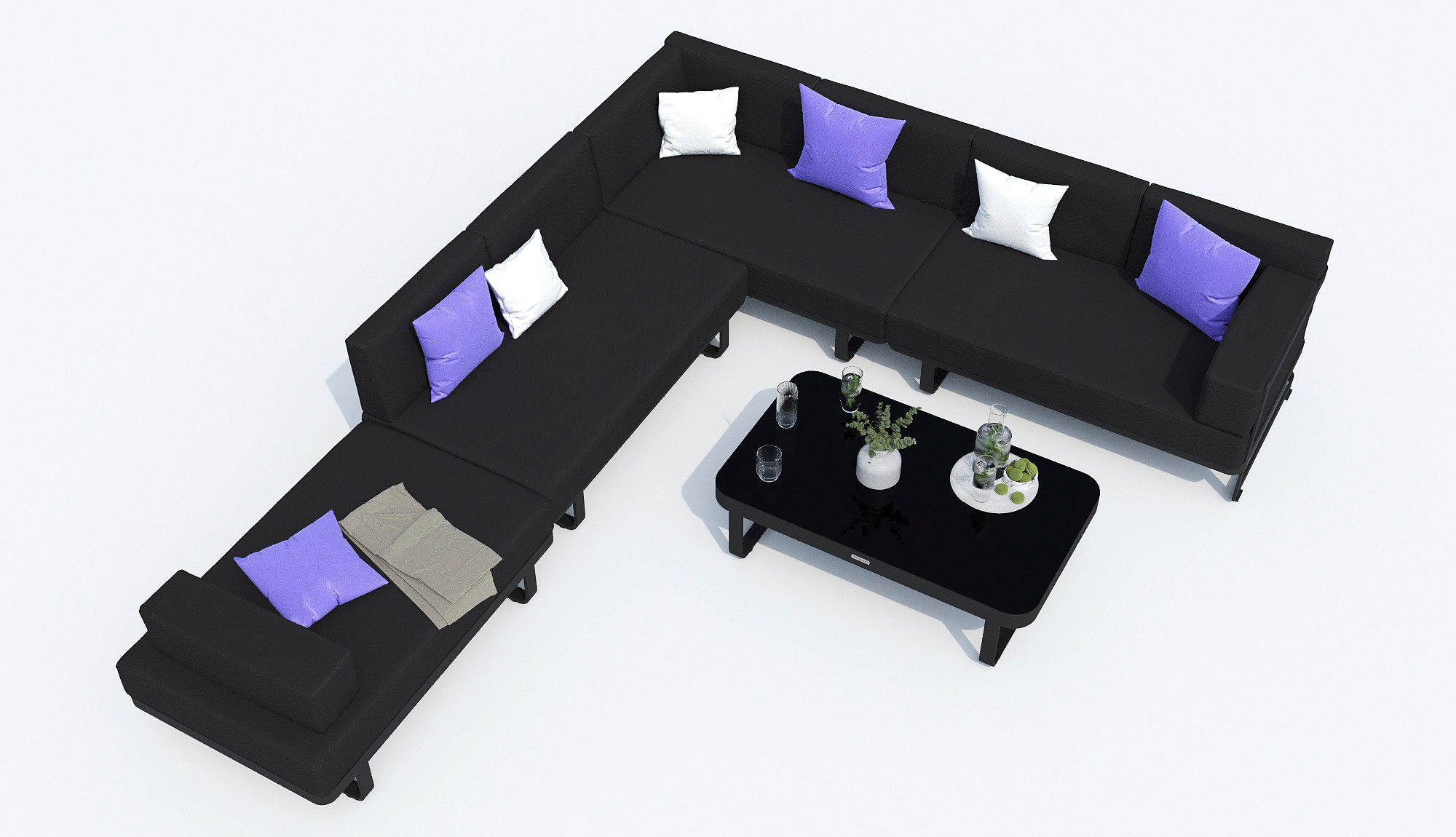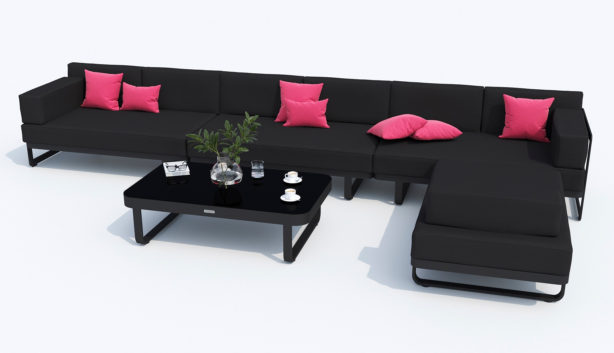 Материалы: всесезонный алюминий с порошковым напылением, специальная ткань для улицы, закаленное стекло Цвет: каркас темно-серый карбон / подушки черные / столешница черная глянцевая Комплектация и габариты: