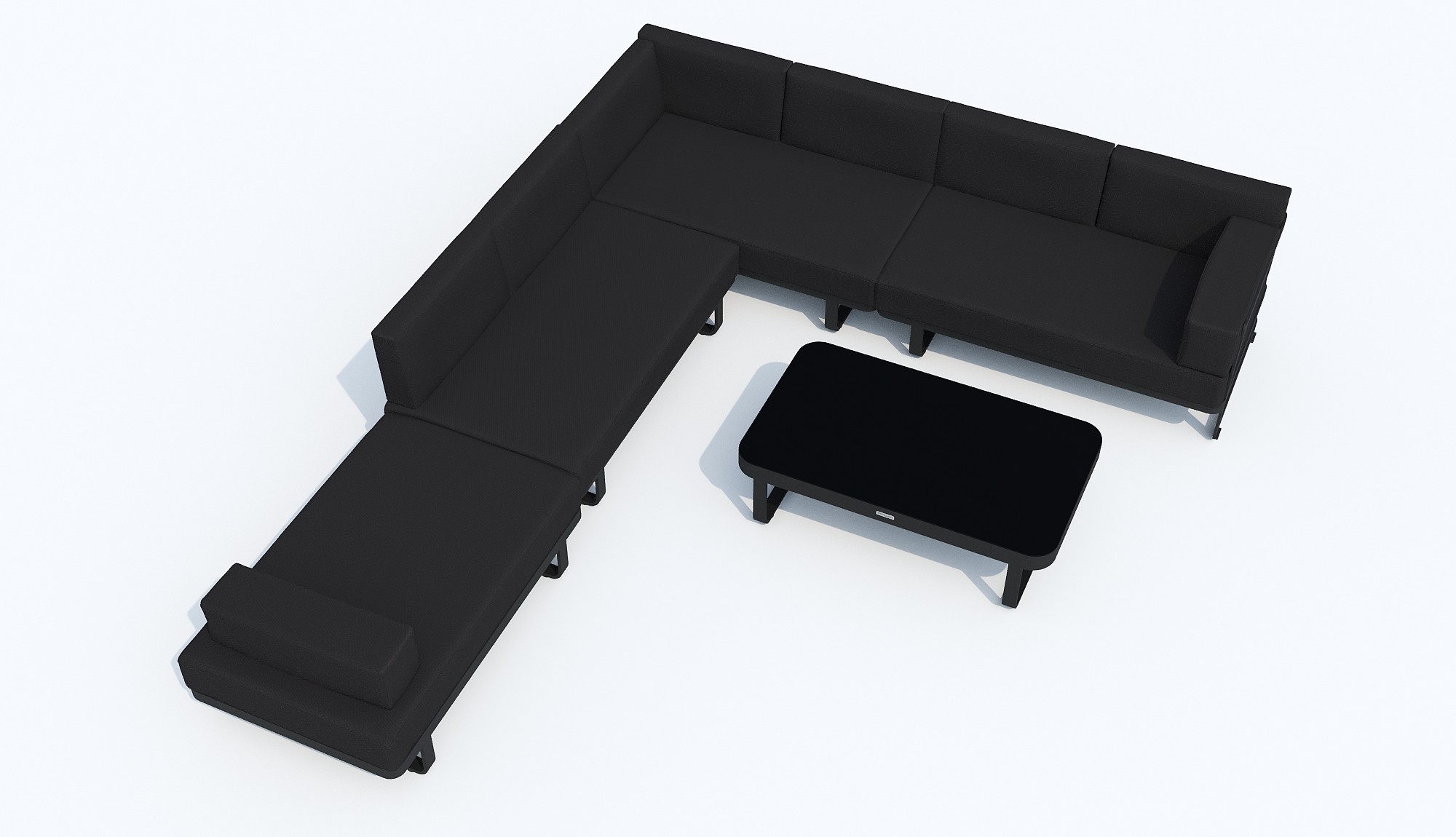 Лаунж зона состоит из большого и уютного дивана в форме буквы Г, мягких кресел и кофейного столика со столешницей из черного глянцевого стекла. Минимализм и сдержанная цветовая гамма впишутся любой стиль интерьера и будут дополнять композицию. Черные чехлы мебели идеально сочетаются с темно-серым каркасом, подчеркивая строгий и лаконичный дизайн. Они не выгорят на солнце и выдержат любые капризы погоды. Их легко снять и почистить, если на них есть видимые загрязнения.