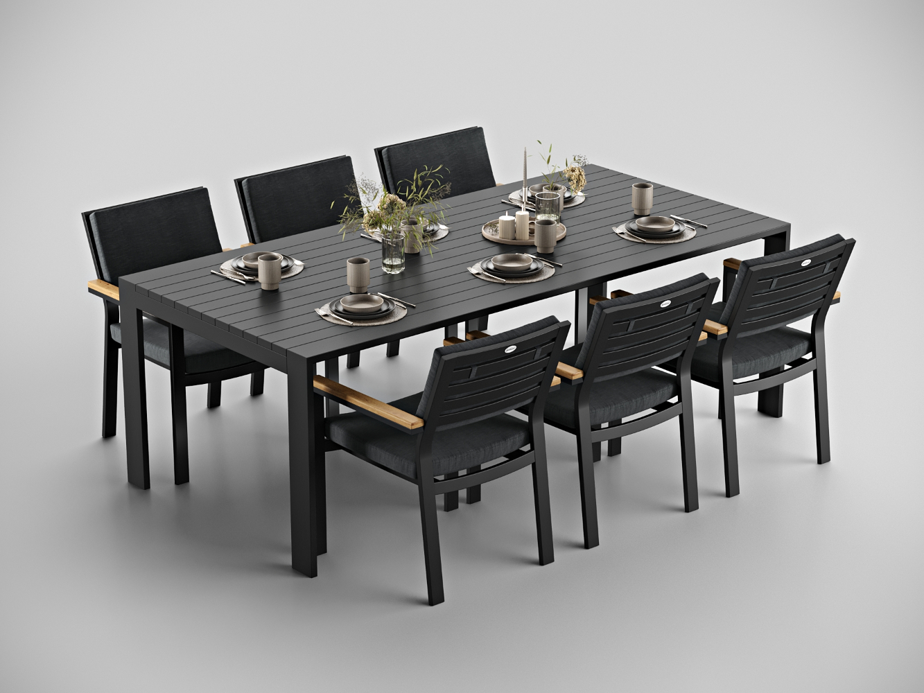 Каркас мебели выполнен из всесезонного алюминия с порошковым покрытием темно-серого цвета (карбон), подушки сидений и спинок обшиты уличной тканью (олефин) темно-серого цвета, толщина подушек 5 см, чехол съёмный на "молнии", столешница обеденного стола изготовлена из алюминиевых планок шириной 7 см.