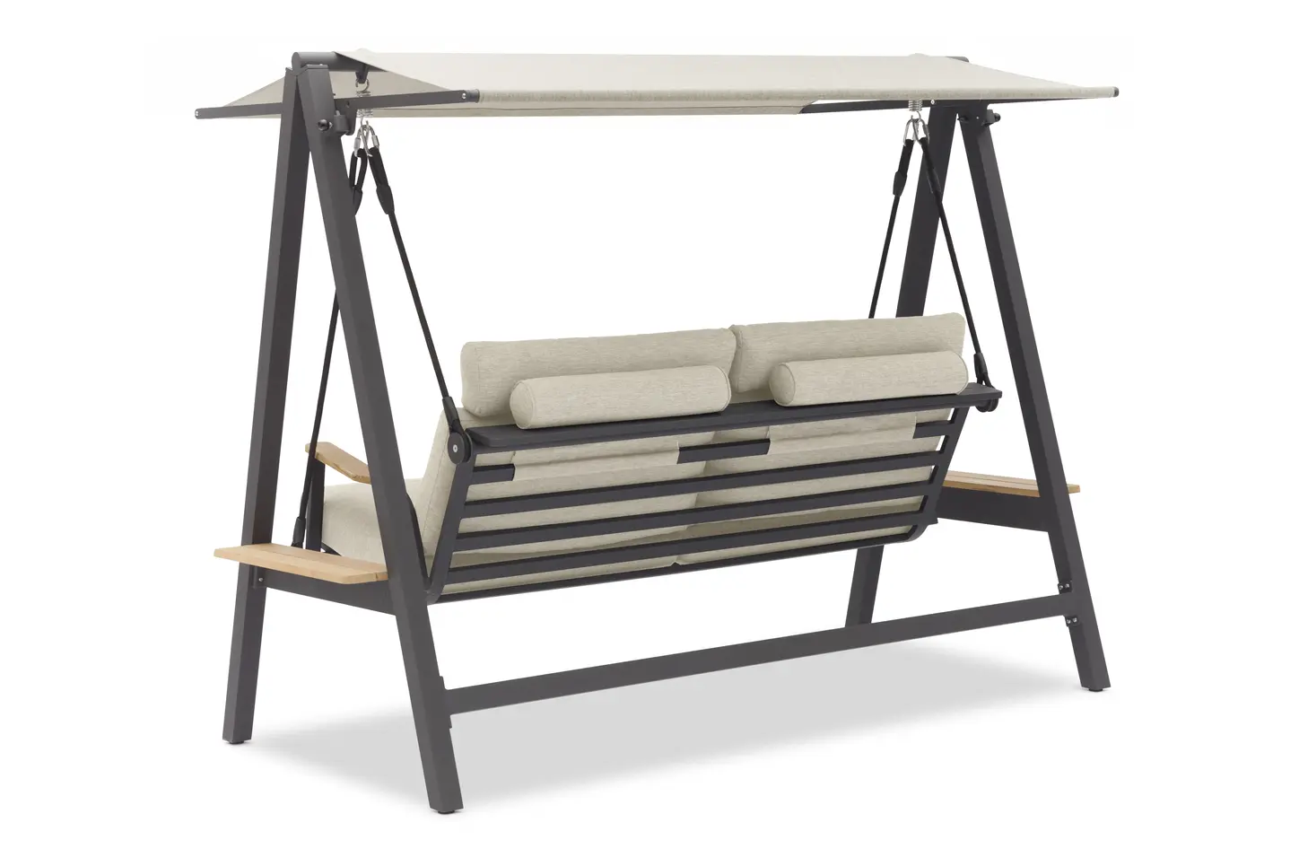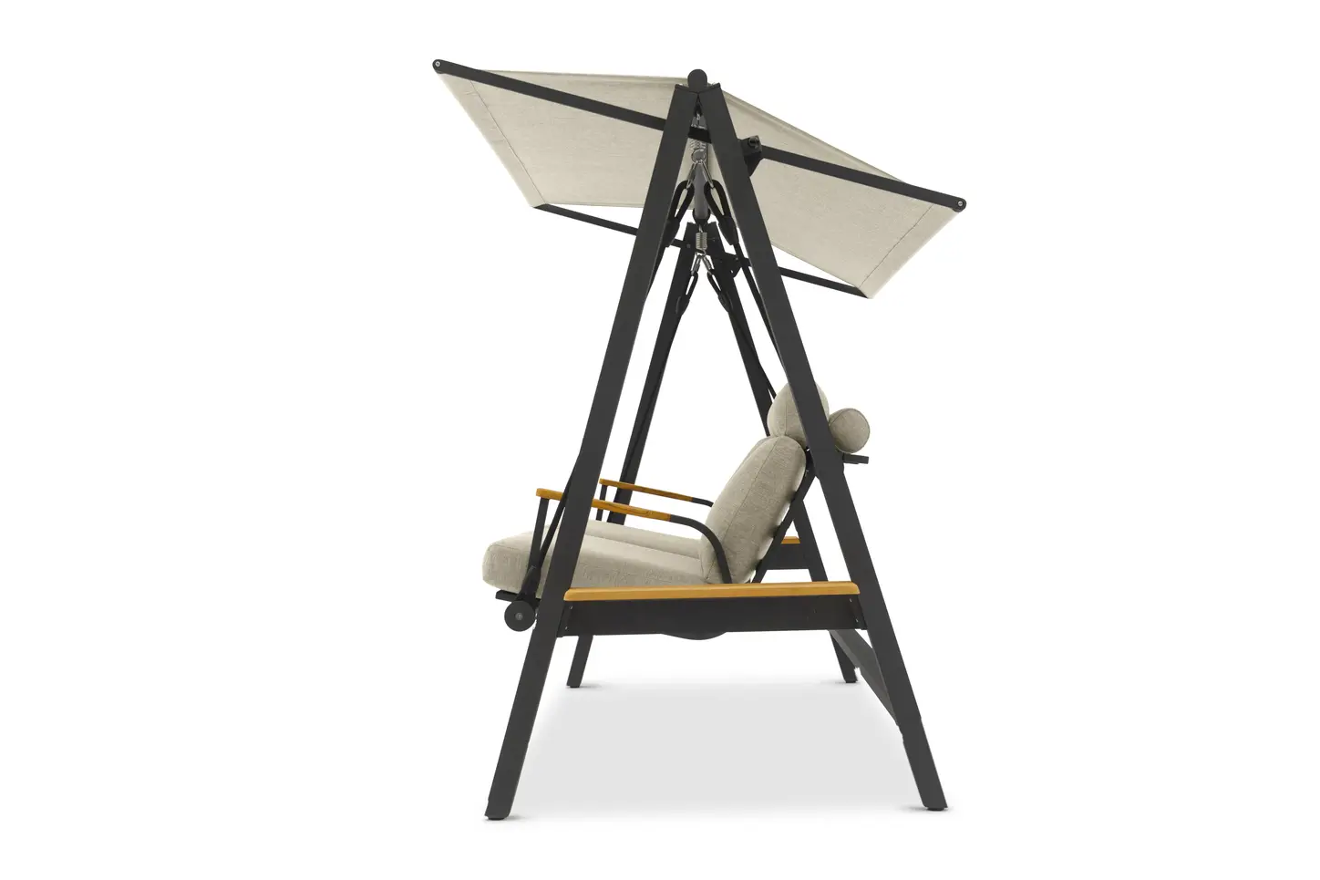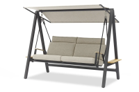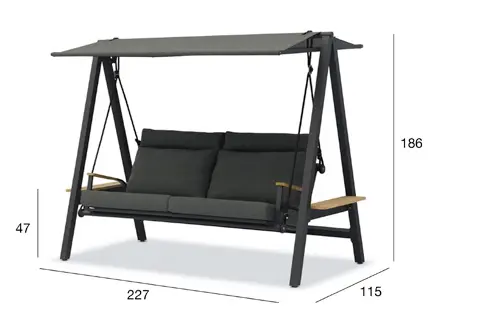 Боковой столик из тикового дерева с обеих сторон качелей.
