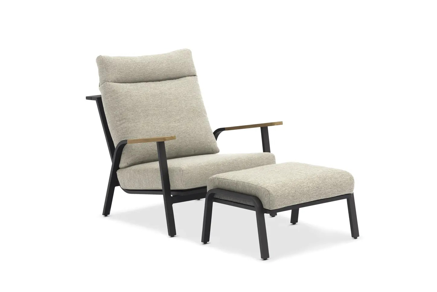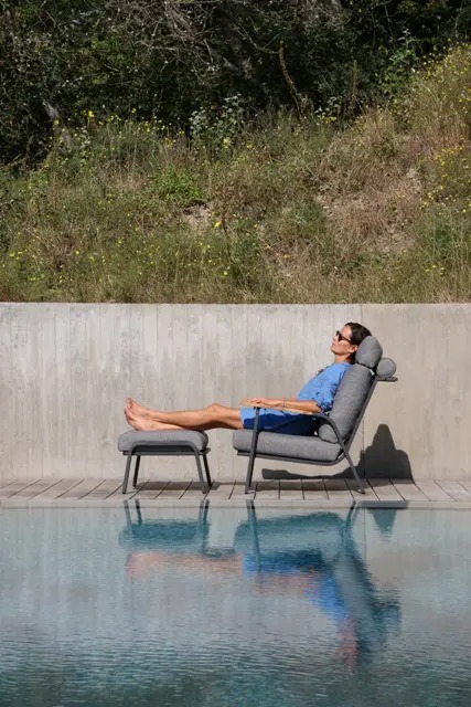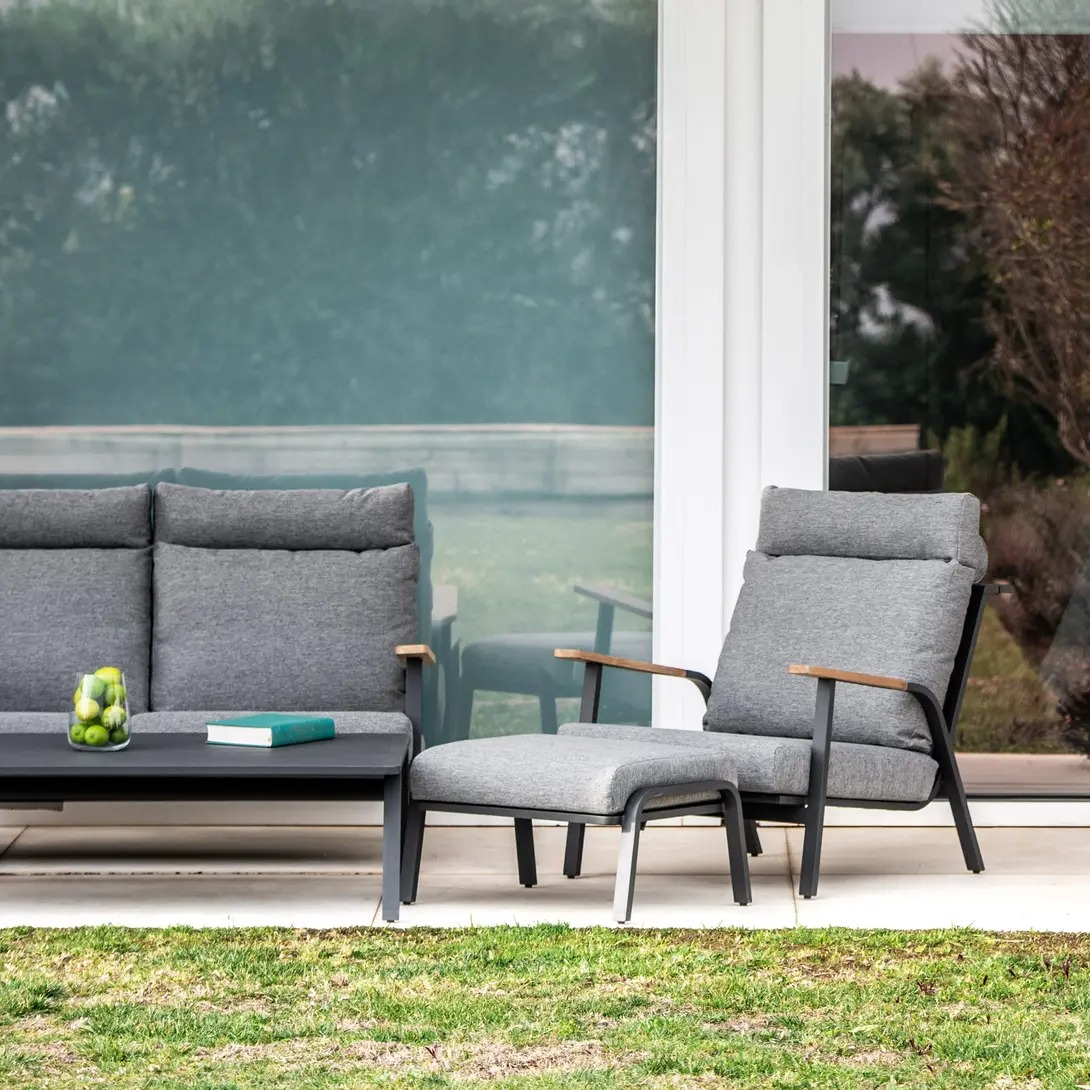 Прямые линии, неподвластный времени дизайн в современном стиле. Низкие сиденья создают дополнительное ощущение современного салона. Захватывающее сочетание разных материалов: алюминий и детали из тика в подлокотниках. Очень удобные подушки из пенопласта с высокой эластичностью и покрытые олефиновой тканью с подкладкой, которая делает их водоотталкивающими. Максимальный комфорт с подушкой для шеи. Группа с красивыми деталями и углами.