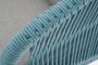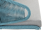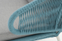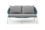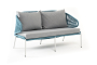 Диван имеет алюминиевый каркас, окрашенный порошковой краской в светло-серый (RAL7035) цвет. Боковины каркаса и спинка вручную оплетены роупом - эластичными синтетическими лентами, изготовленными из высокопрочных полиэфирных волокон. Цвет оплетки – бирюзовый.