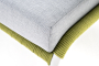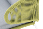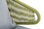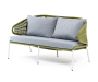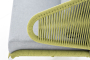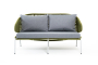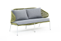 Диван имеет алюминиевый каркас, окрашенный порошковой краской в светло-серый (RAL7035) цвет. Боковины каркаса и спинка вручную оплетены роупом - эластичными синтетическими лентами, изготовленными из высокопрочных полиэфирных волокон. Цвет оплетки – салатовый меланж.