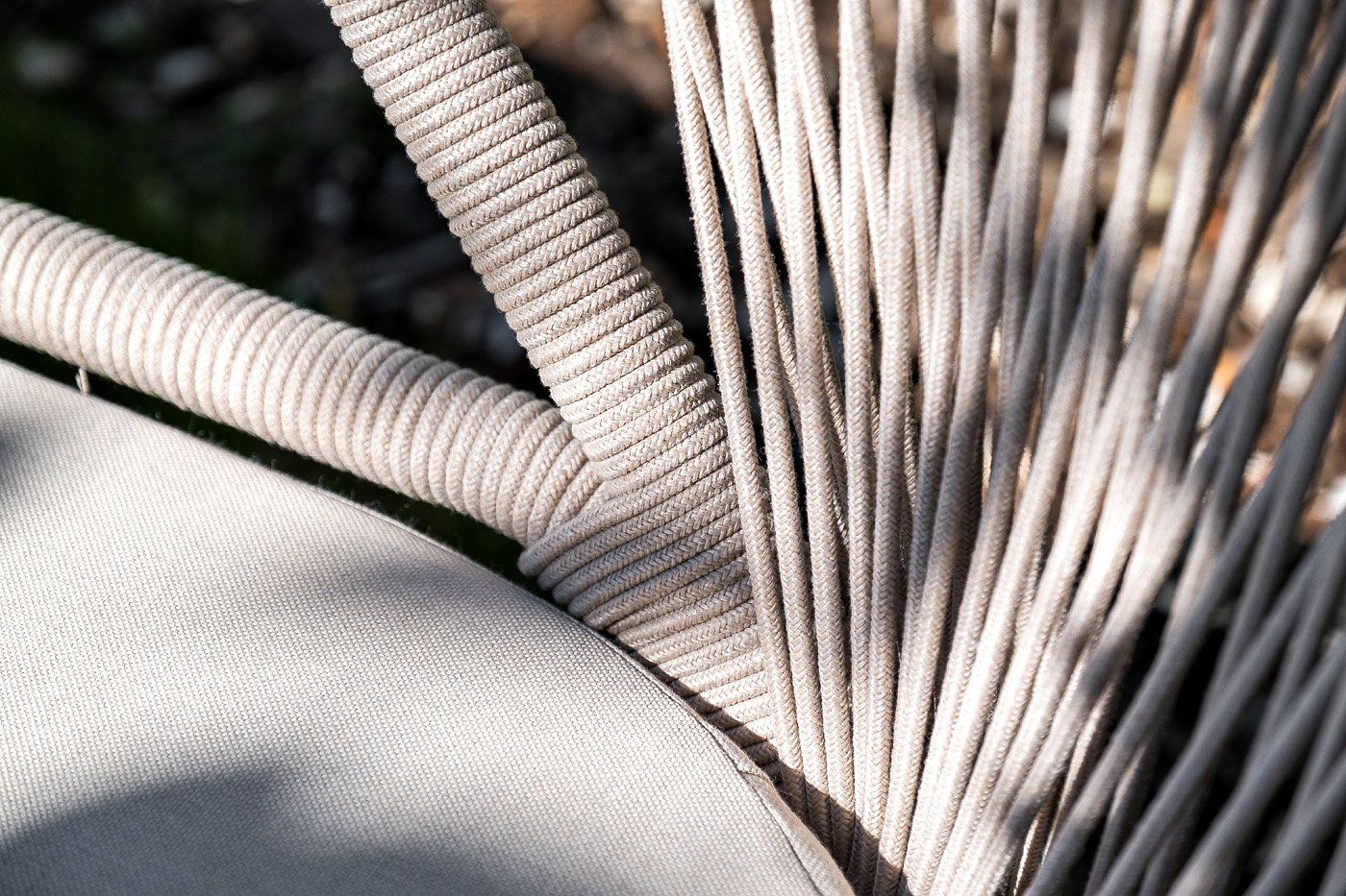 Изготовлен из алюминиевого каркаса, оплетенного вручную эластичными синтетическими лентами из высокопрочных полиэфирных волокон (роуп круглый). Цвет каркаса - белый, оплетки - бежевый.