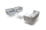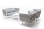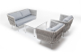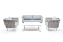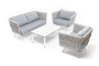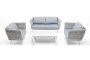 Кресла и диван идут в комплекте с мягкими подушками в чехлах светло-серого цвета. "Монако" диван 2-местный плетеный из роупа, каркас алюминий светло-серый (RAL7035) шагрень, роуп светло-серый 40 мм, ткань светло-серая 1шт. 1 600Х700Х750, "Монако" кресло плетеное из роупа, каркас алюминий светло-серый (RAL7035) шагрень, роуп светло-серый 40 мм, ткань светло-серая 2шт. 980Х700Х750, "Канны" журнальный столик из HPL 95х60, H40, каркас белый, цвет столешницы "молочный" 1шт. 950Х600Х400,