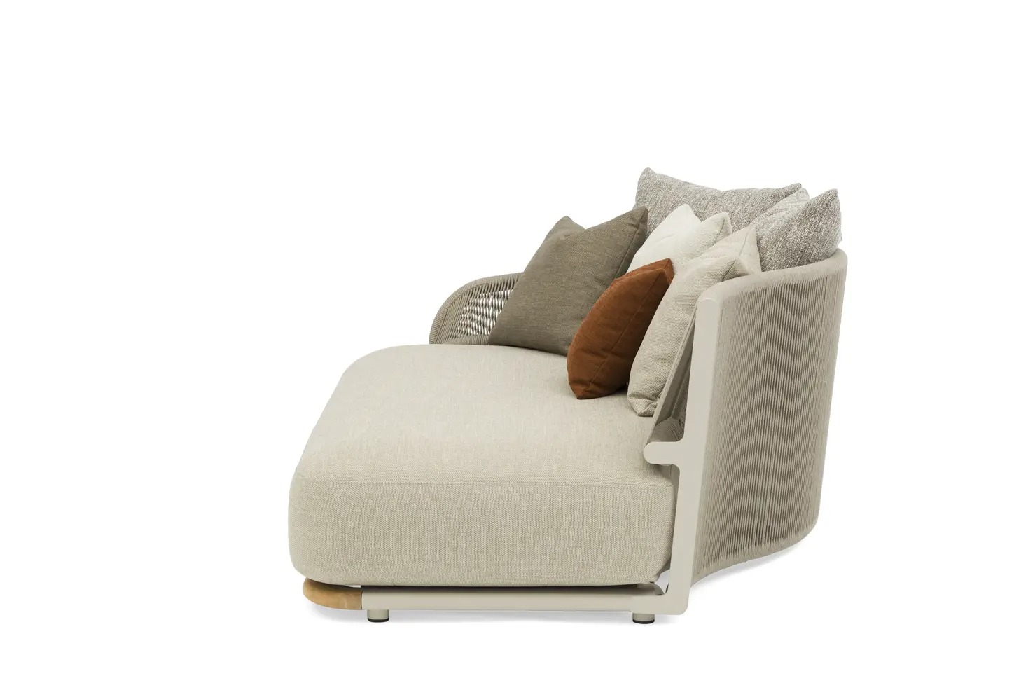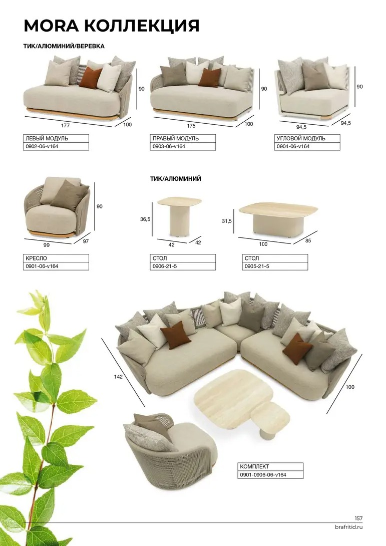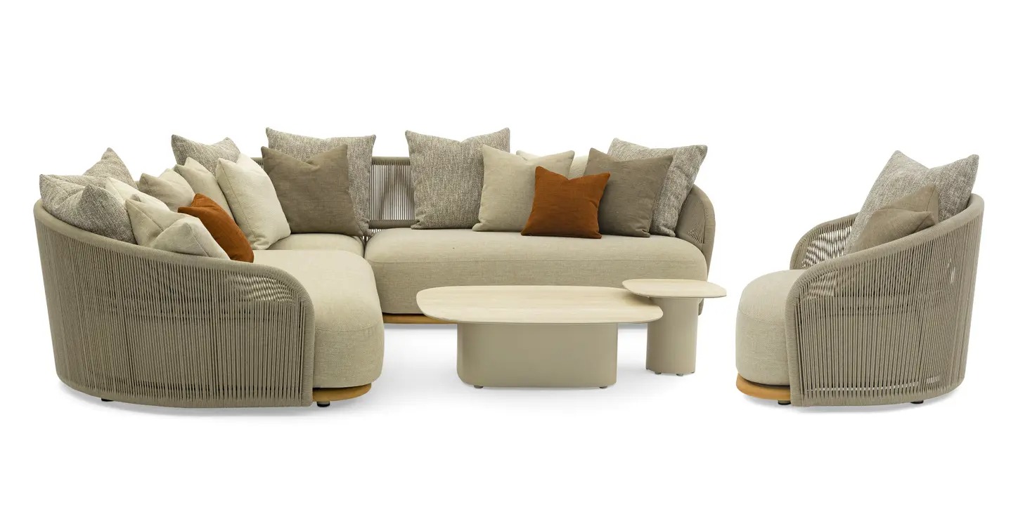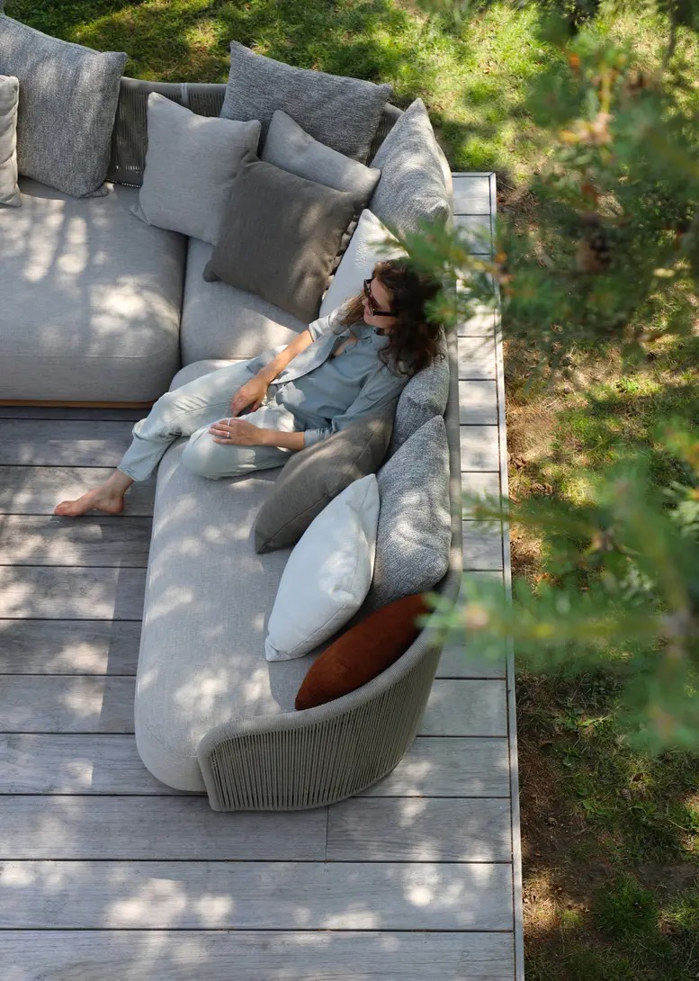 Каркас: алюминий + тиковое дерево FSC + олефиновая веревка. Подушки с наполнителем из пенополиуретана, солнцезащитная ткань.