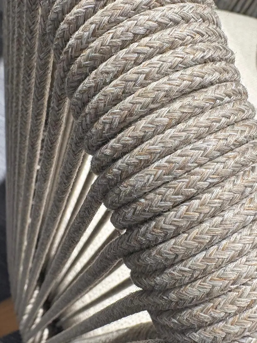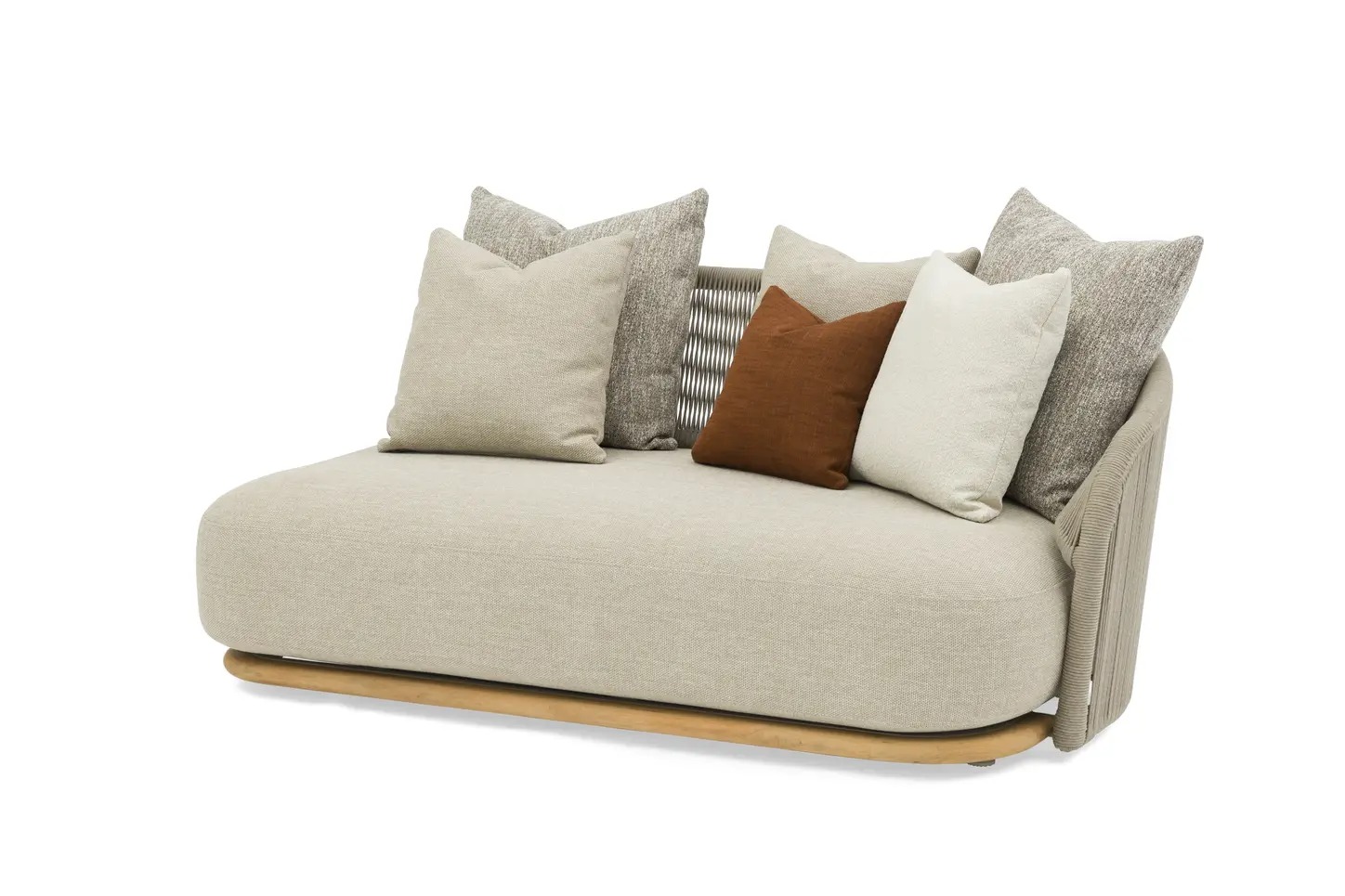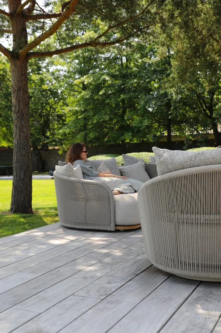 Каркас: алюминий + тиковое дерево FSC + олефиновая веревка. Подушки с наполнителем из пенополиуретана, солнцезащитная ткань.
