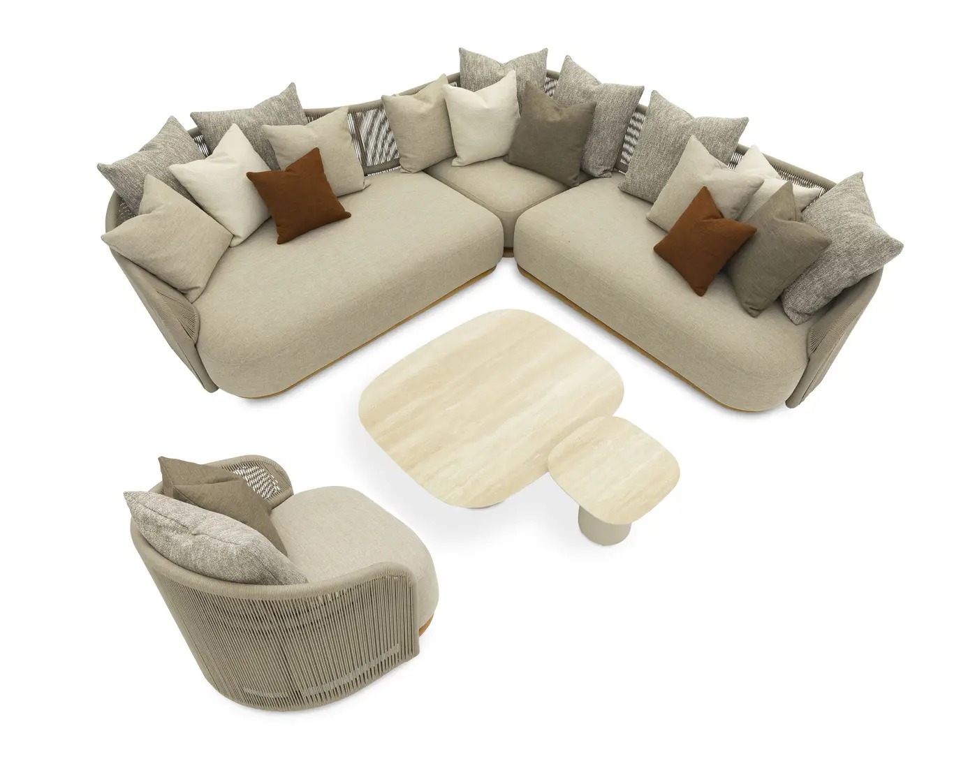Комплект состоит из углового дивана (c глубокой правой частью), вращающегося кресла и парных керамических столиков.