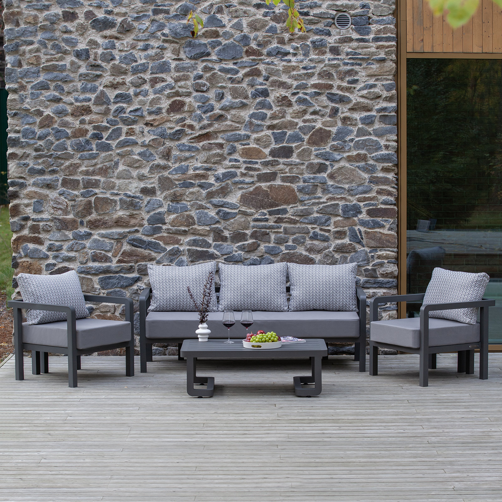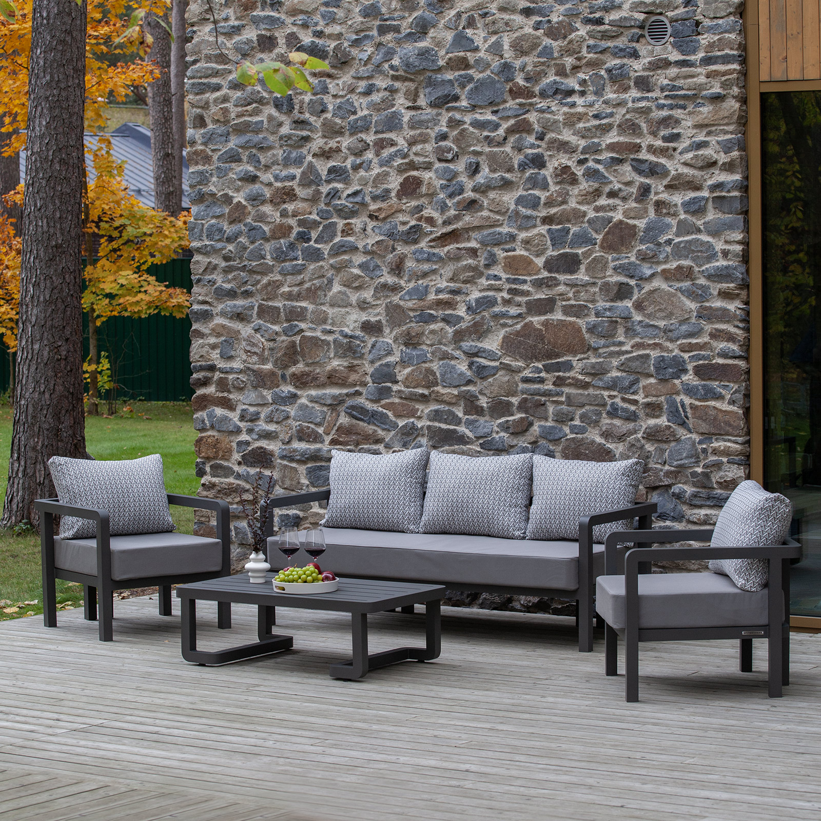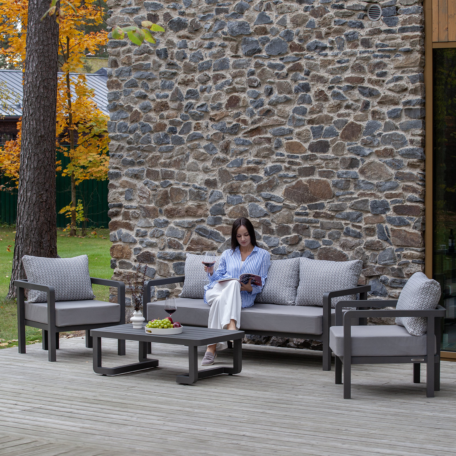 Набор садовой мебели AMALFI сочетает в себе современный дизайн, комфорт и долговечность. Комплект состоит из 4-х предметов: диван, 2 кресла и журнальный столик, подойдет для размещения 5 персон.