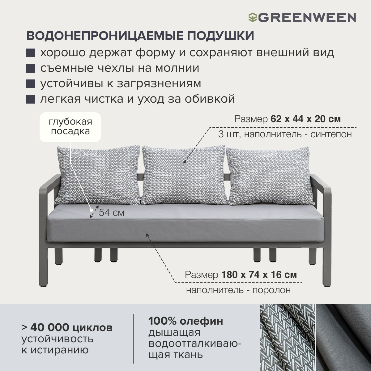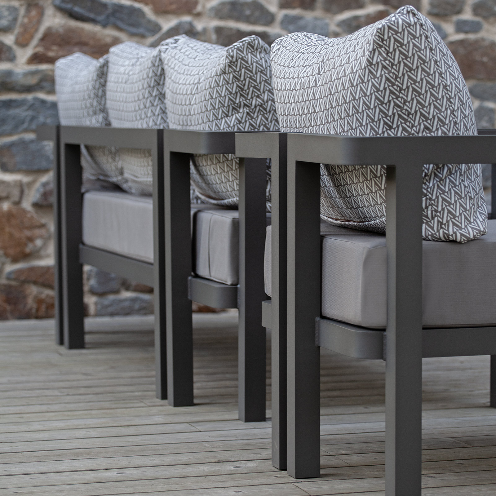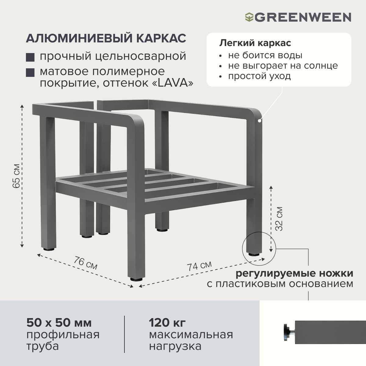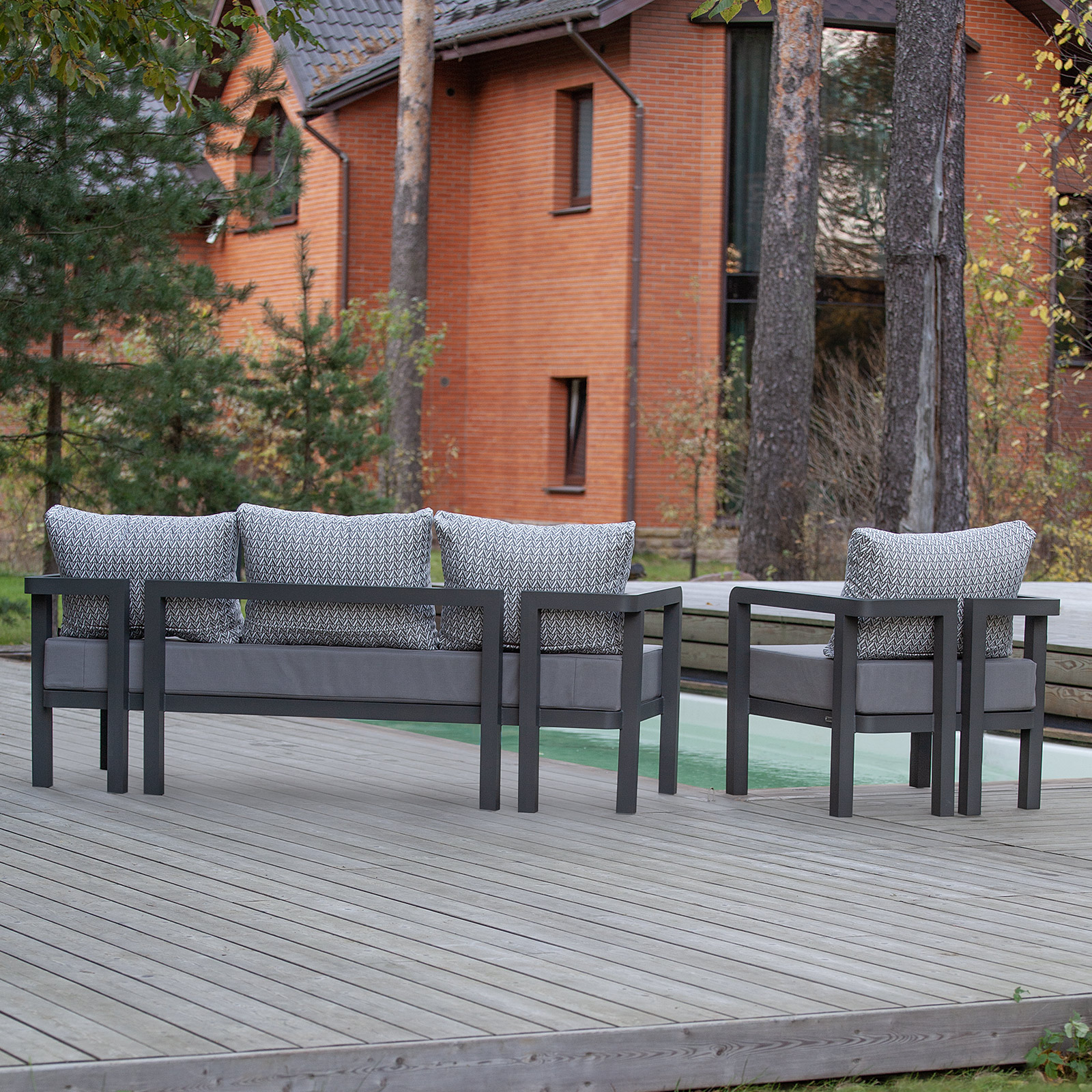 Коллекция уличной мебели AMALFI специально разработана для эксплуатации на открытой террасе, у бассейна. Прочная металлическая конструкция и регулируемые ножки обеспечивают устойчивость на любой поверхности. Съемные чехлы мягких деталей устойчивы к загрязнениям и воздействию воды. Цельносварной каркас из алюминия с матовым полимерным покрытием оттенка Lava устойчив к коррозии и влиянию внешней среды. Это обеспечивает долговечность и надежность мебели при использовании на открытом воздухе. Габариты дивана 190x65х76см, максимальная нагрузка 180 кг. Габариты кресла 74х65x76 см, максимальная нагрузка 150 кг. Высота от пола до сидения (металла) 32 см. Эргономичная форма кресла и дивана обеспечивает правильную посадку, что делает его идеальным местом для отдыха. Уличный диван и кресло дополняют большая подушка для сидения и мягкие подушки под спину в чехлах из водонепроницаемой ткани, 100% олефин. Дышащий материал устойчив к загрязнениям и воздействию воды, препятствует образованию пятен от напитков и лосьонов для загара, облегчает чистку и уход за обивкой.Большая подушка темно-серого цвета обеспечивает глубокую посадку, размеры сидения для дивана 180х74х16 см, сидения для кресла 64х74х16 см, подушки под спину с геометрическим принтом, размеры 62х44х20 см. В мебельных чехлах установлена молния, при необходимости их можно снять и почистить. Набивка большой подушки - поролон, подушка для спины набита синтепоном, обе упакованы в несъёмный чехол из спанбонда.