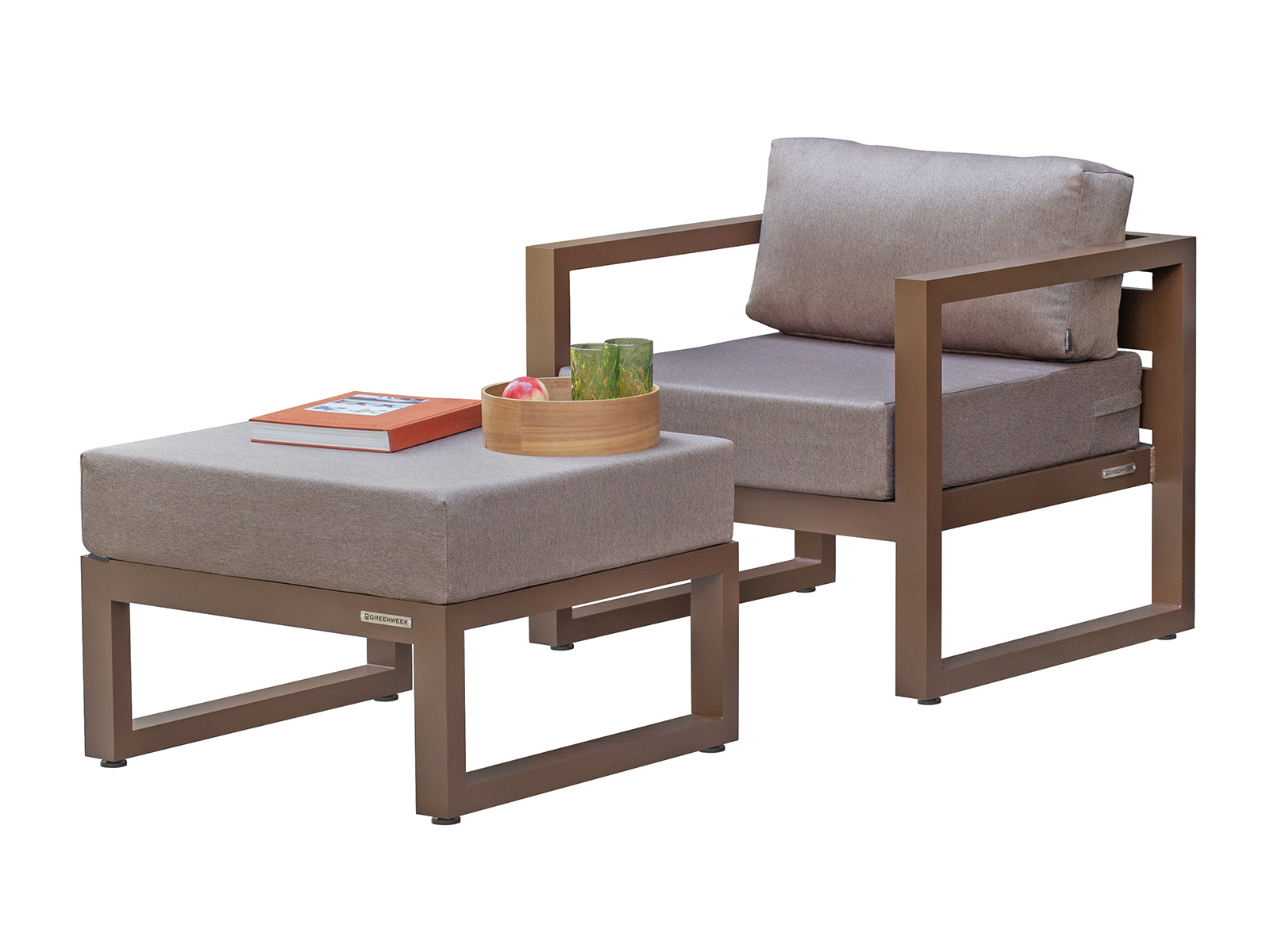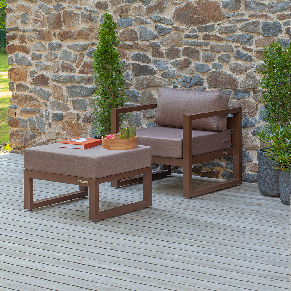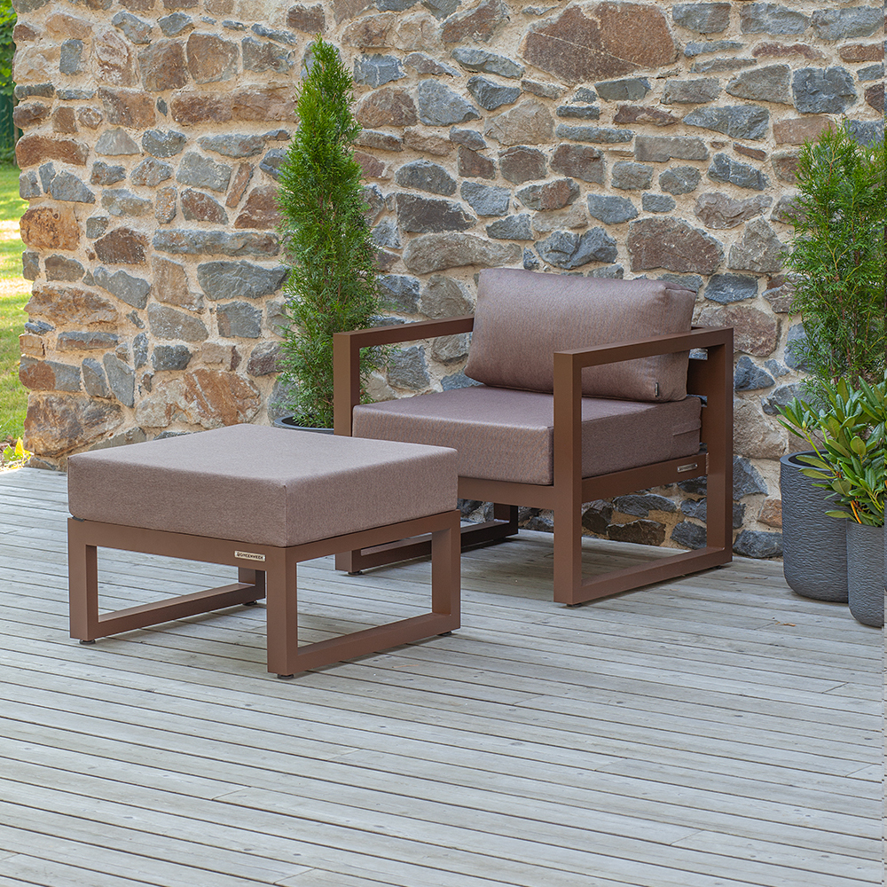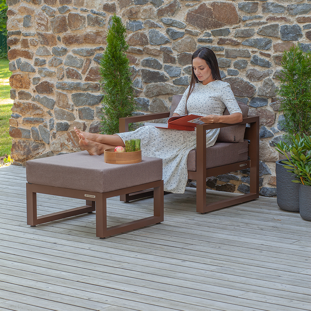 Комплект уличной мебели CAPRI создает комфортное пространство для отдыха в саду, на террасе, у бассейна. В наборе представлены кресло и пуф. Каркас изготовлен из высокопрочного алюминия, на сиденьях предусмотрены удобные подушки коричневого оттенка.