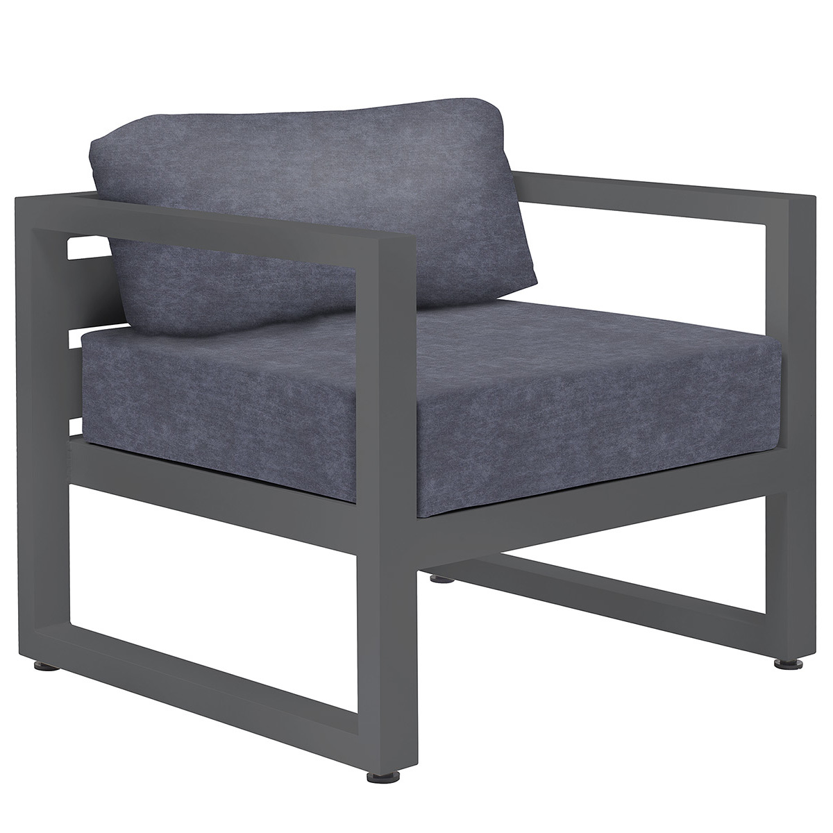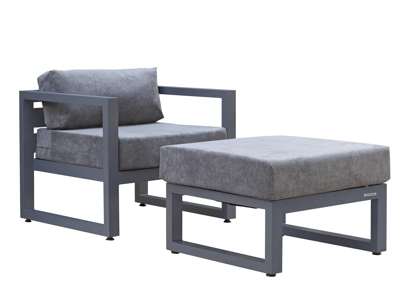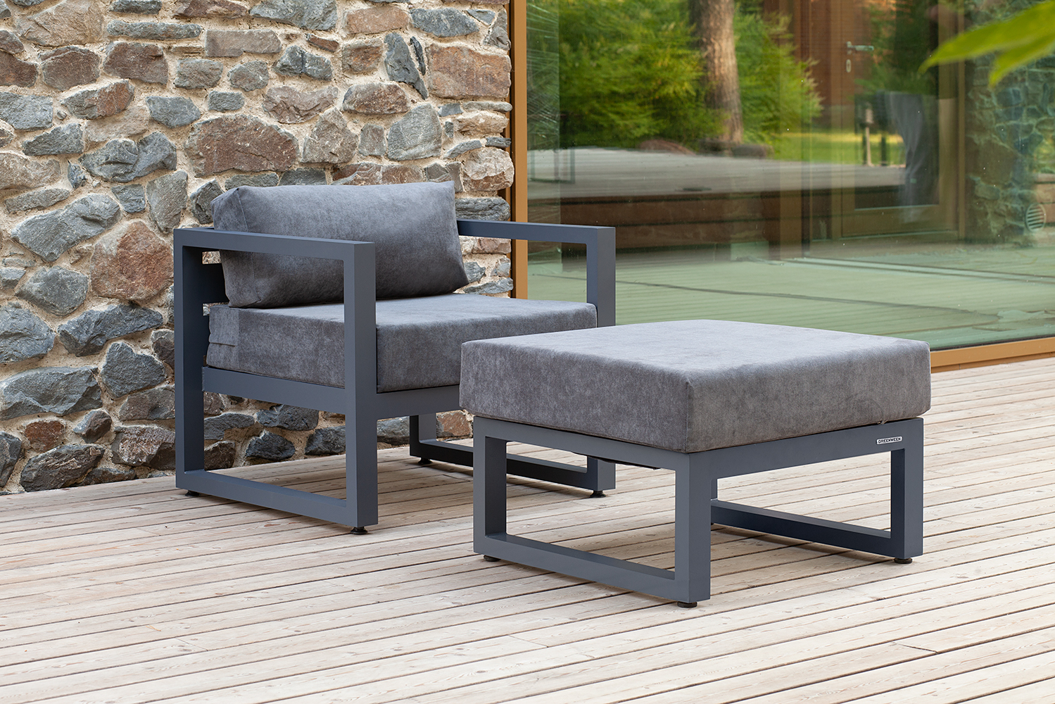 Комплект уличной мебели CAPRI создает комфортное пространство для отдыха в саду, на террасе, у бассейна. В наборе представлены кресло и пуф. Каркас изготовлен из высокопрочного алюминия, на сиденьях предусмотрены удобные подушки темно-серого оттенка.
