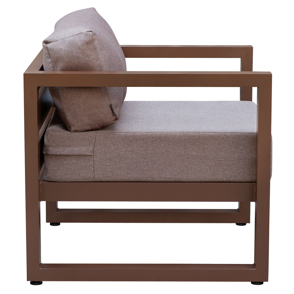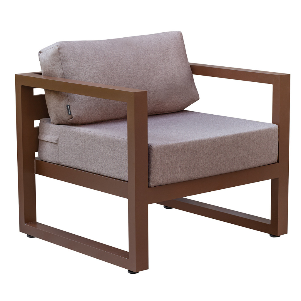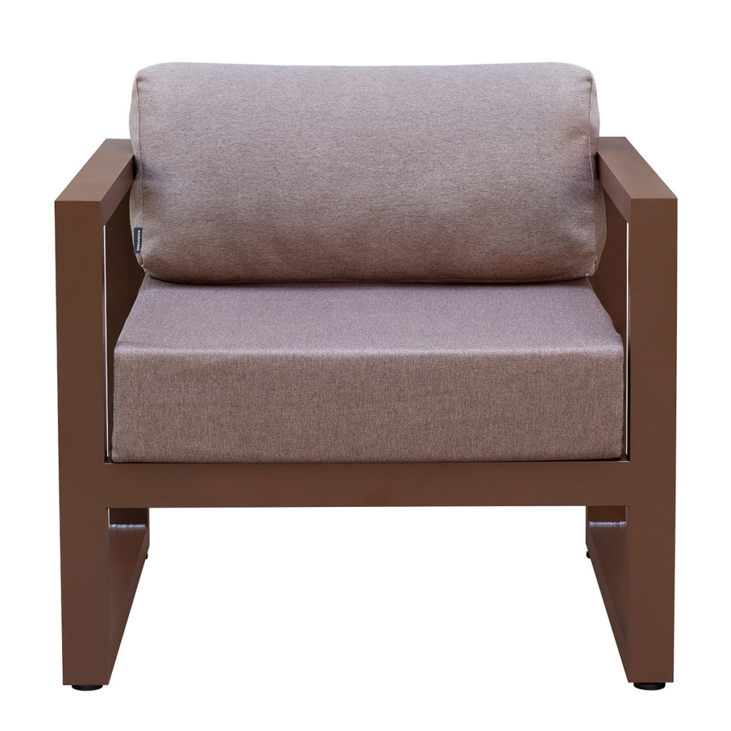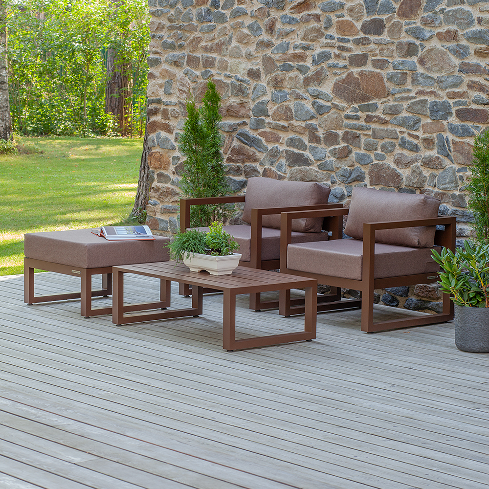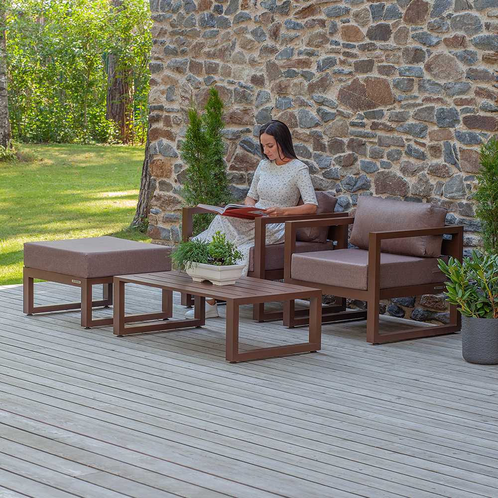 Комплект уличной мебели CAPRI создает комфортное пространство для отдыха в саду, на террасе, у бассейна. В наборе представлены два кресла, пуф и журнальный столик. Каркас мебели выполнен из высокопрочного алюминия, на сиденьях предусмотрены удобные подушки коричневого оттенка.