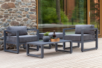 Комплект уличной мебели CAPRI создает комфортное пространство для отдыха в саду, на террасе, у бассейна. В наборе представлены два кресла, пуф и журнальный столик. Каркас мебели выполнен из высокопрочного алюминия, на сиденьях предусмотрены удобные подушки темно-серого оттенка.