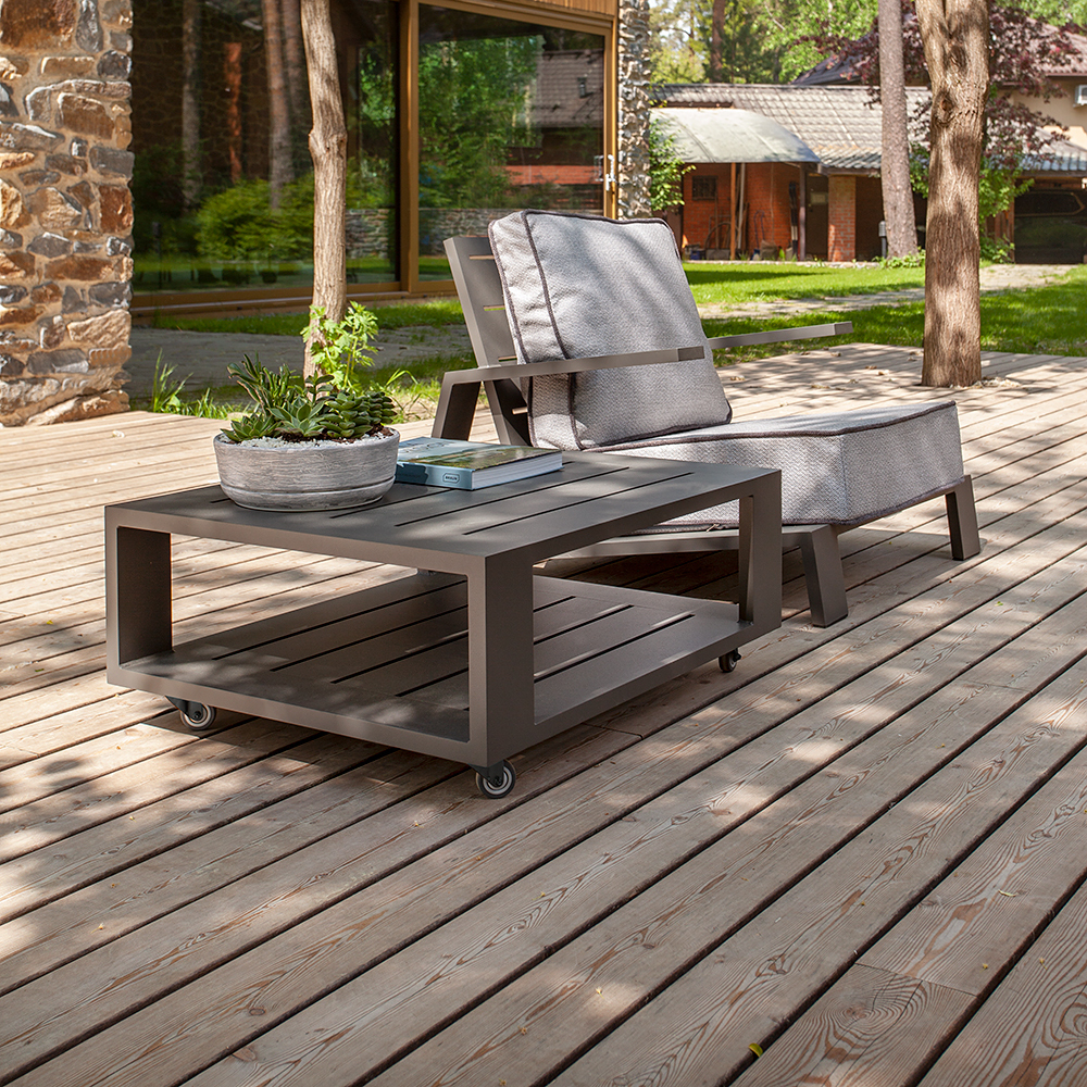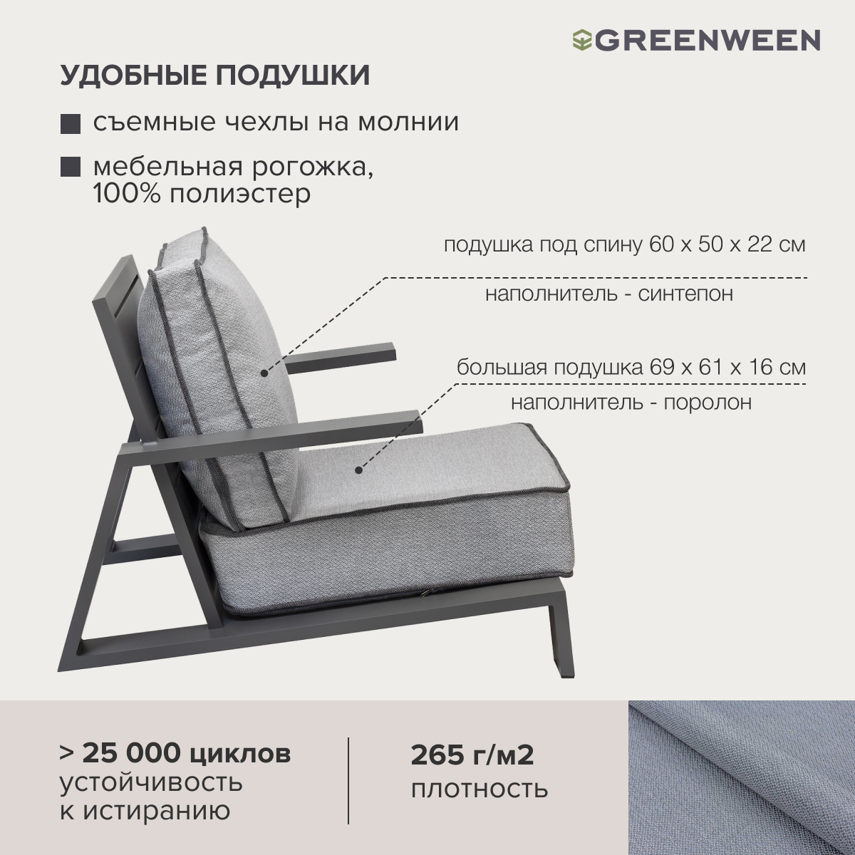 Каркас кресла и столика изготовлен из алюминиевой профильной трубы 100х25 мм и 40х25 мм. Металлическое основание с матовым полимерным покрытием отличается повышенной прочностью, устойчивостью к царапинам. Современное производство Greenween гарантирует надежность и эстетику сварных швов металлической мебели.