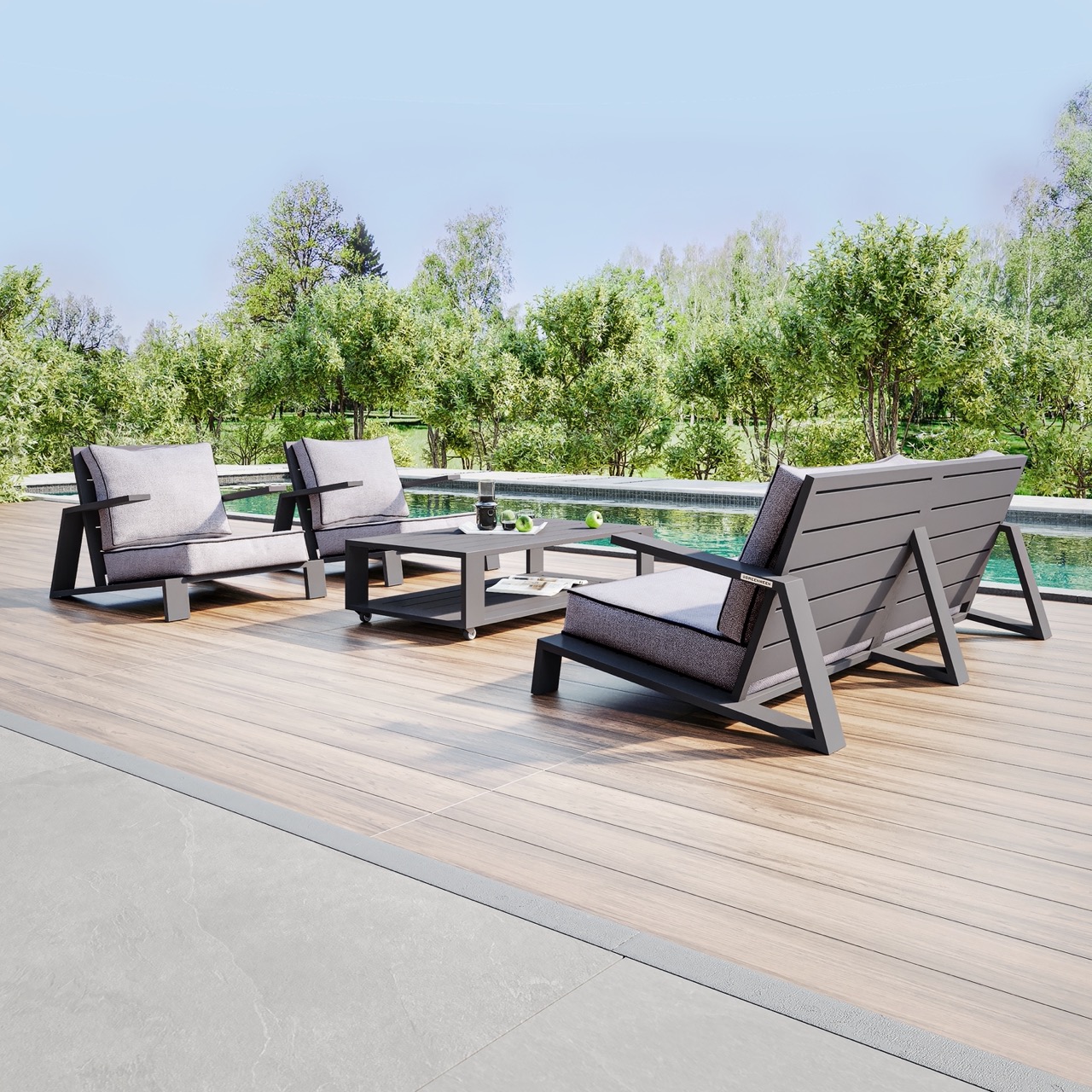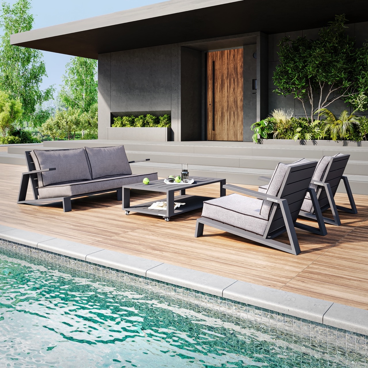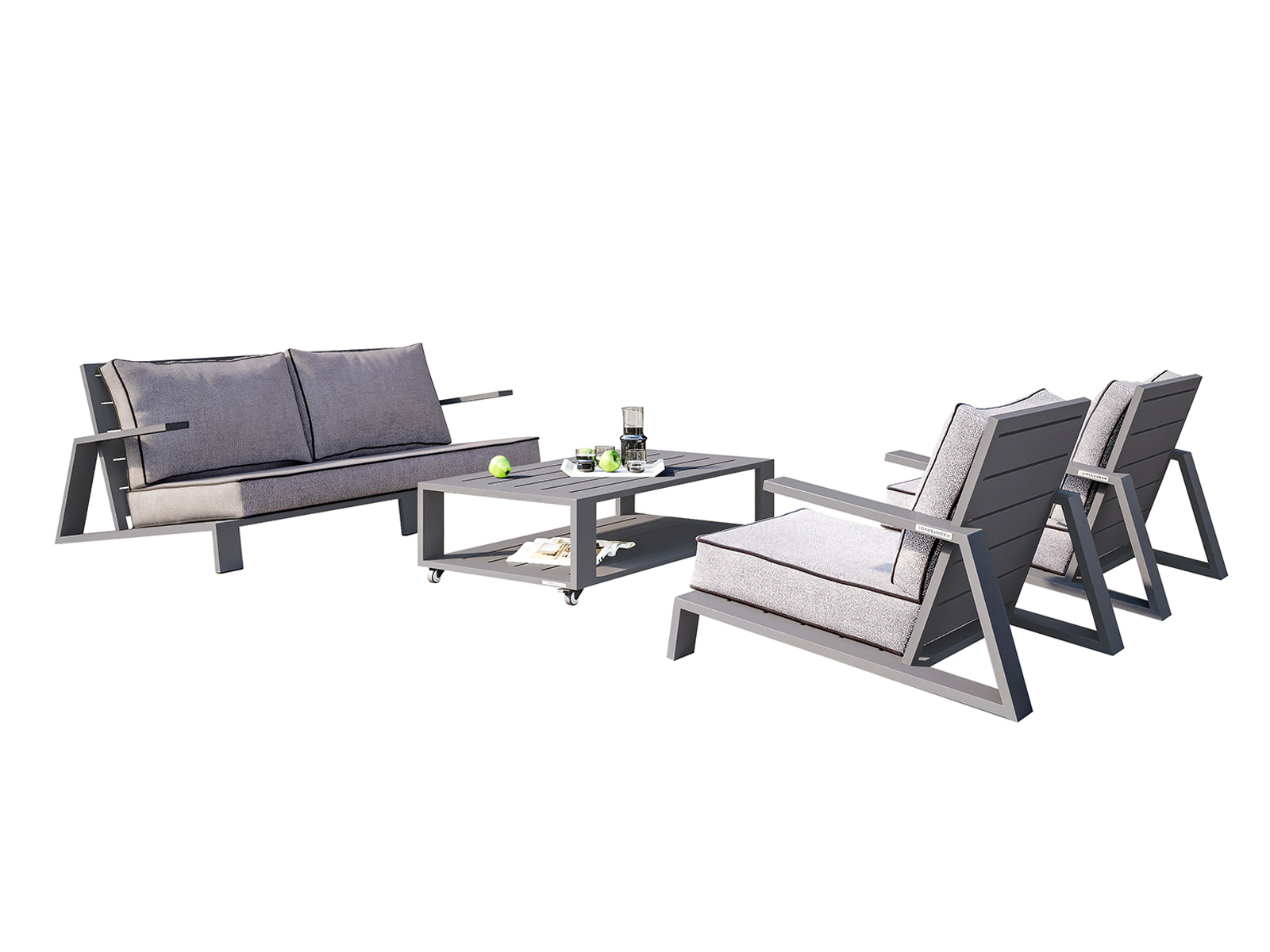 Комплект уличной мебели KORFU привлекает внимание современным дизайном и долговечностью. В большом наборе представлено 4 предмета: диван, 2 кресла и журнальный столик, подойдет для размещения 4-5 человек. Алюминиевая мебель отличается долгим сроком службы, подходит для использования на улице и в помещении, можно разместить на открытой террасе, у бассейна и водоема, в саду и беседке.