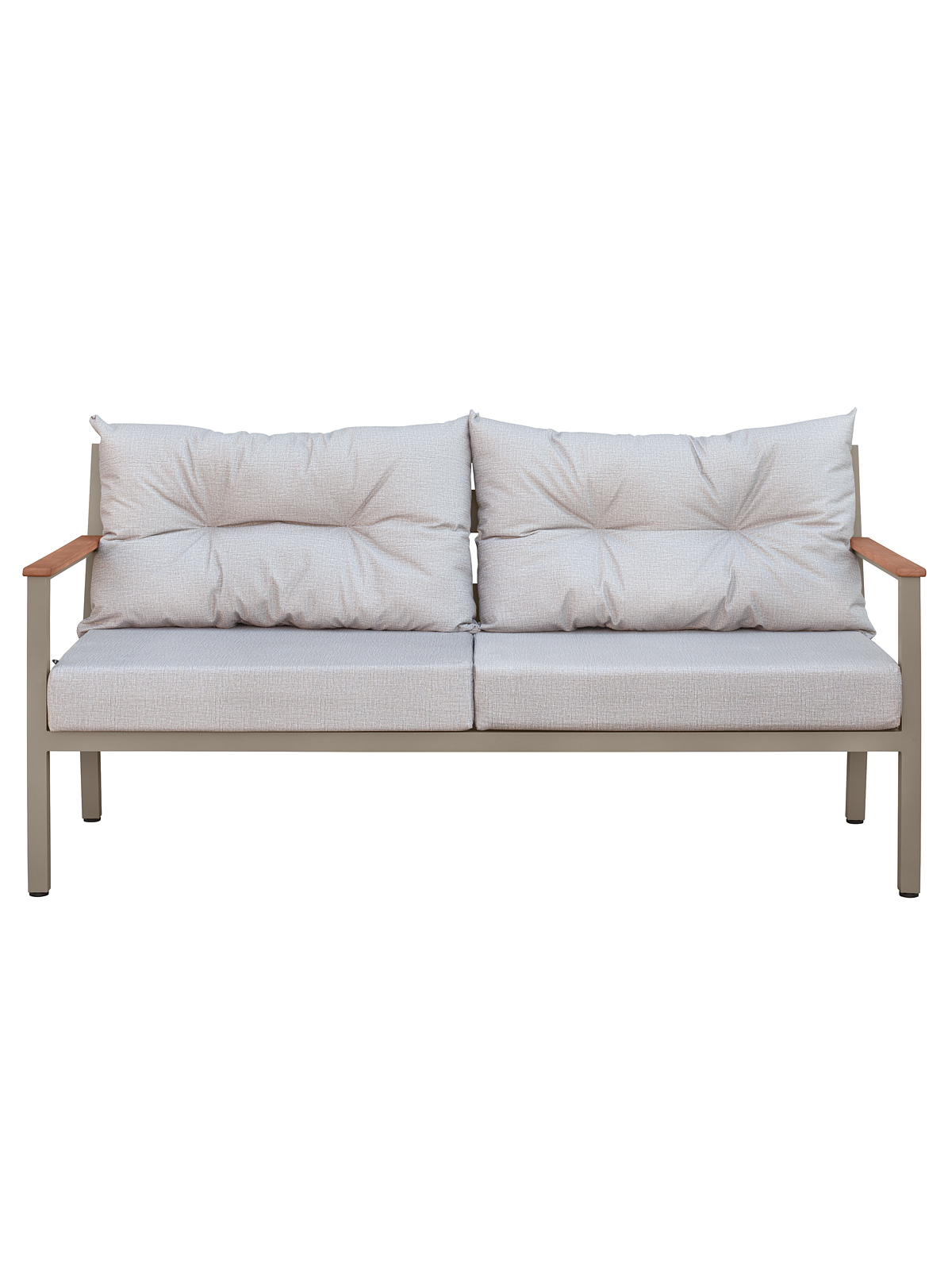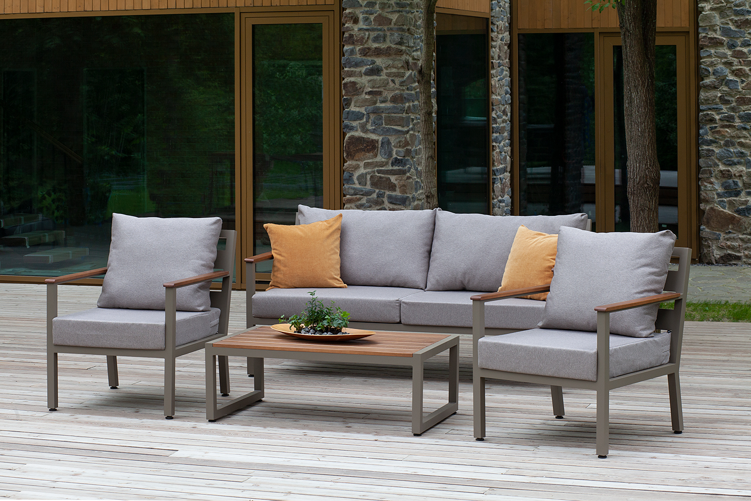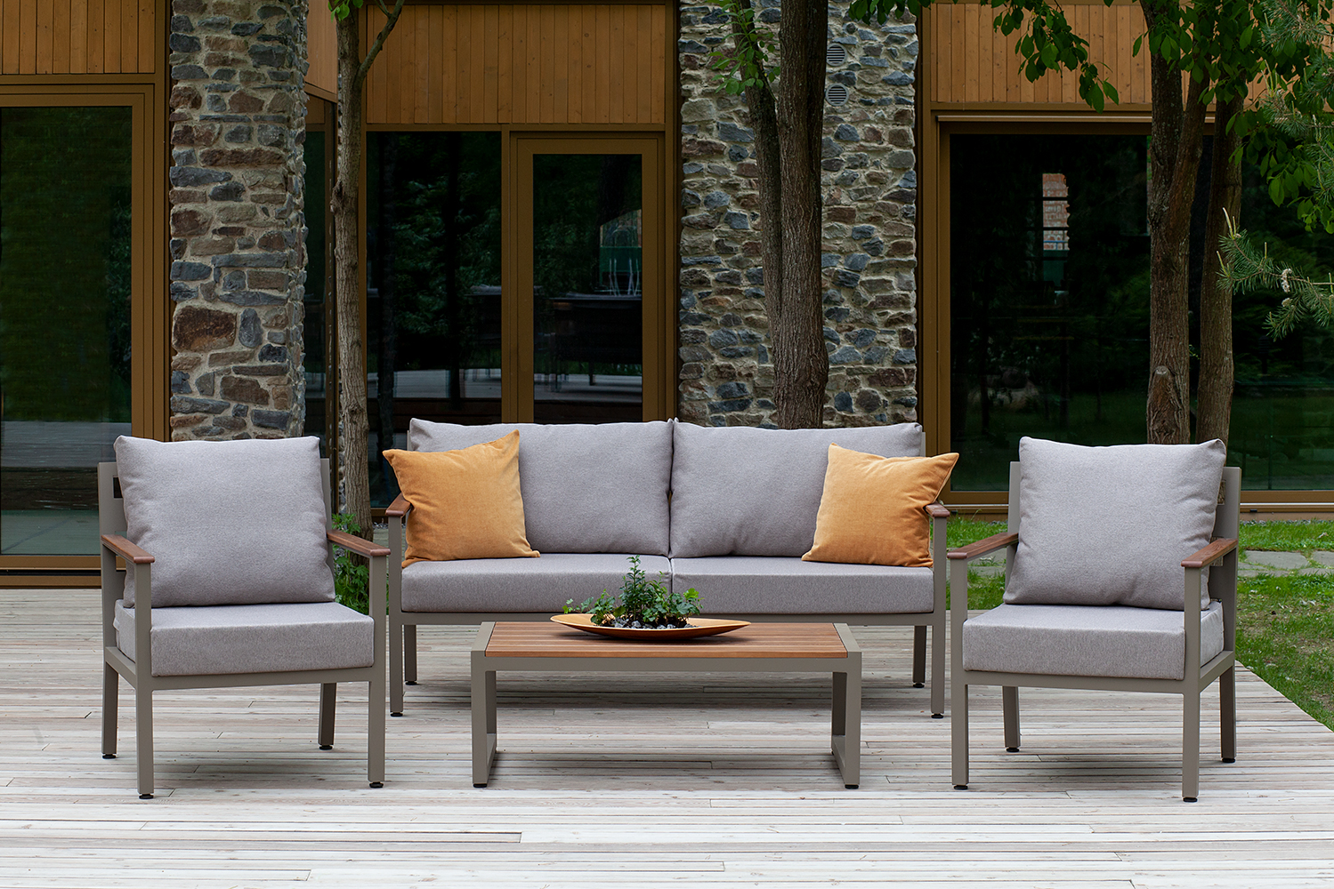 Прочный алюминиевый каркас дивана и кресла дополняют деревянные подлокотники и удобные подушки со съемными чехлами для комфортной посадки. Металлическая мебель подходит для использования на улице и в помещении.