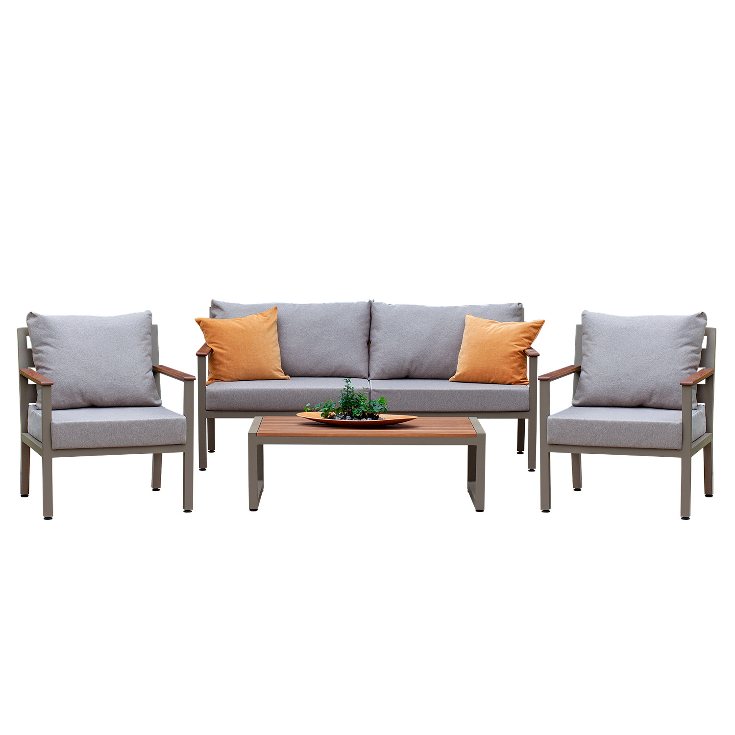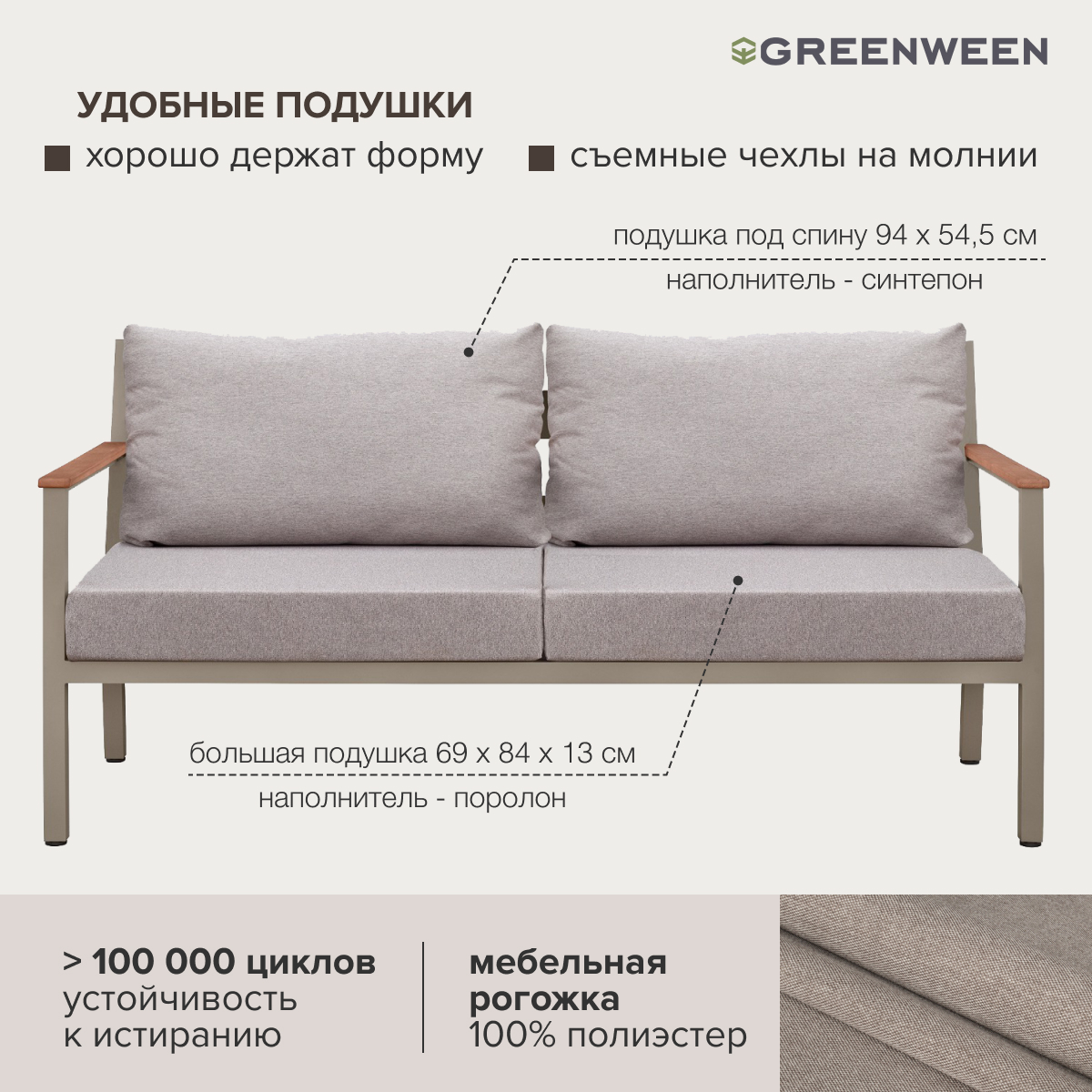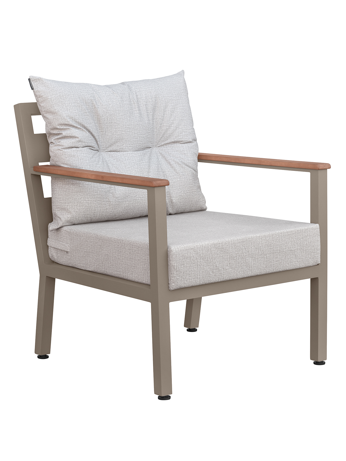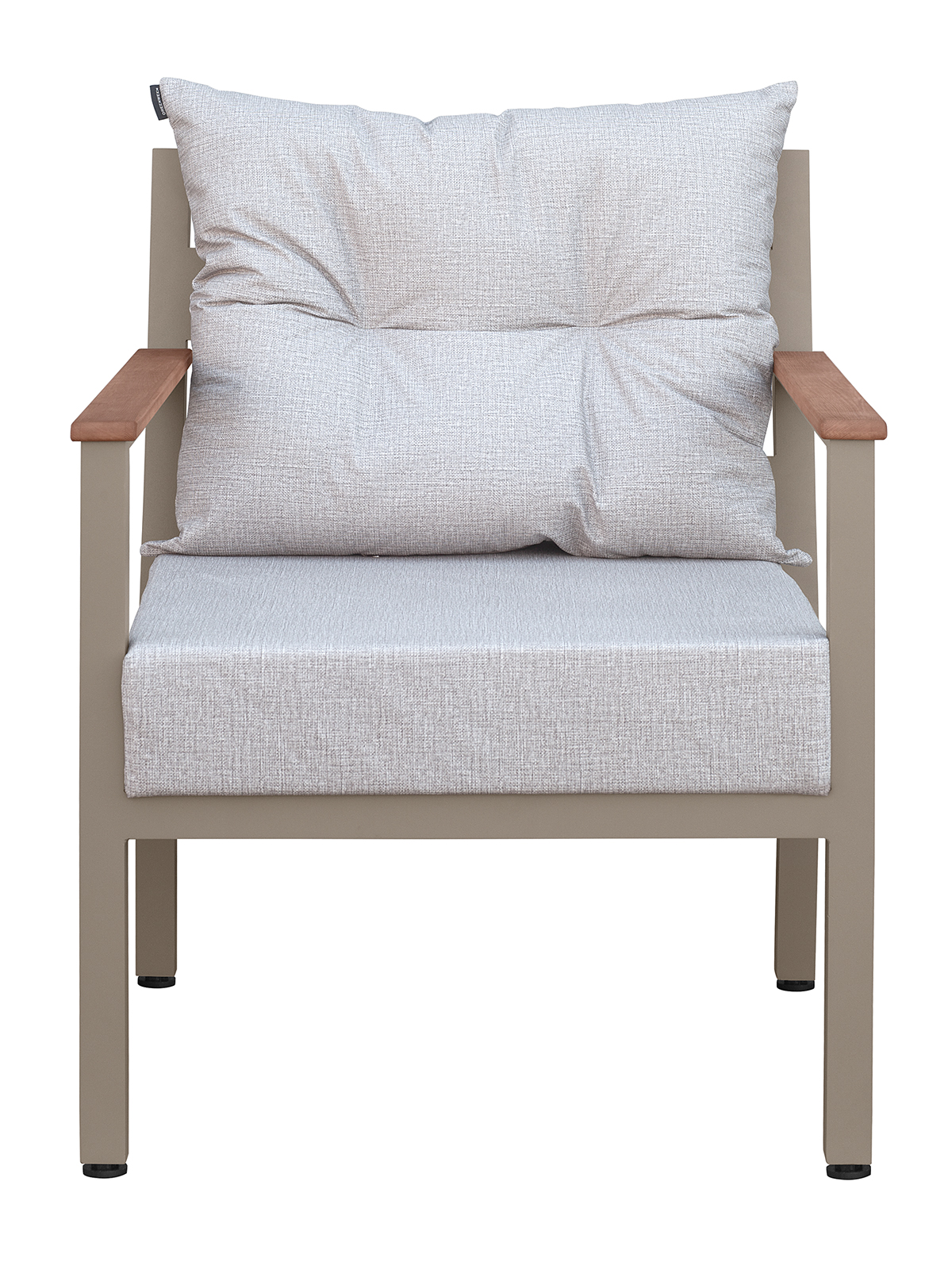 Прочный алюминиевый каркас дивана и кресла дополняют деревянные подлокотники и удобные подушки со съемными чехлами для комфортной посадки. Металлическая мебель подходит для использования на улице и в помещении.