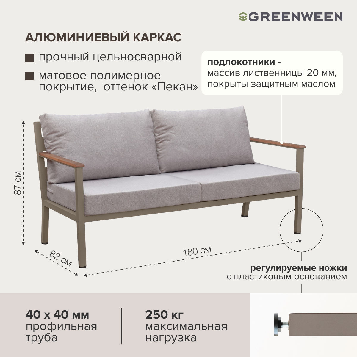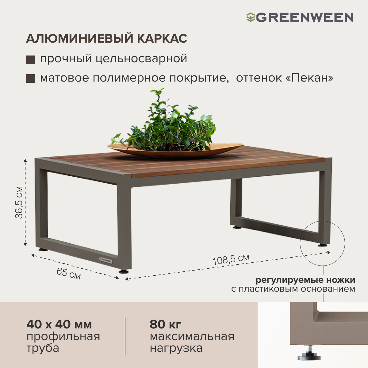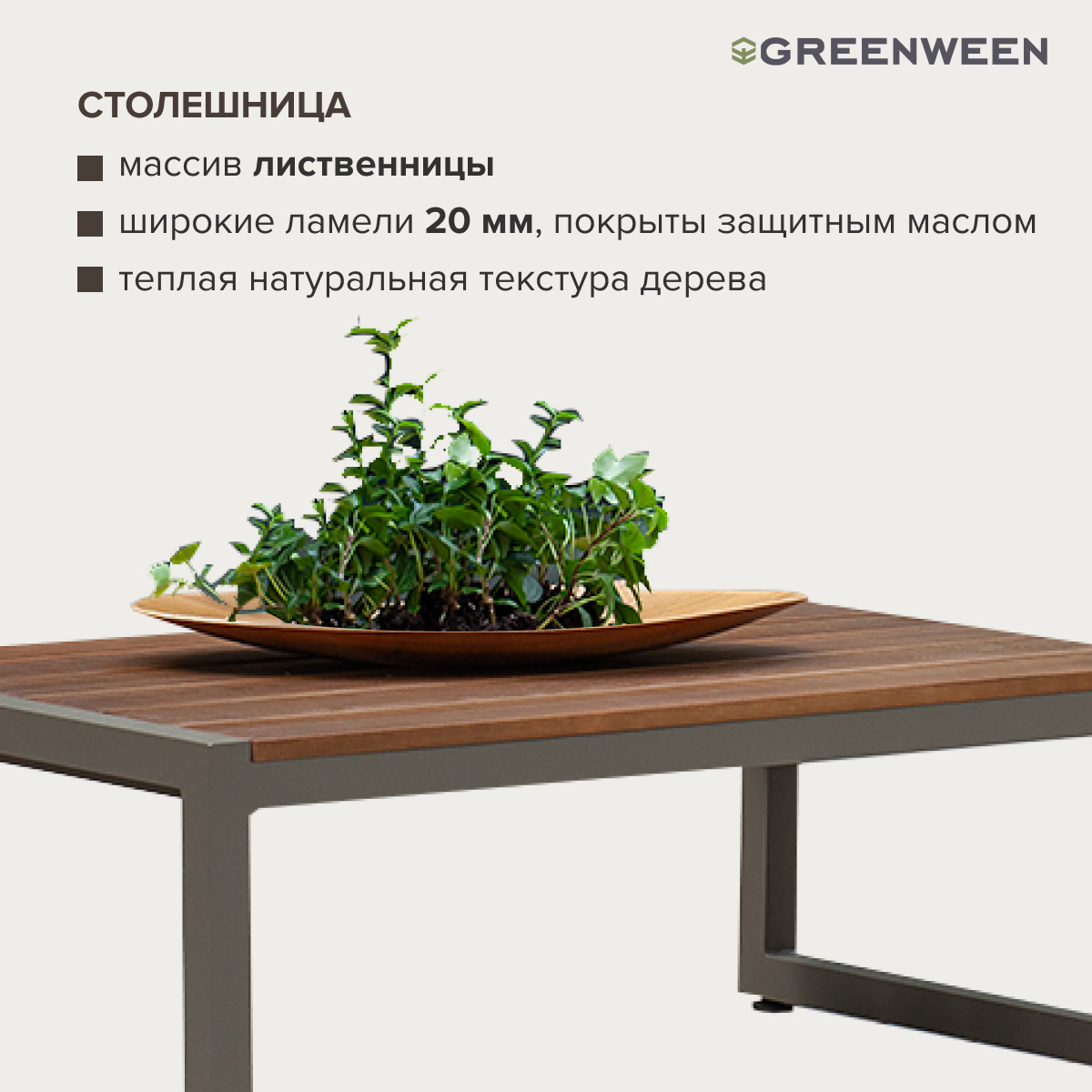 Каркас мебели изготовлен из алюминиевой профильной трубы 40х40 мм. Металлическое основание с матовым полимерным покрытием отличается повышенной прочностью, устойчивостью к царапинам. Современное производство Greenween гарантирует надежность и эстетику сварных швов металлической мебели.