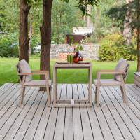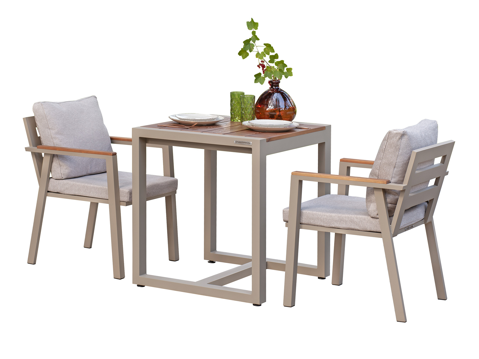 В уличном комплекте SANTORINI представлены обеденный стол и 2 стула. Каркас мебели изготовлен из высокопрочного алюминия с полимерным покрытием теплого оттенка пекан. Столешница и подлокотники выполнены из массива лиственницы. Для комфортной посадки в комплекте идут мягкие подушки в съемных чехлах.