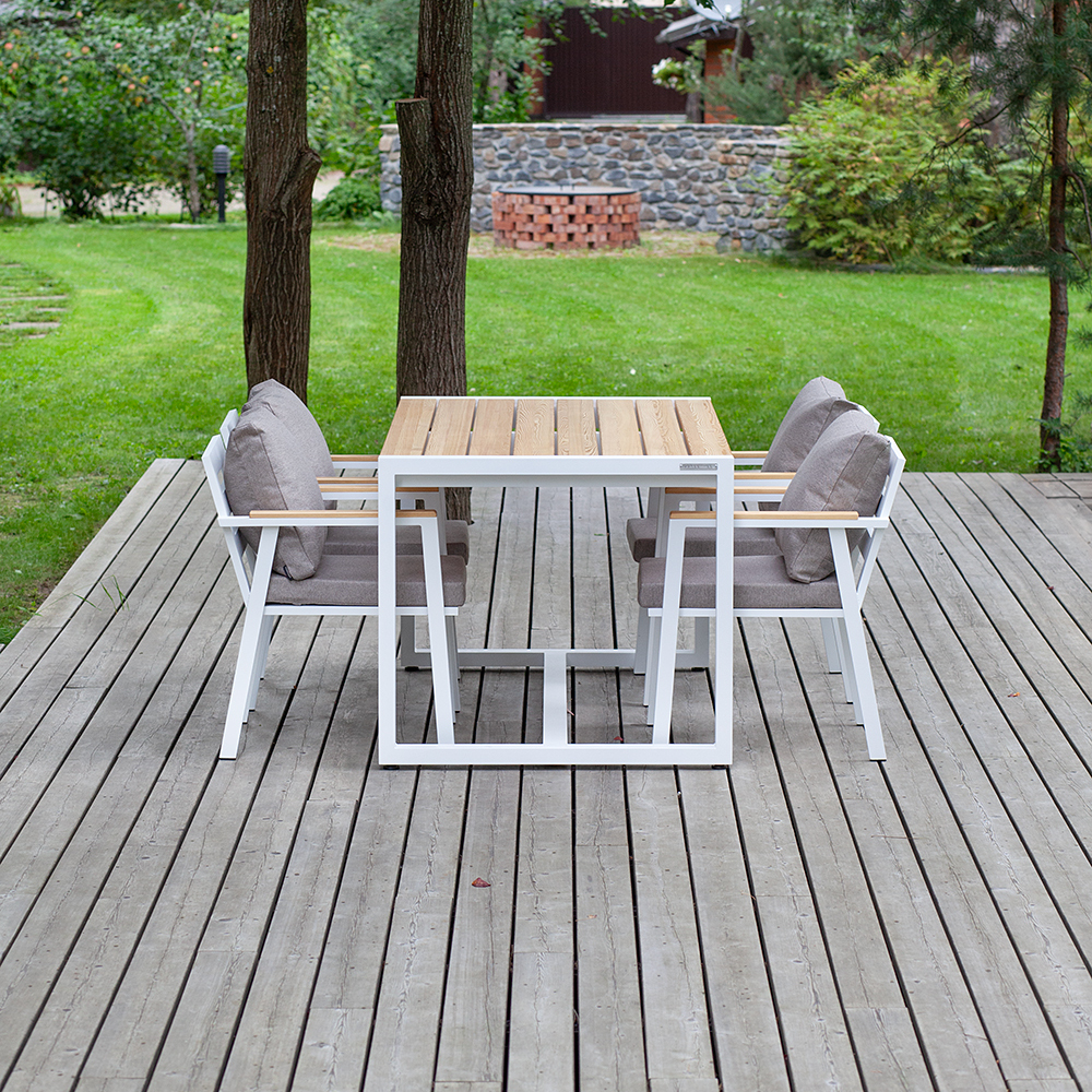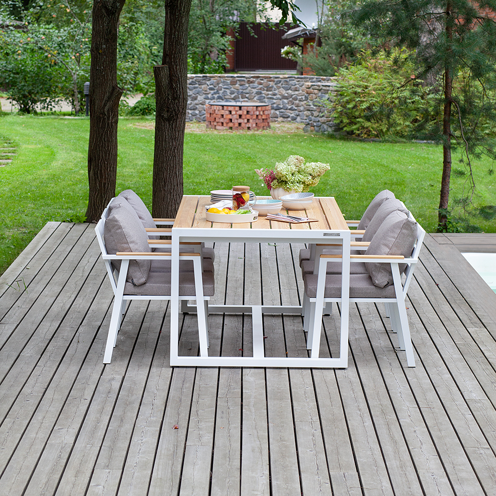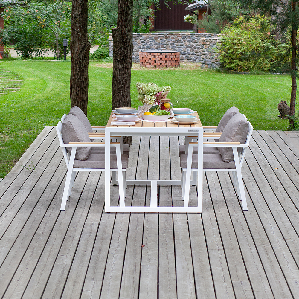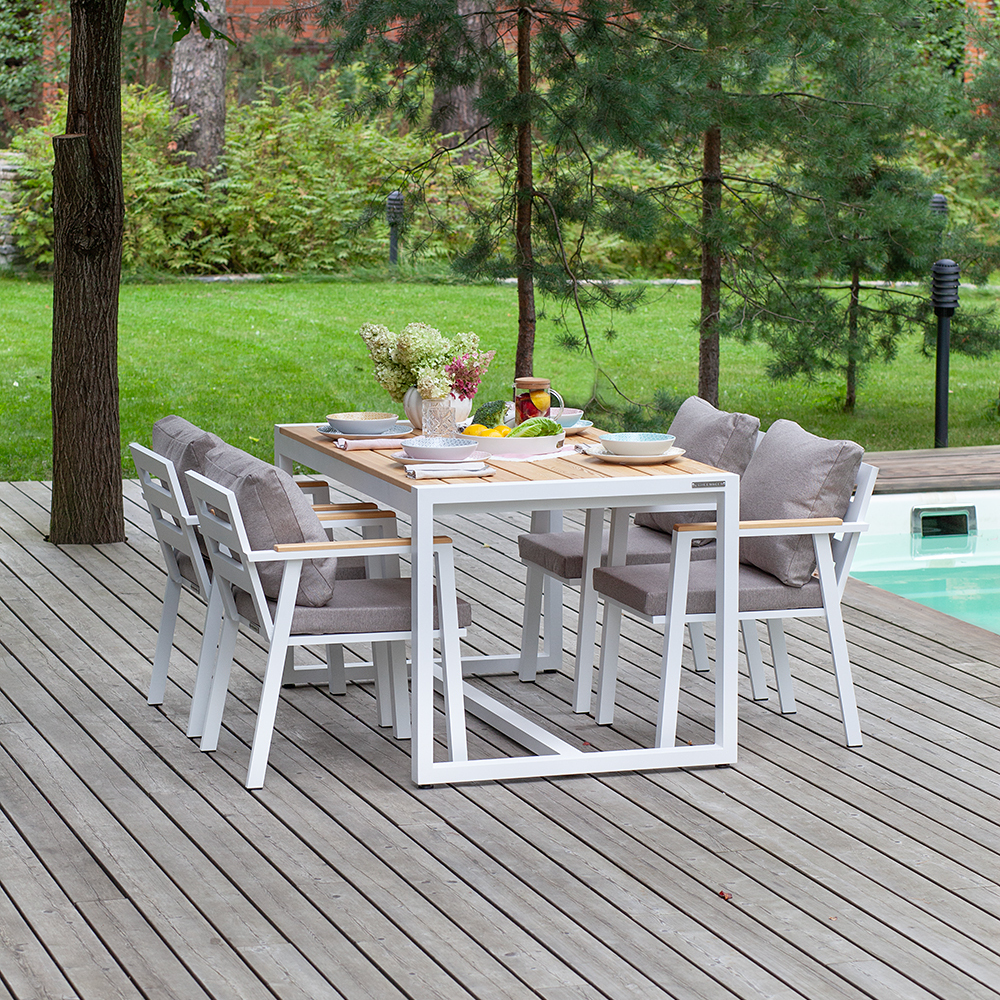 Коллекция садовой мебели SANTORINI привлекает внимание элегантным дизайном и долговечностью. В уличном комплекте представлены большой обеденный стол и 4 удобных стула. Каркас мебели изготовлен из высокопрочного алюминия с полимерным покрытием в белый цвет. Столешница и подлокотники выполнены из массива лиственницы.