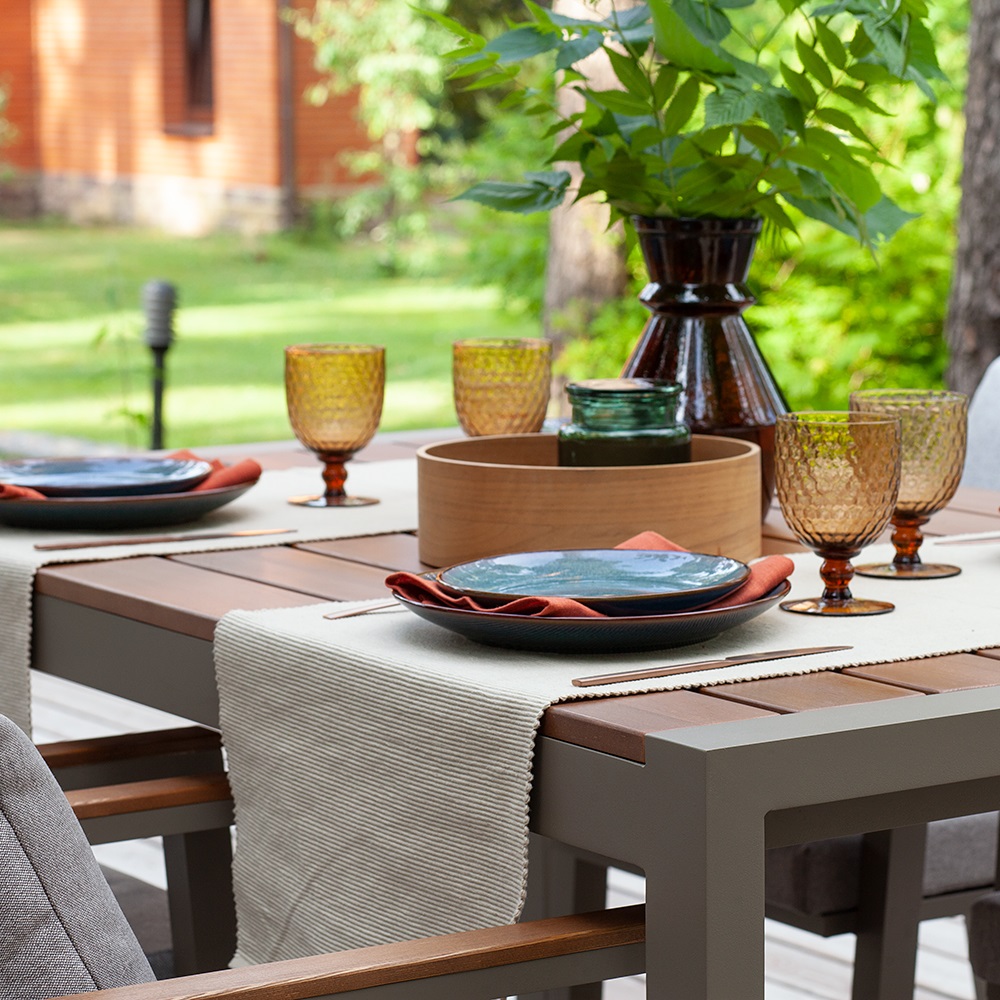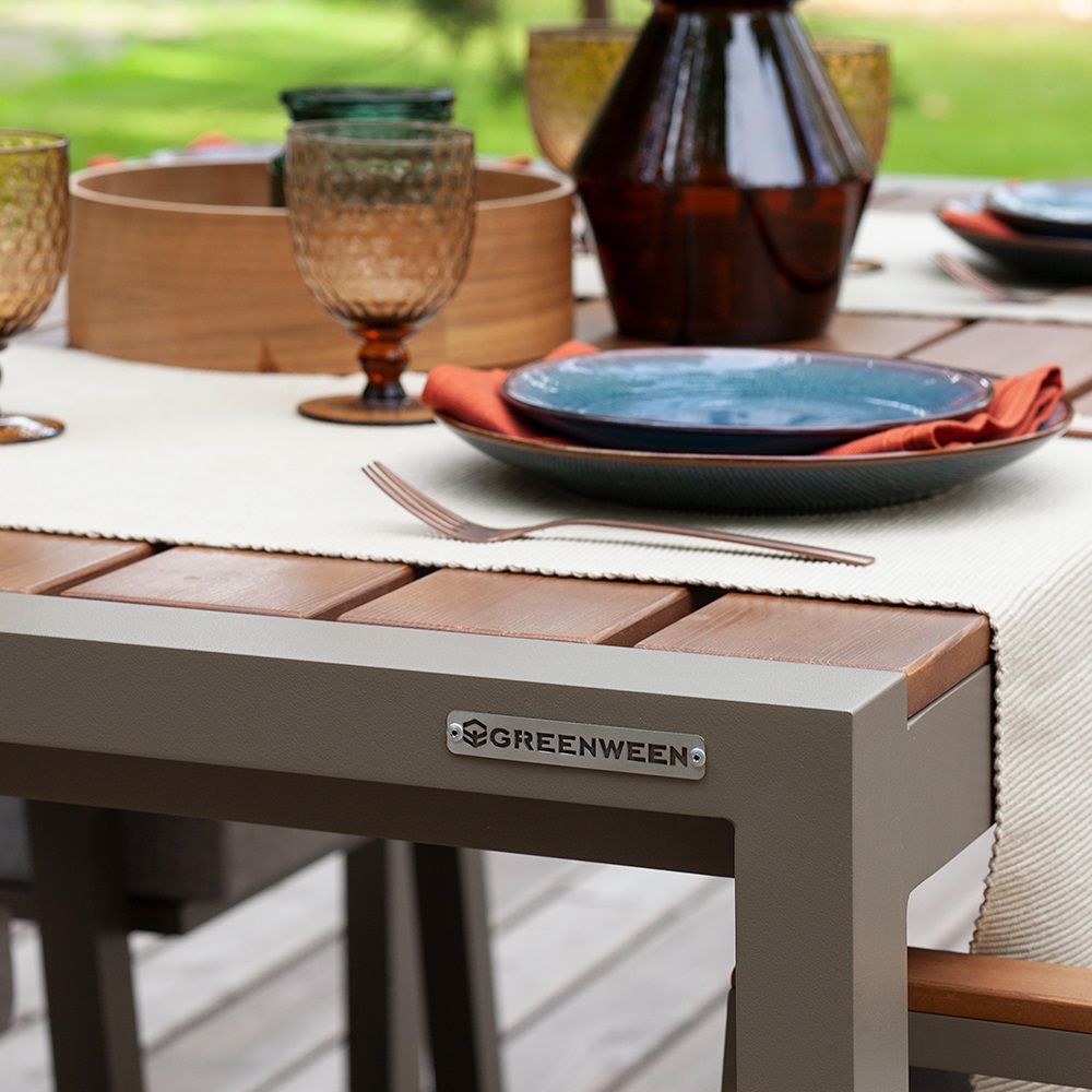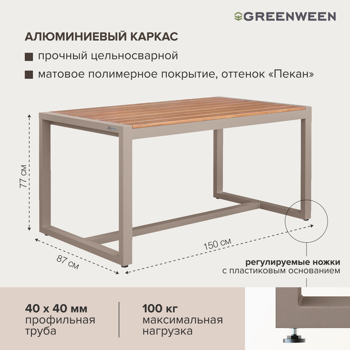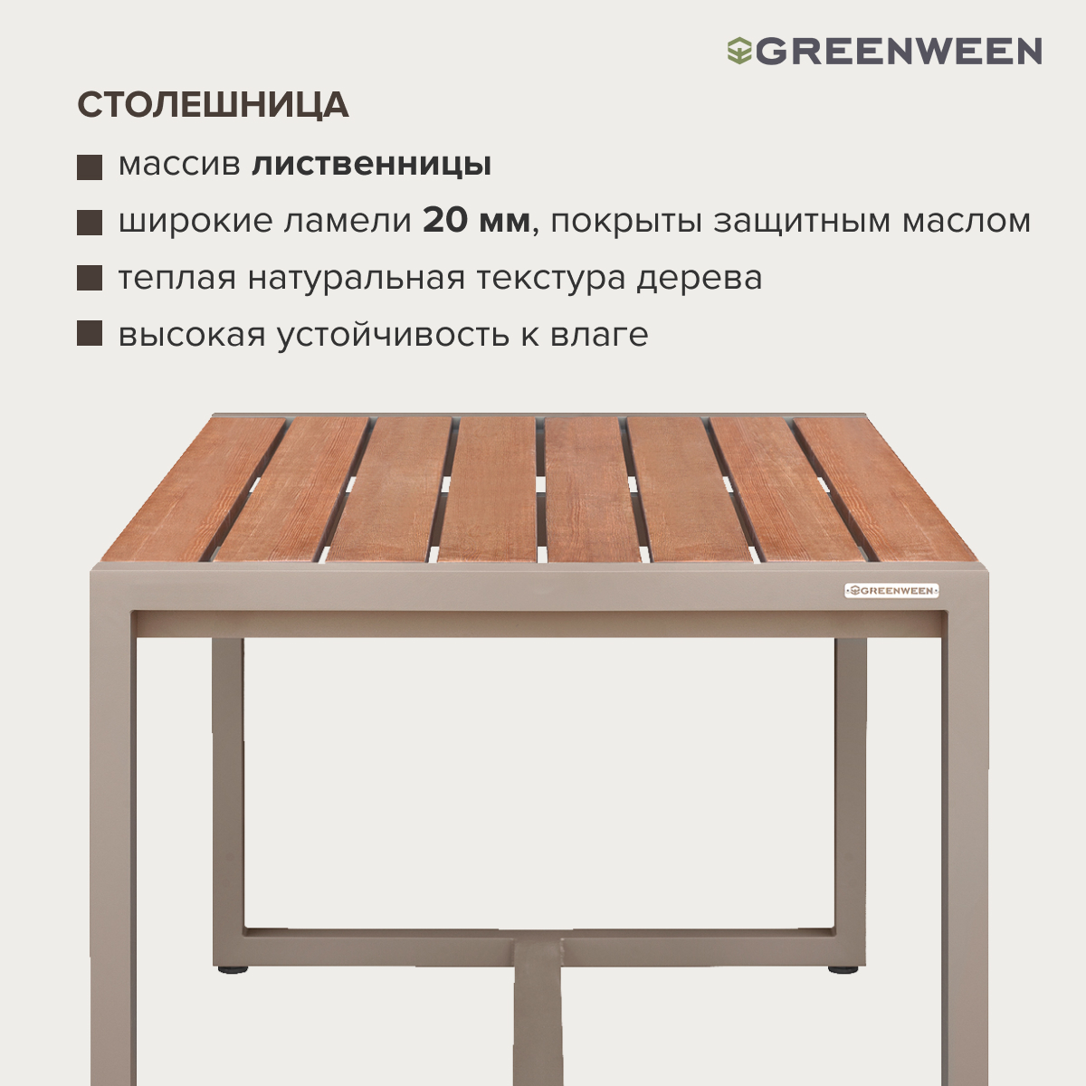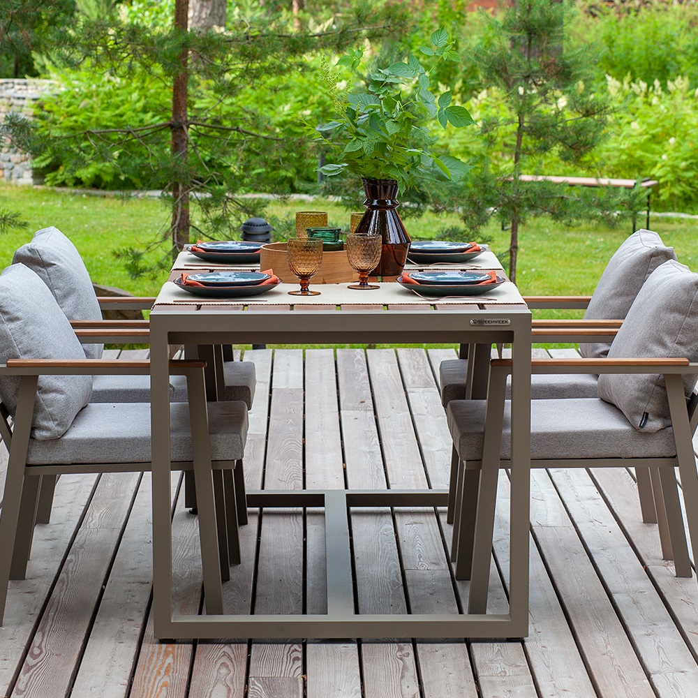 Каркас обеденной группы изготовлен из алюминиевой профильной трубы. Металлическое основание с матовым полимерным покрытием отличается повышенной прочностью, устойчивостью к царапинам. Профессиональная порошковая покраска обеспечивает долговечность и легкость в уходе. Современное производство Greenween гарантирует надежность и эстетику сварных швов металлической мебели.