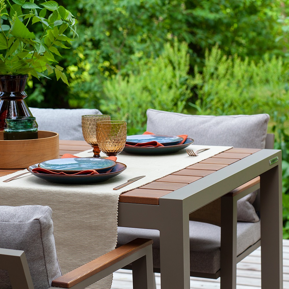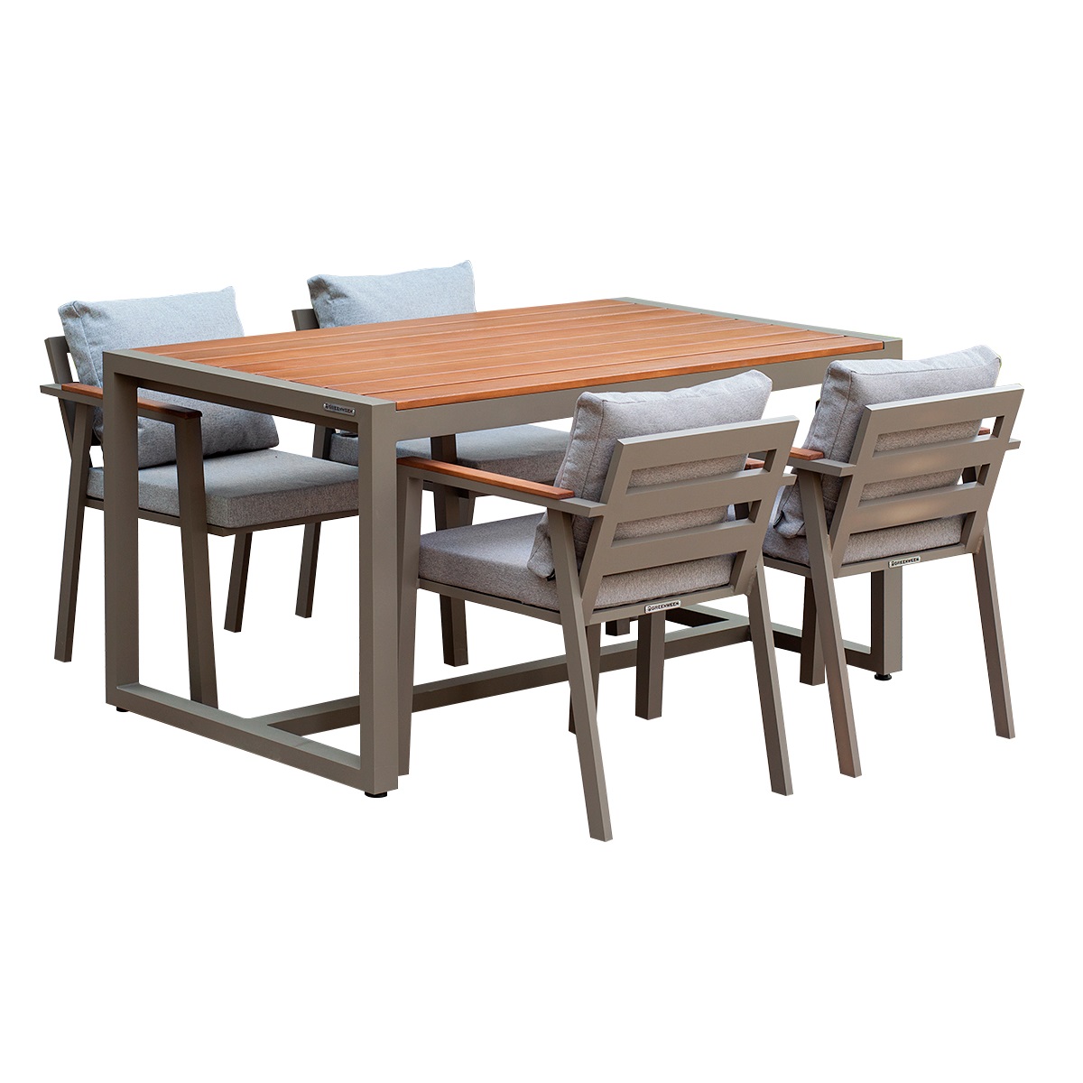 Коллекция садовой мебели SANTORINI привлекает внимание элегантным дизайном и долговечностью. В уличном комплекте представлены большой обеденный стол и 4 удобных стула. Каркас мебели изготовлен из высокопрочного алюминия, окрашен в теплый оттенок пекан. Столешница и подлокотники выполнены из массива лиственницы.