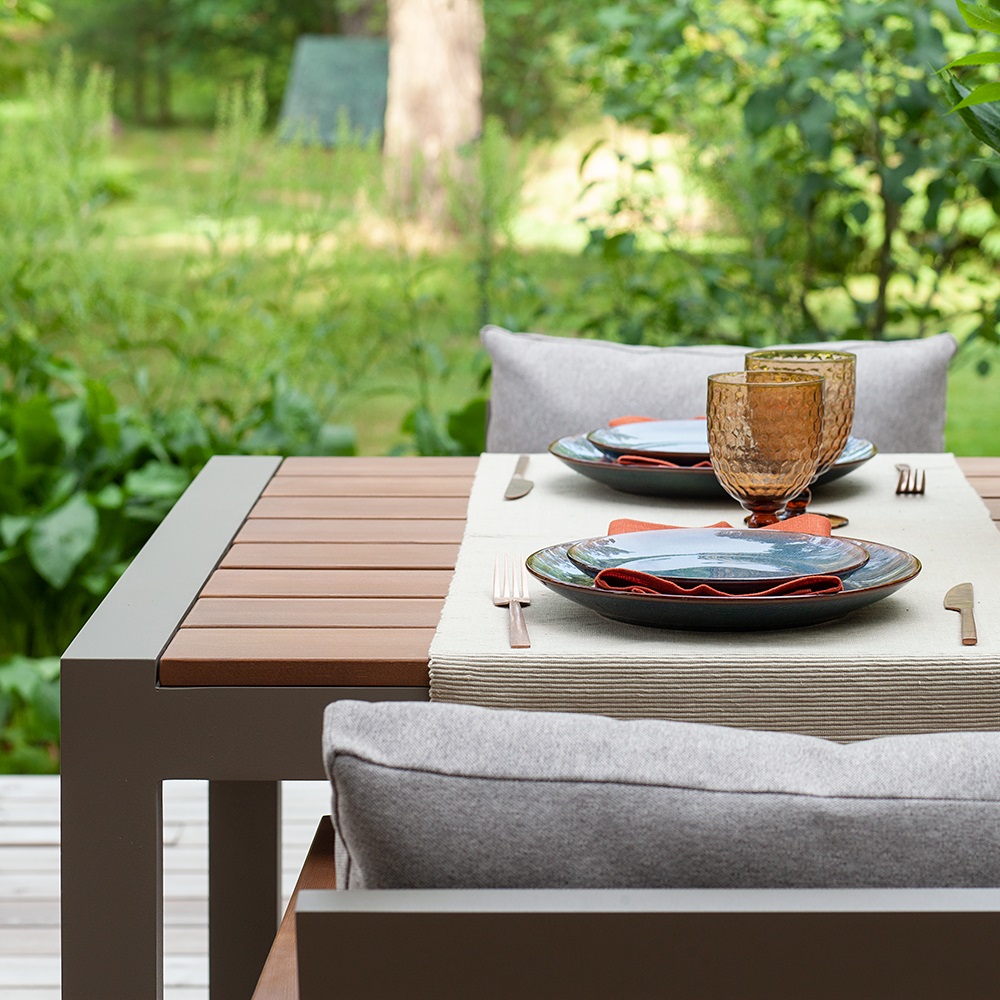 Столешница и подлокотники выполнены из массива лиственницы толщиной 20 мм, деревянные ламели покрывают защитным маслом, которое обеспечивает устойчивость к влиянию внешней среды. Теплая натуральная текстура дерева подарит комфорт и приятные тактильные ощущения.