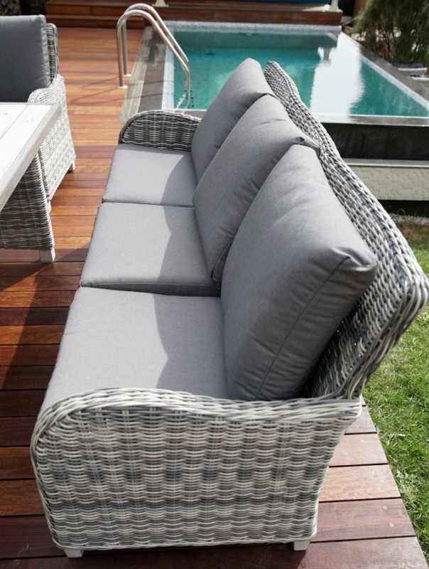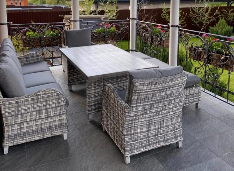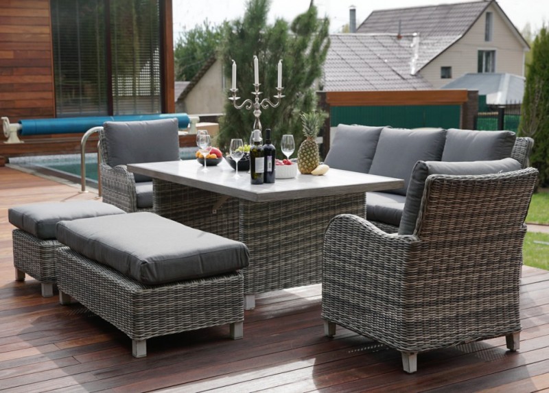 Благодаря наличию большого дивана и кресел, а также пуфов различного размера и обеденного стола данная коллекция предоставляет отличные условия как для семейных трапез, так и для отдыха. При необходимости любой предмет набора можно легко переместить в нужное место, что обеспечивается незначительным весом мебели.Ницца – мебель для дачи на долгое время