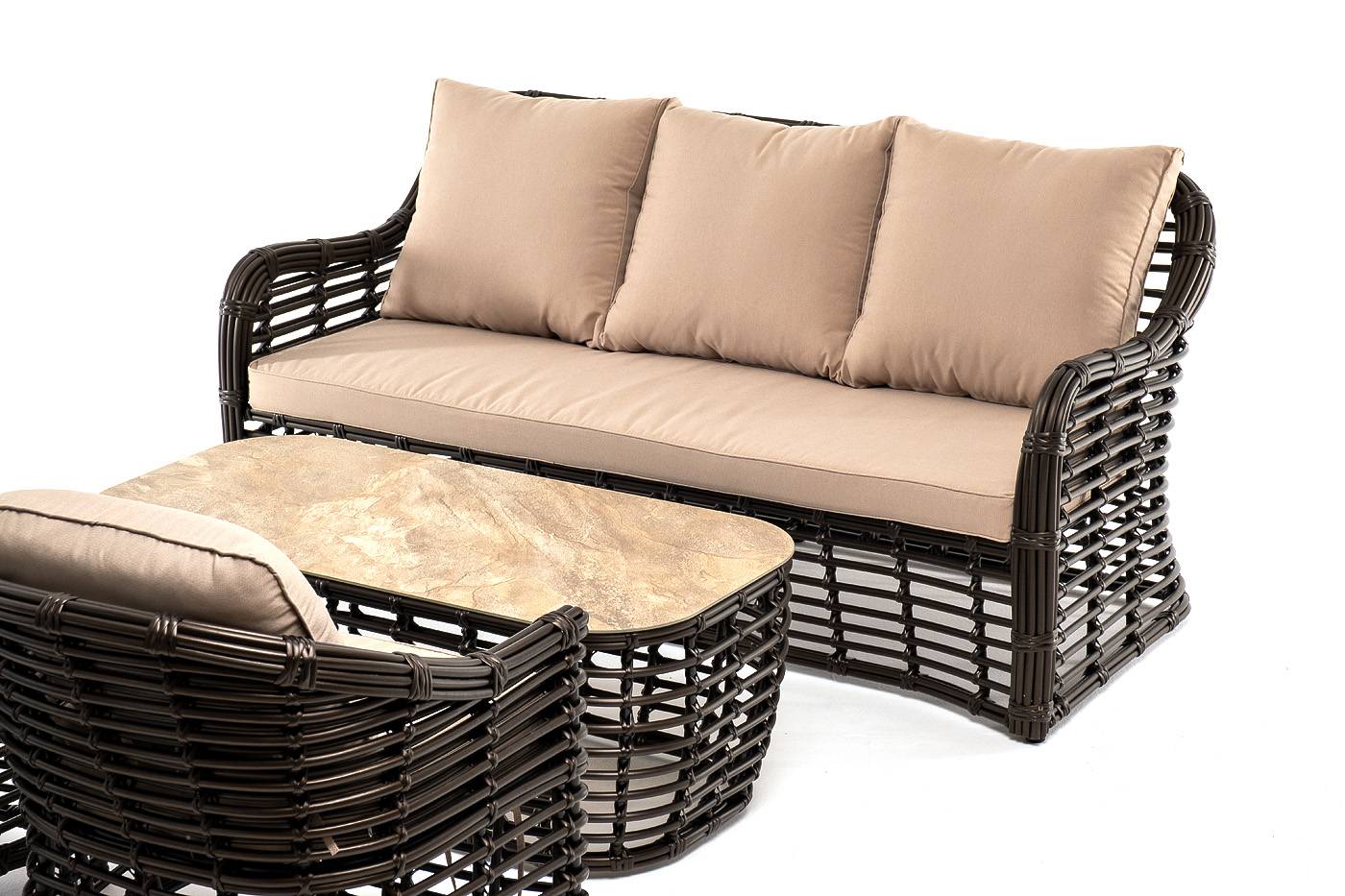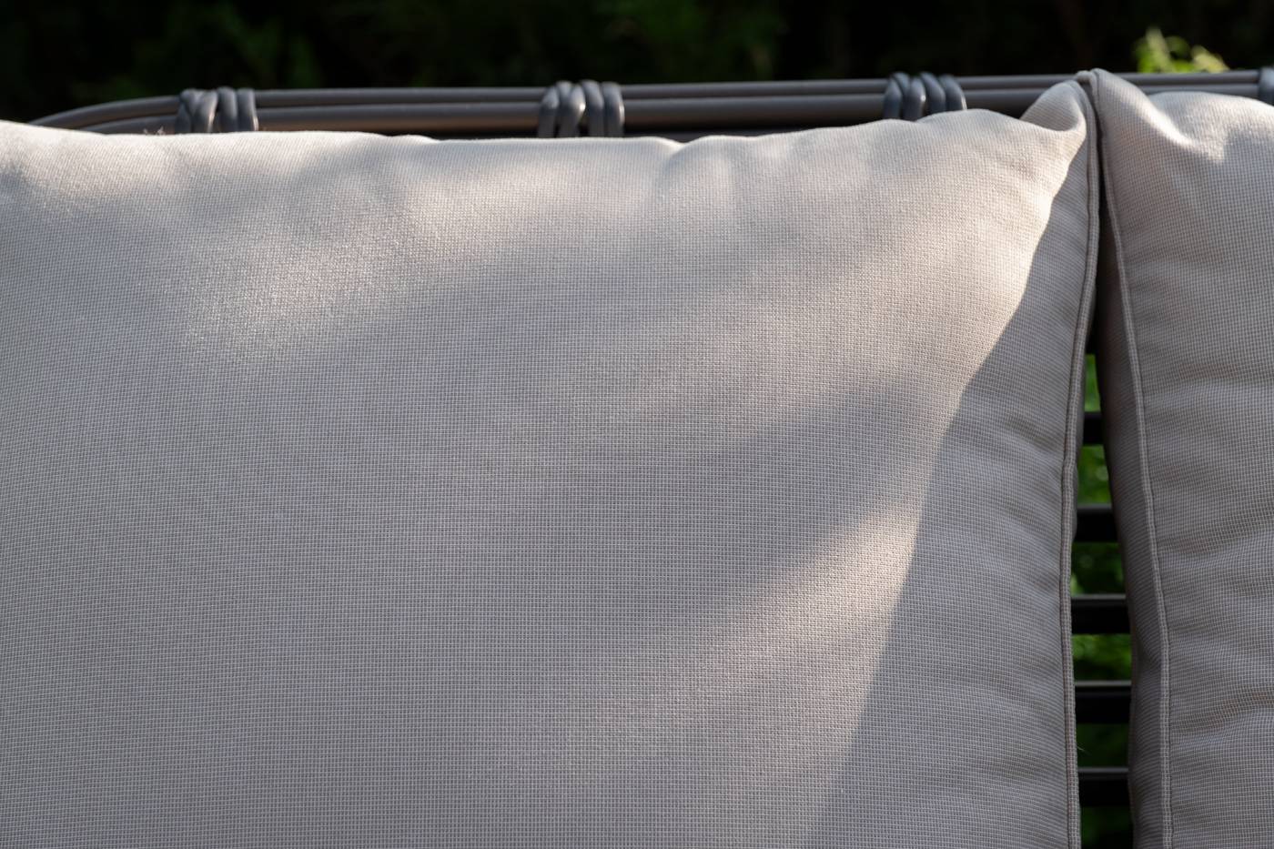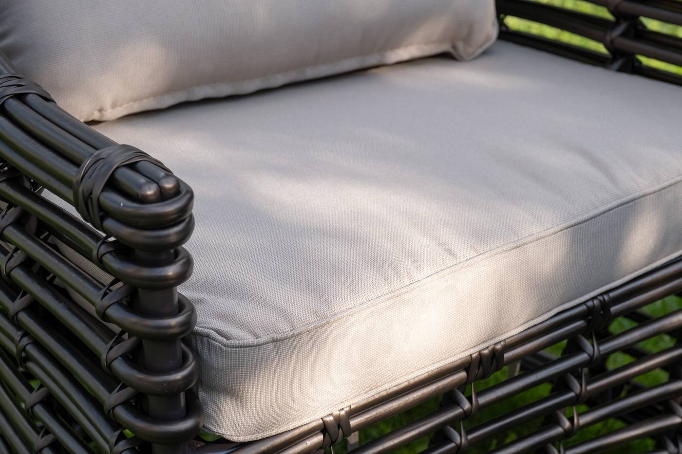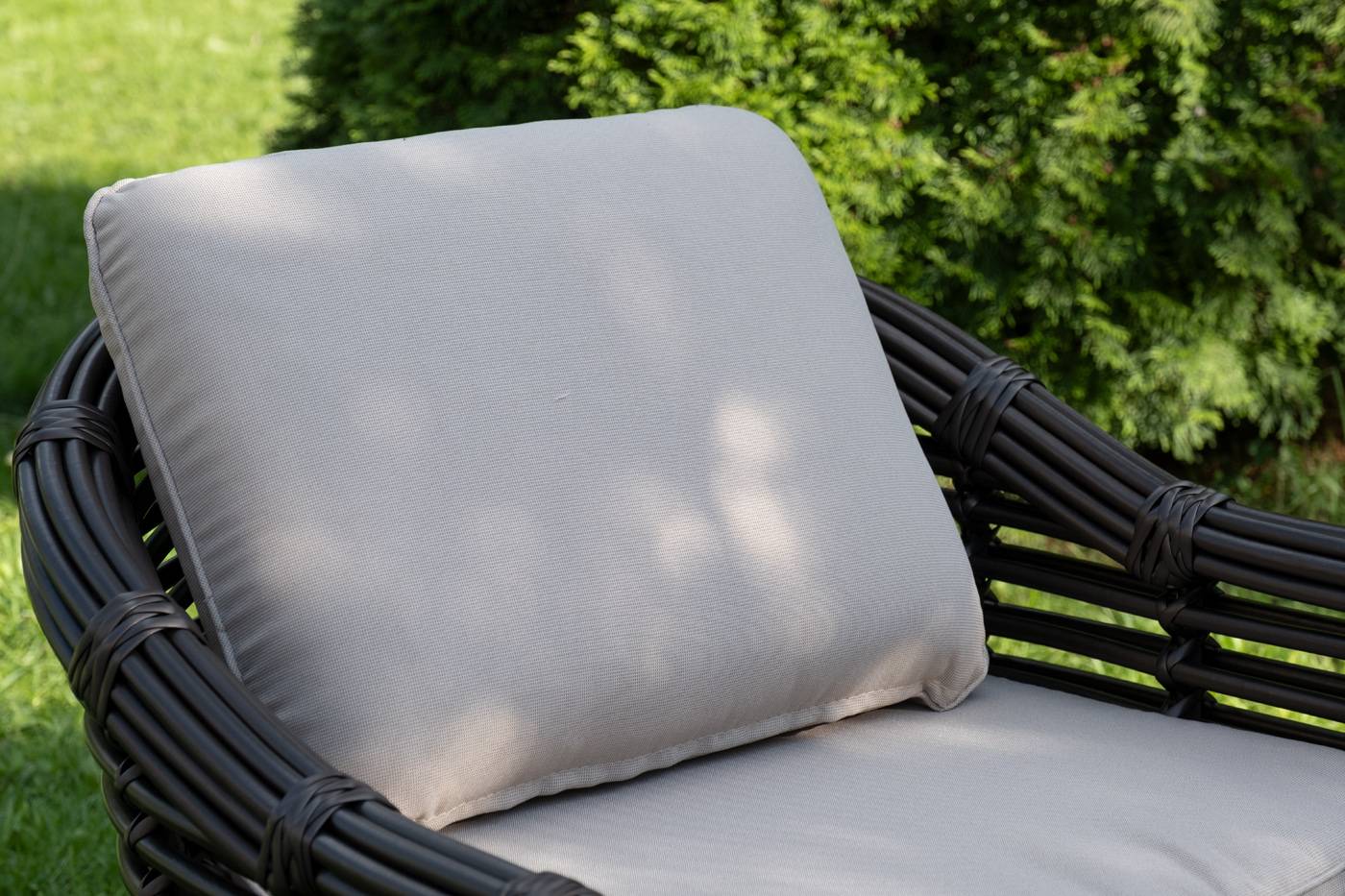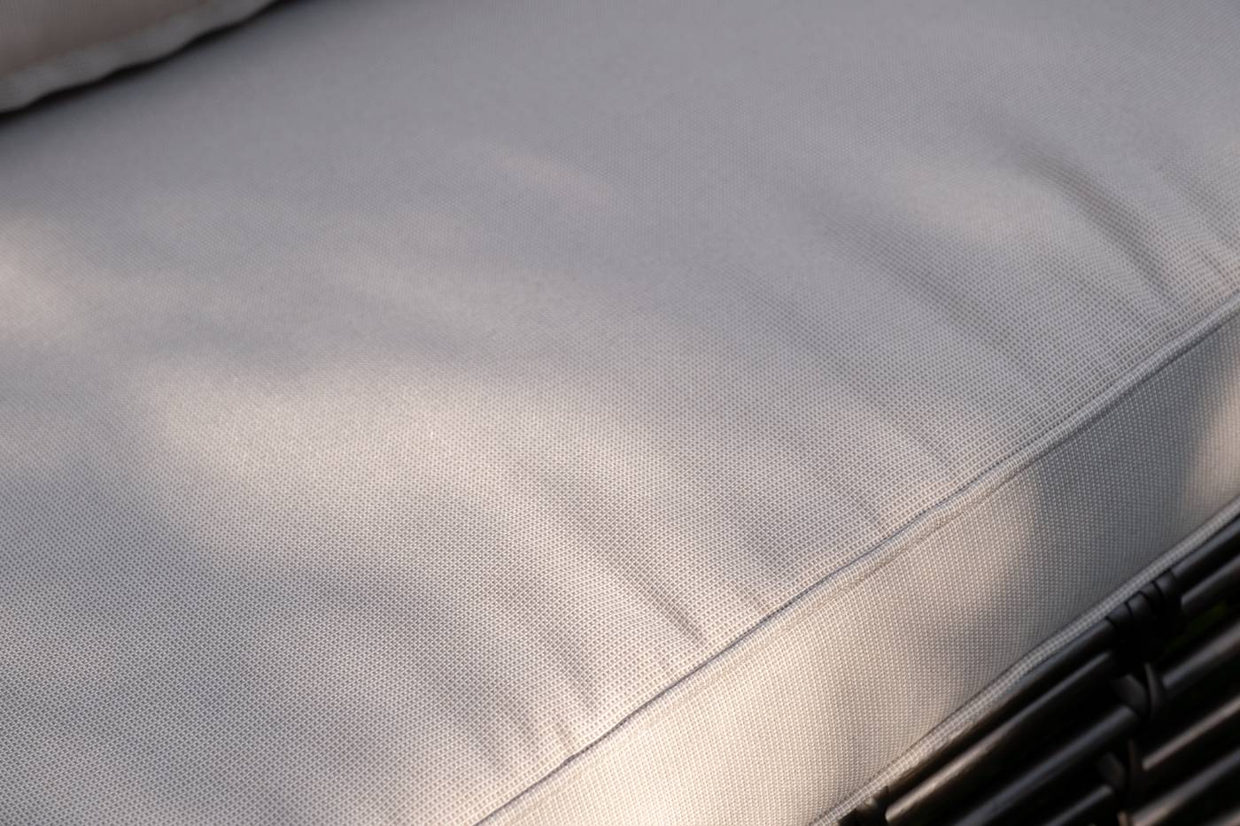 Плетеная мебель дополнена удобными подушками в бежевых чехлах. При их изготовлении используют полиэстер, плотность – 300гр/м2. Он обрабатывается влагоотталкивающей пропиткой для повышения защитных свойств материала.