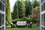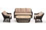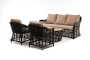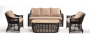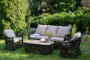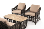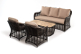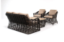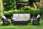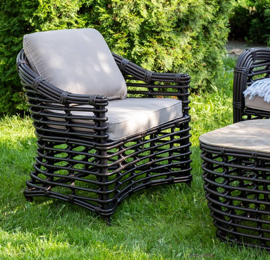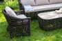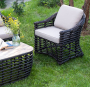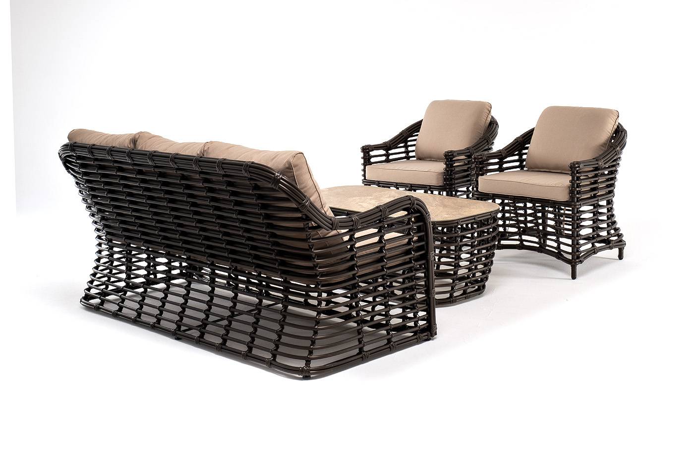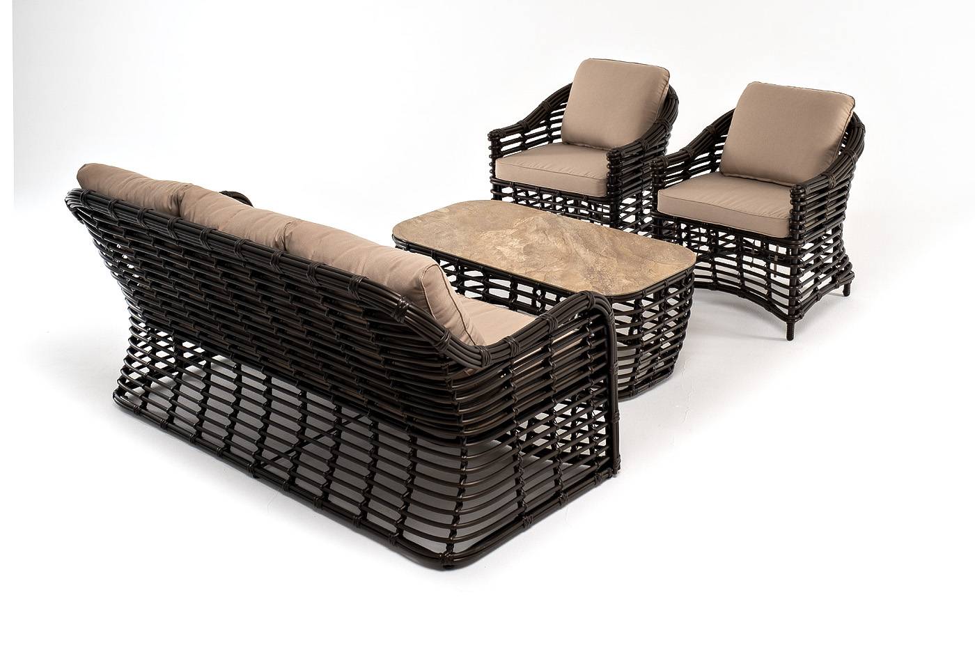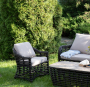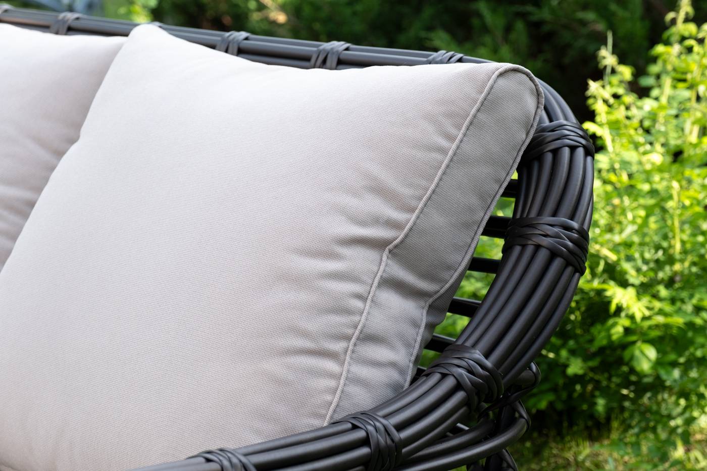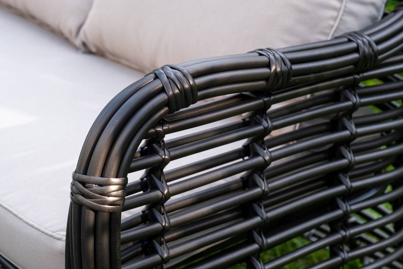 Плетеная мебель дополнена удобными подушками в бежевых чехлах. При их изготовлении используют полиэстер, плотность – 300гр/м2. Он обрабатывается влагоотталкивающей пропиткой для повышения защитных свойств материала.