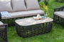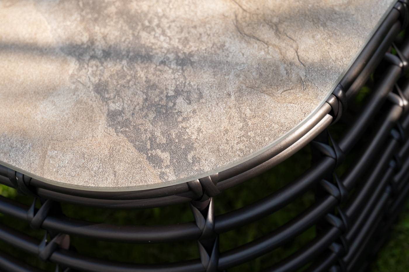 Журнальный столик выполнен из алюминия, вручную оплетенного круглым искусственным ротангом. Столешница из закаленного стекла толщиной 5 мм. Благодаря износостойким материалам, стол пригоден для использования на улице при любой погоде и не требует специальных условий хранения.