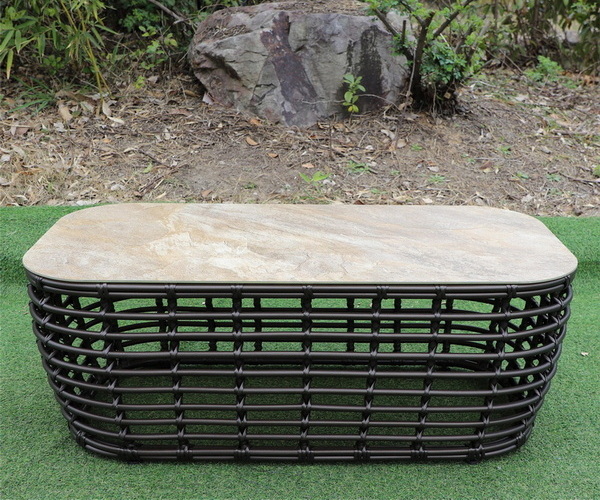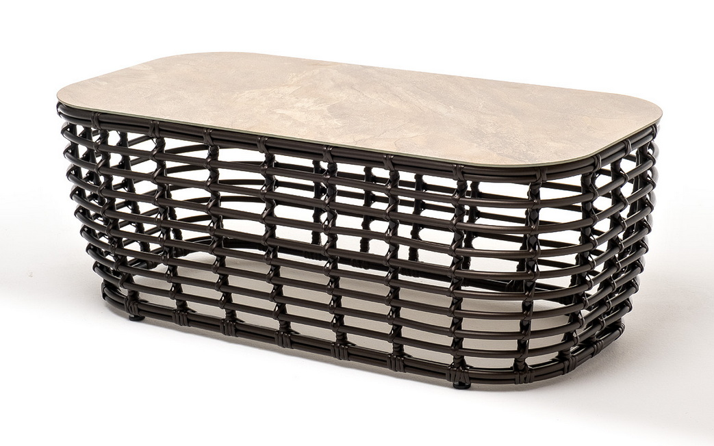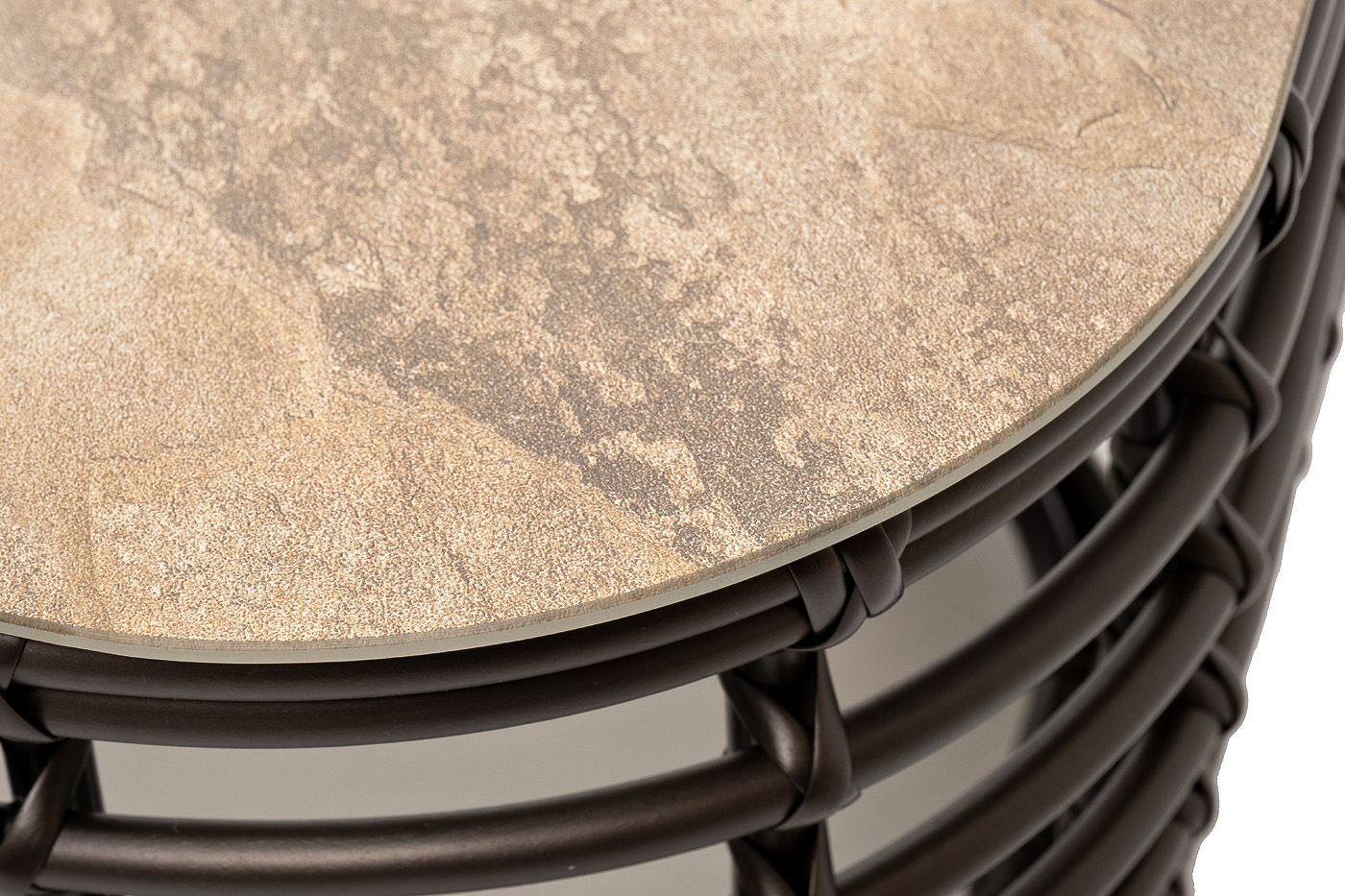 Каркас столика изготовлен из алюминия, вручную оплетенного круглым искусственным ротангом.