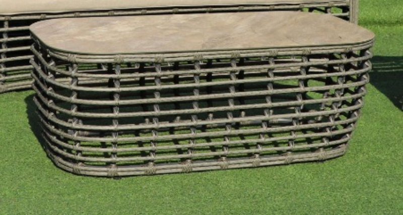 Каркас столика изготовлен из алюминия, вручную оплетенного круглым искусственным ротангом.