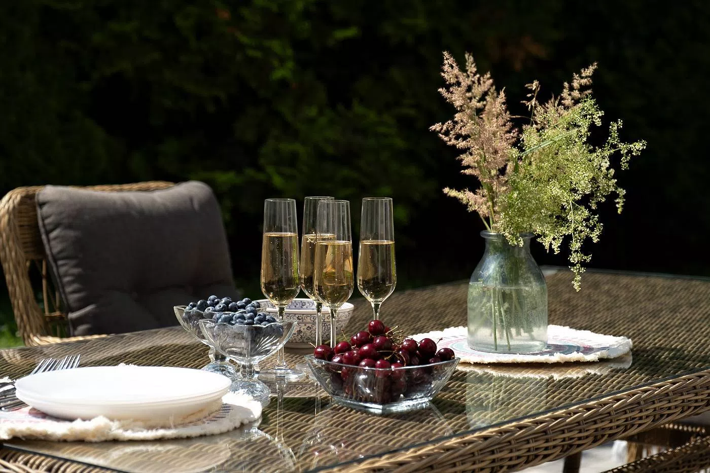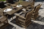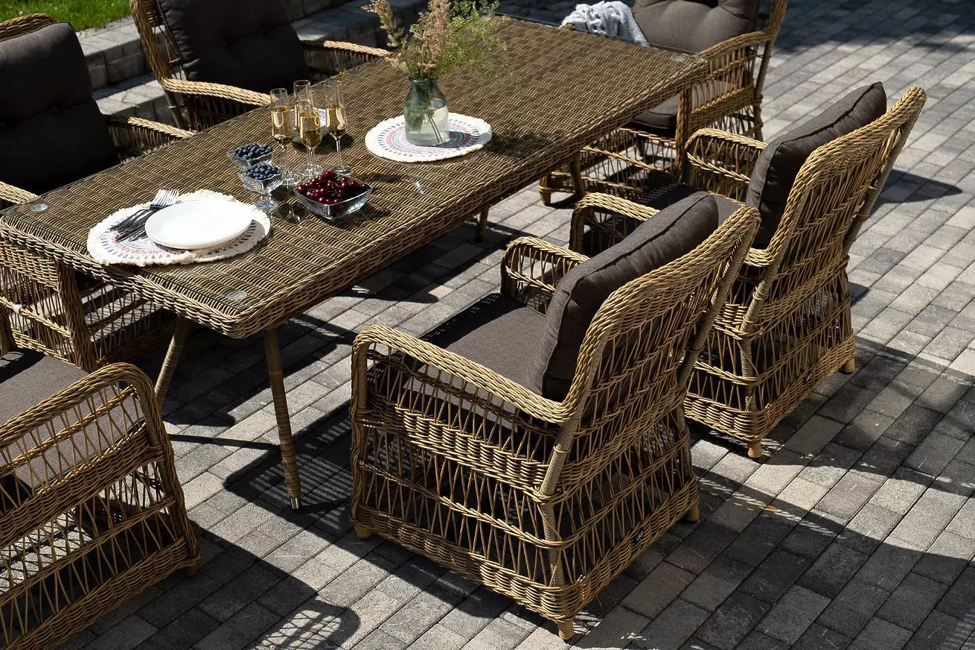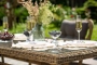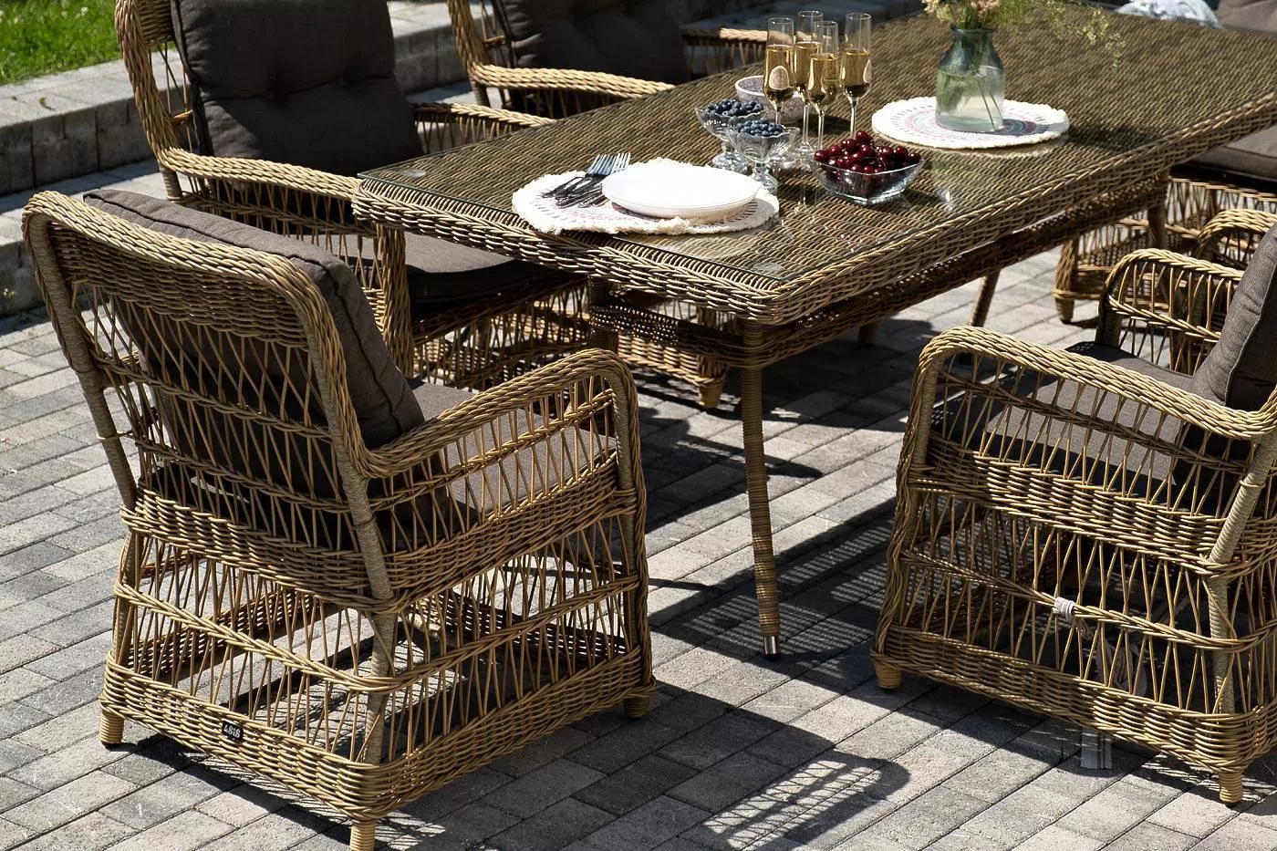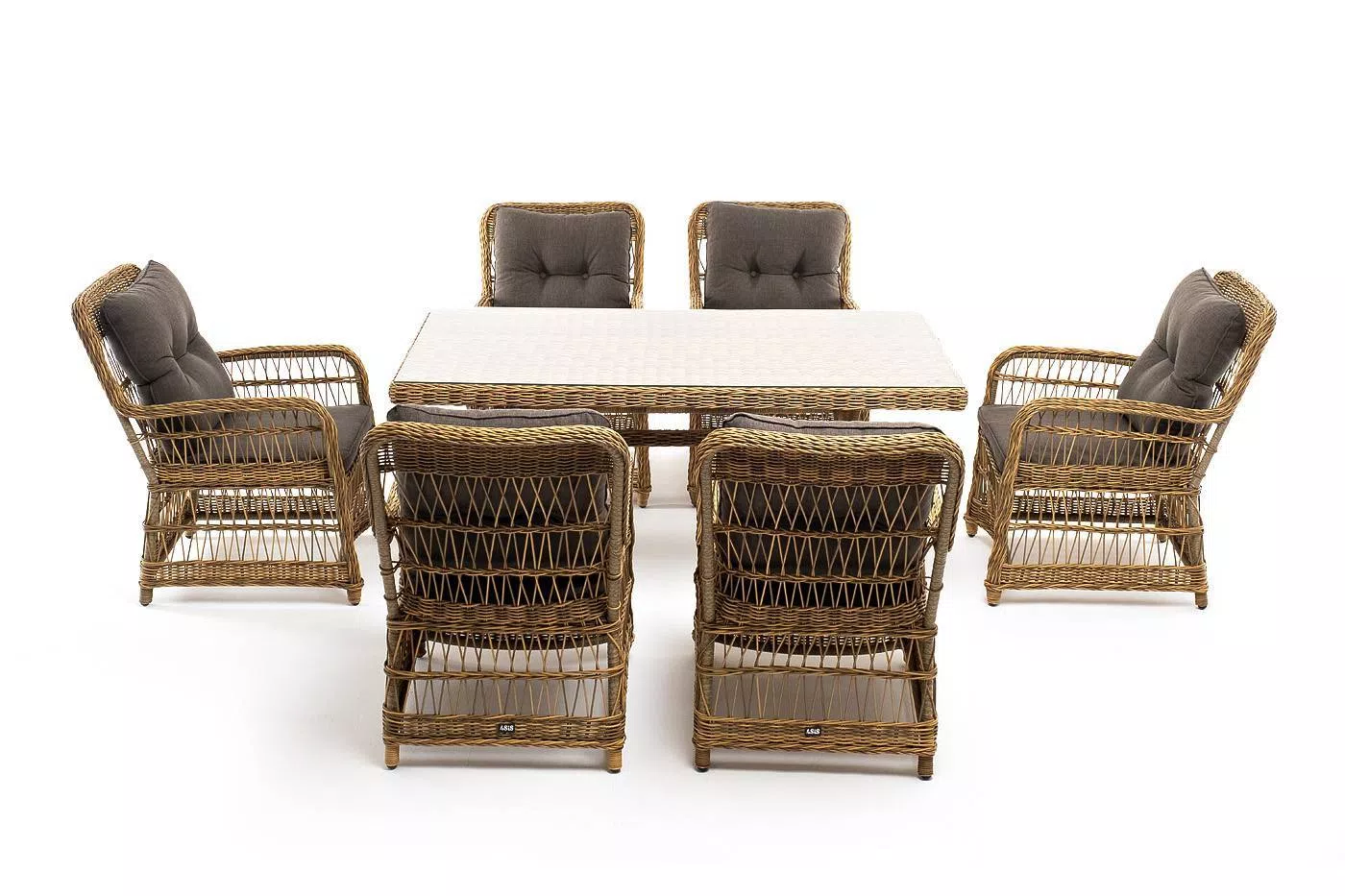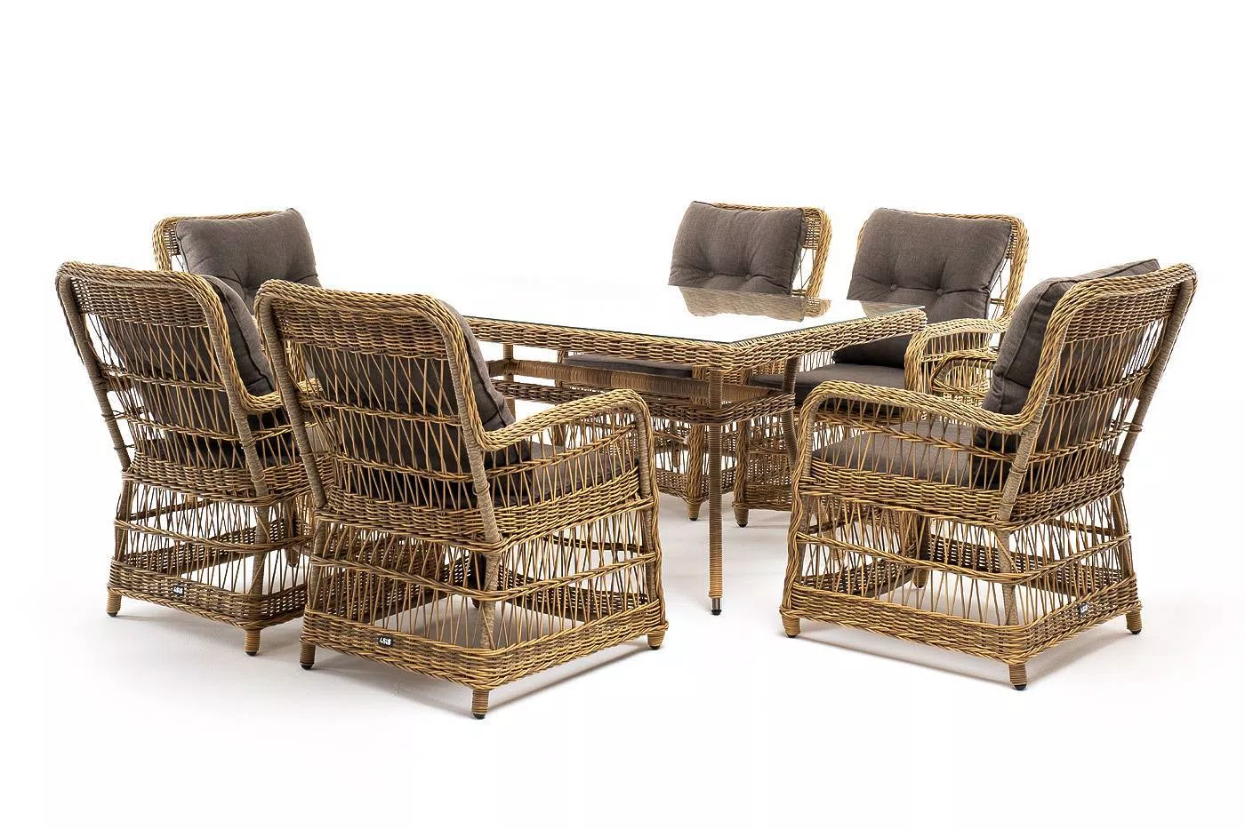 Вся мебель изготовлена из алюминия, вручную оплетенного круглым искусственным ротангом натурального соломенного оттенка. Столешница укомплектована ударопрочным стеклом, толщиной 5 мм. Данное стекло крепится к столу при помощи четырех вакуумных силиконовых присосок и поставляется в собранном виде.